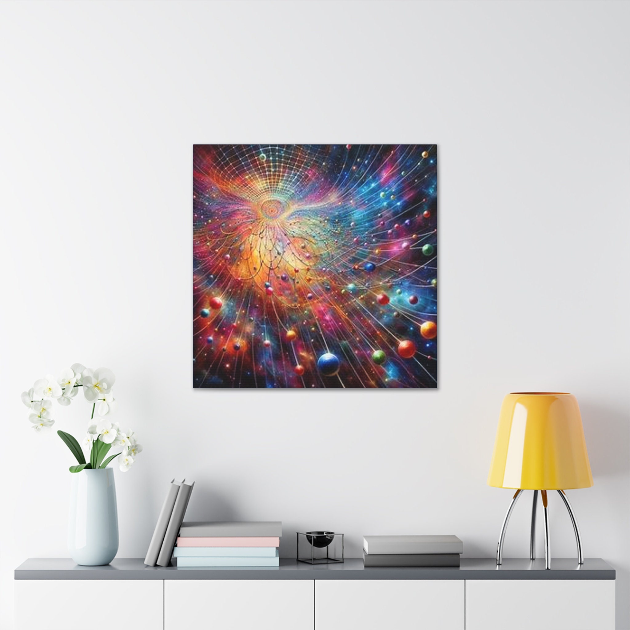 Introducing our mesmerizing canvas art piece, "Indra's Net Illumination," a sublime embodiment of interconnectedness and enlightenment. Inspired by the ancient Buddhist concept of "Indra's Net," this artwork beautifully captures the intricate interconnectedness of all existence.