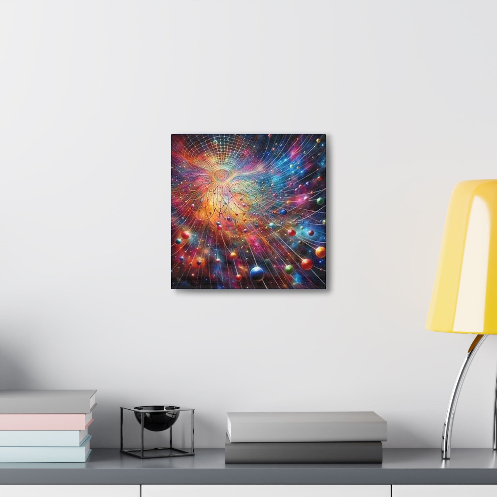 At its core, "Indra's Net" symbolizes a vast, cosmic web where every node represents an individual entity, reflecting and refracting the light of consciousness. In this interpretation, our canvas art piece portrays a celestial tapestry woven with shimmering threads of light, each node representing a unique element of the universe.