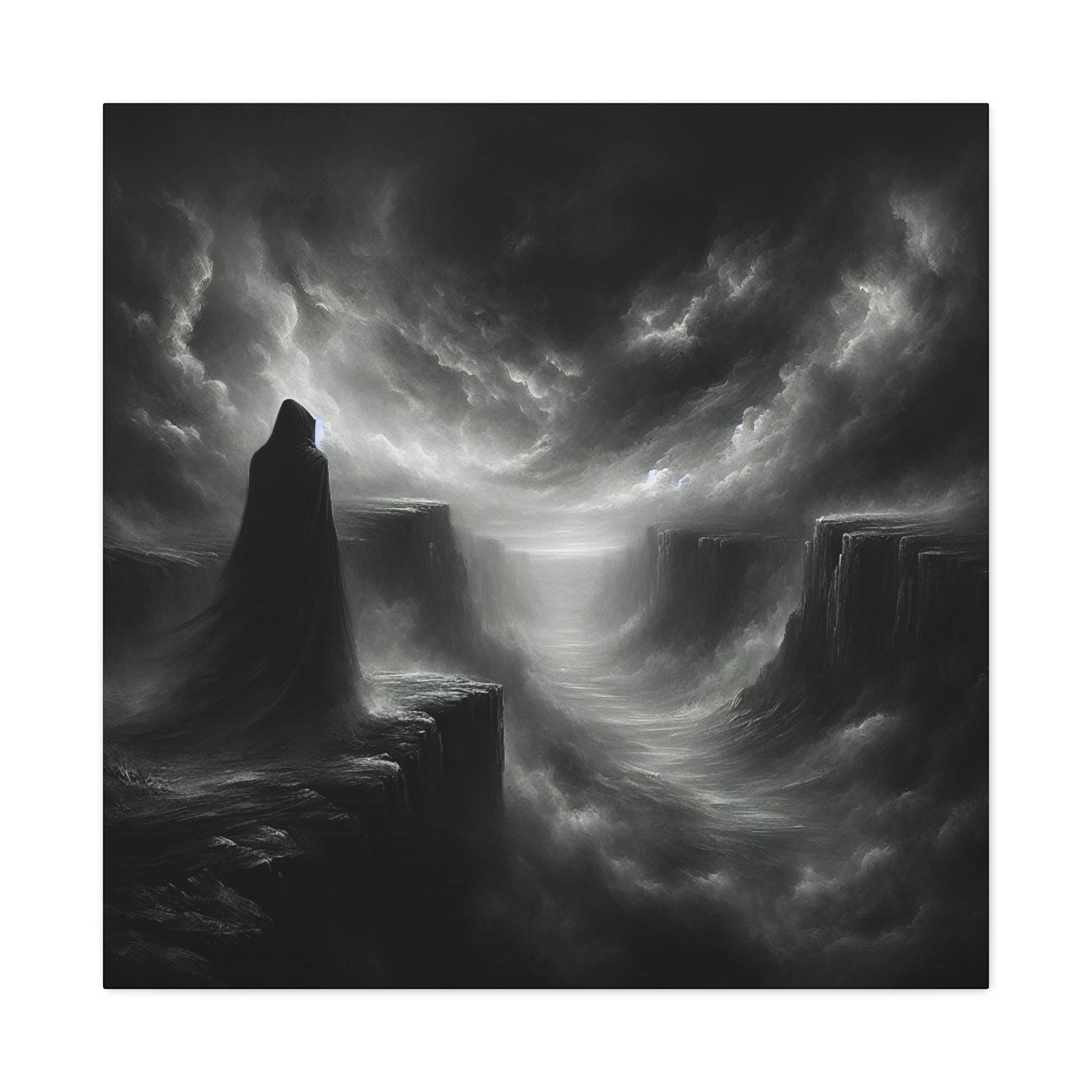 In this mesmerizing canvas art piece, the artist delves into the profound depths of the human psyche, capturing the essence of "the dark night of the soul" with haunting beauty and raw emotion. The canvas is awash in a spectrum of deep, velvety hues, primarily shades of midnight blues, charcoal grays, and ebony blacks, which seem to swirl and merge like turbulent storm clouds in an ominous sky.