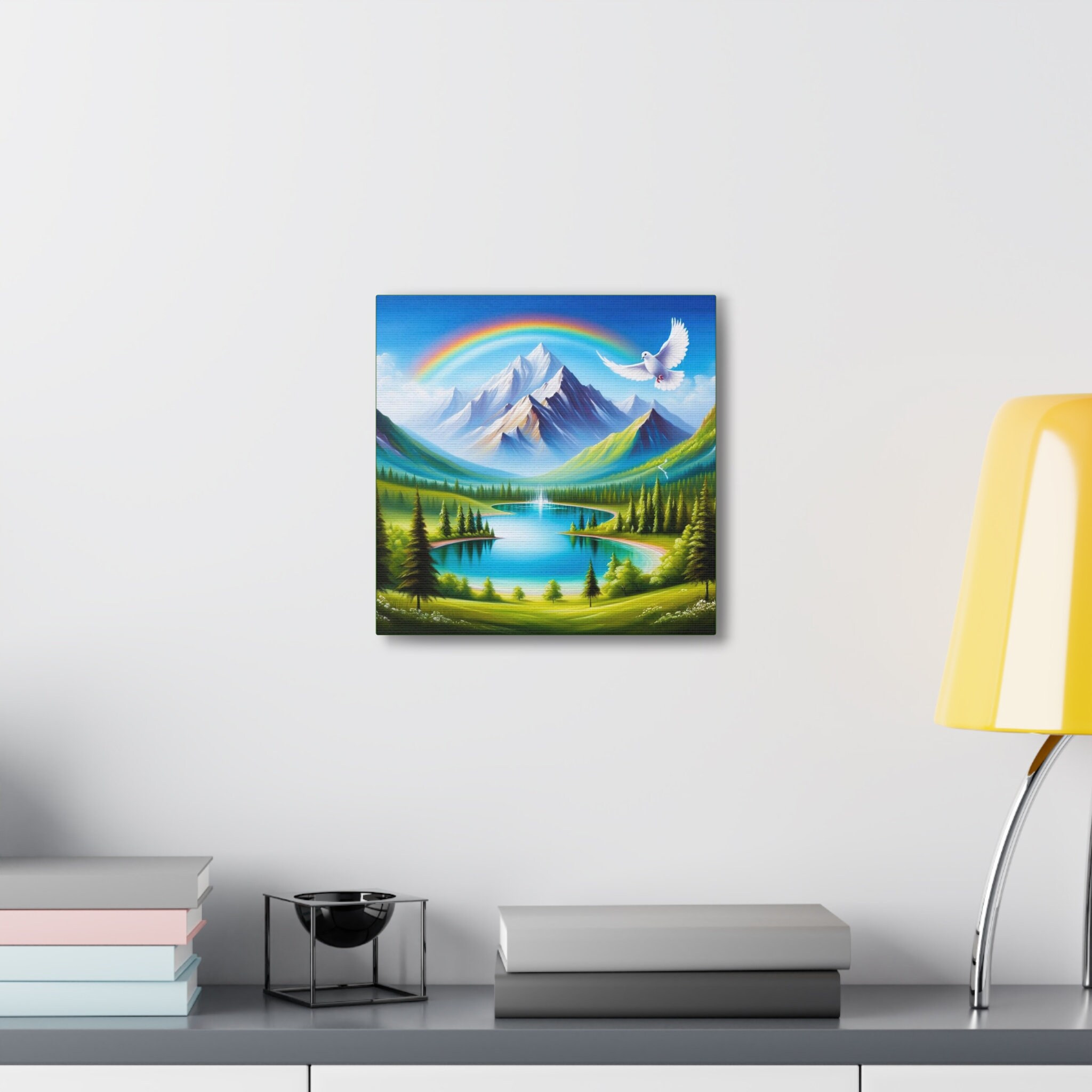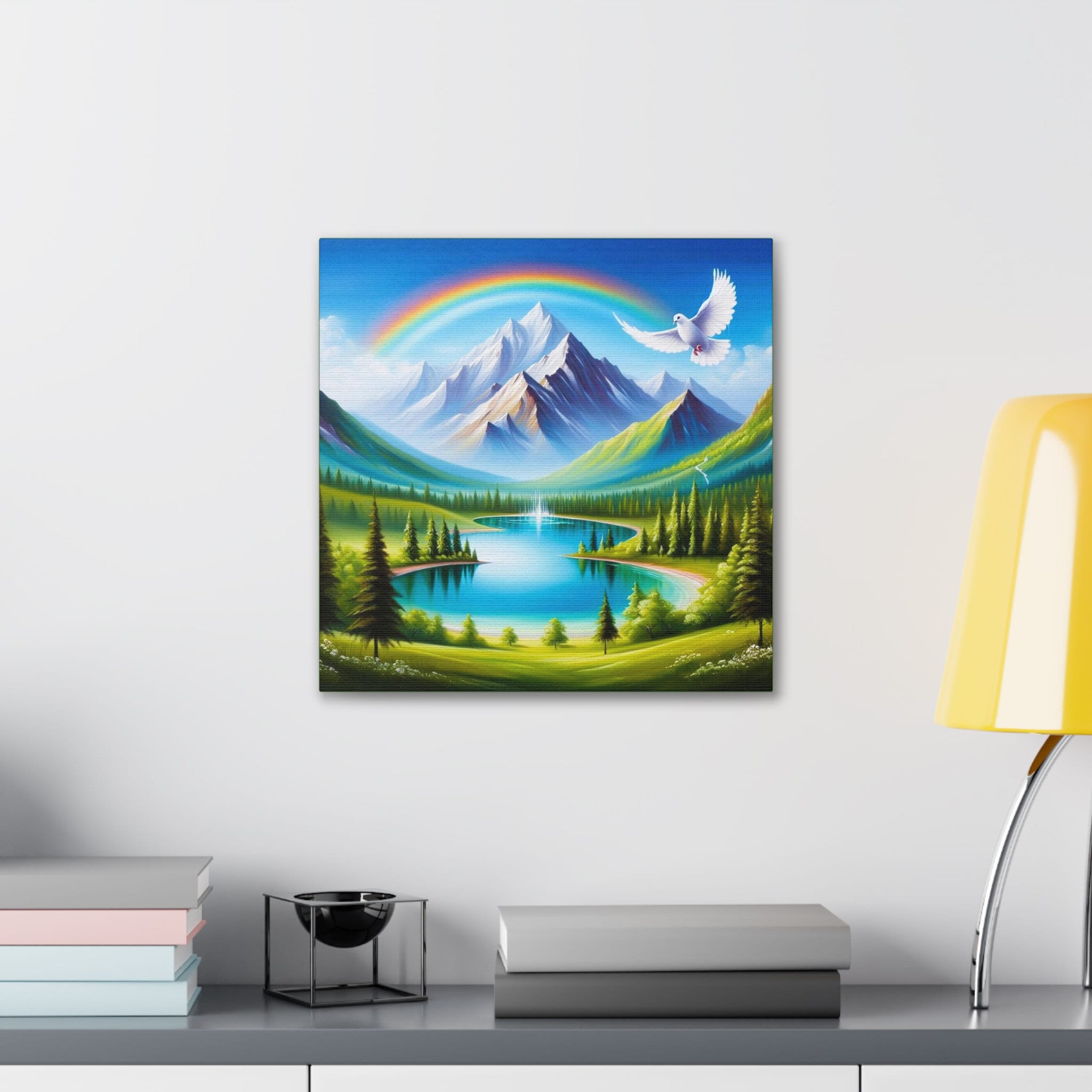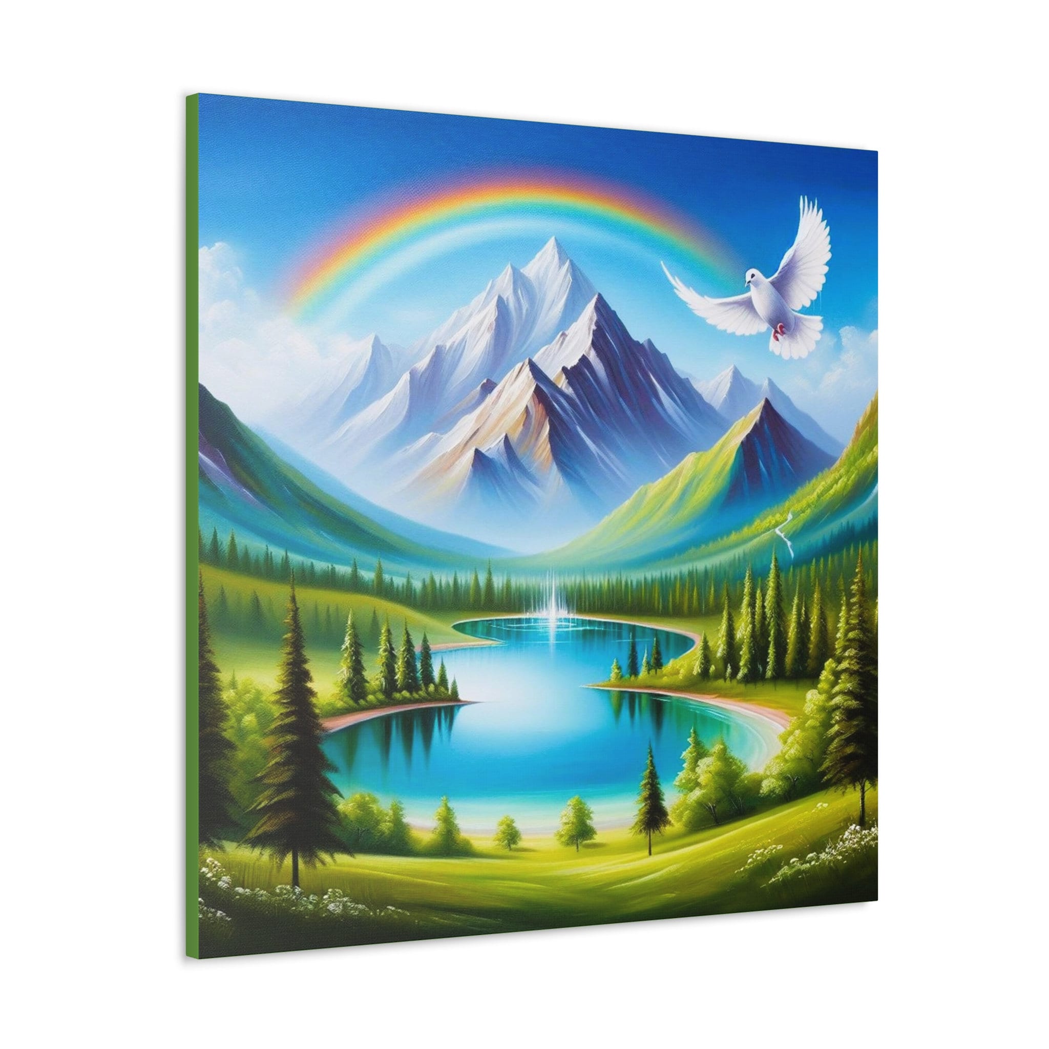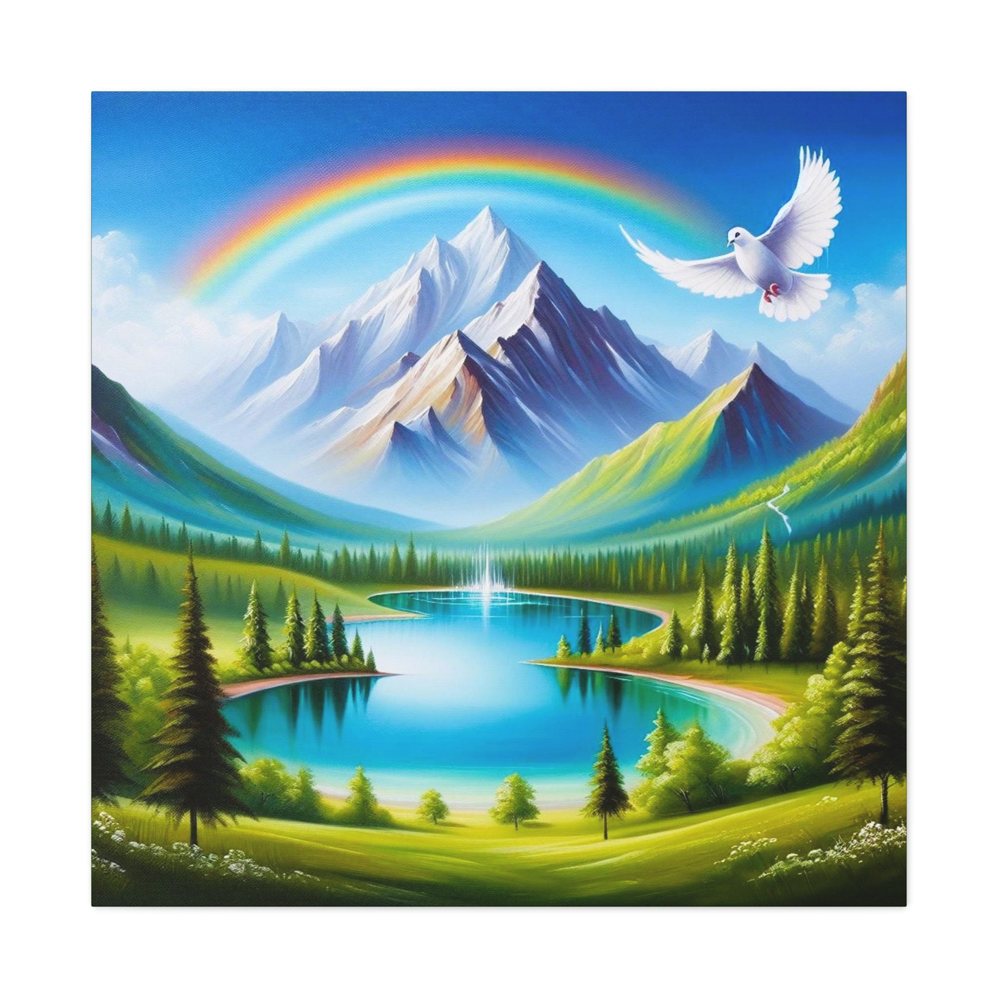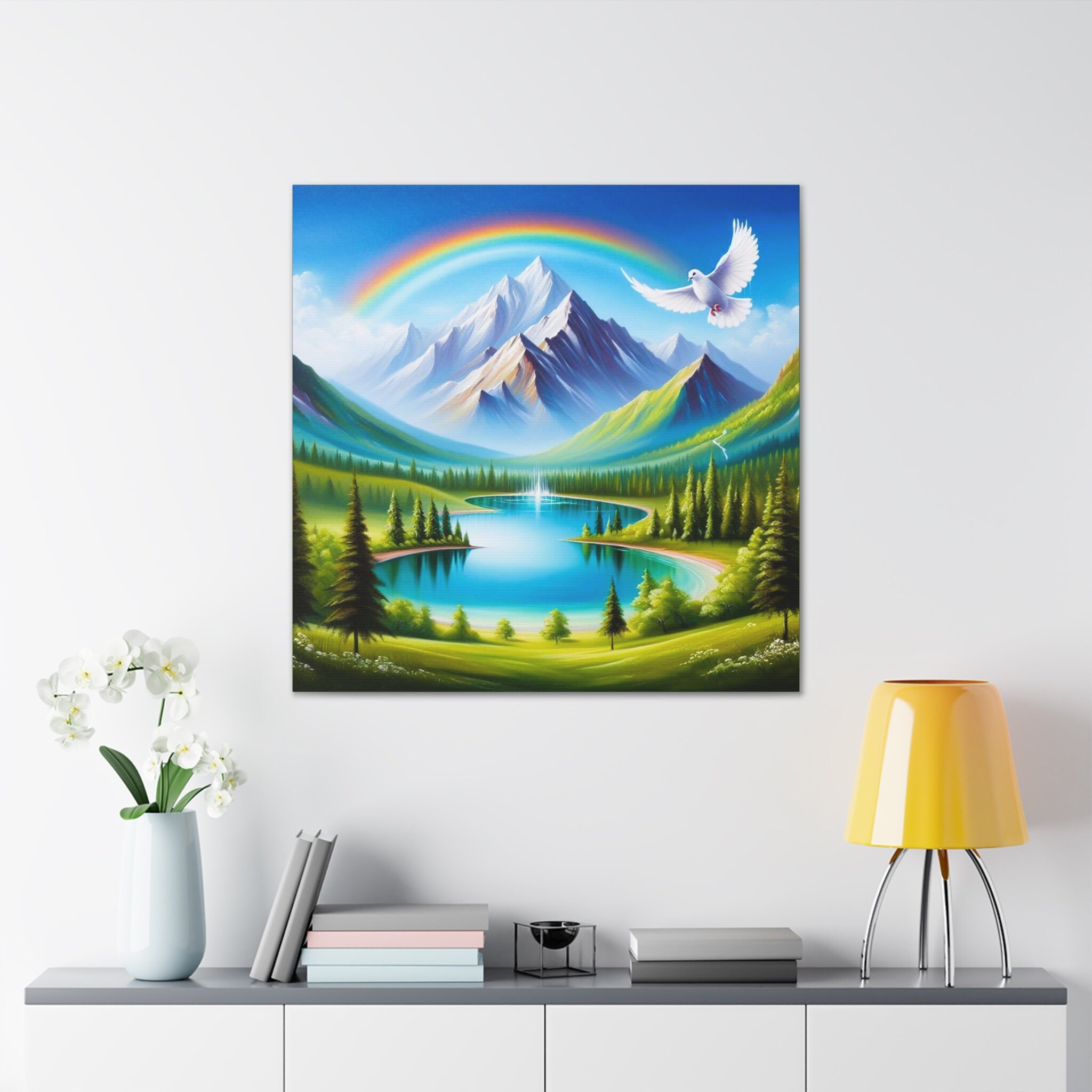 Mountain Lake Canvas Art: Rainbow, Dove, Serene Landscape