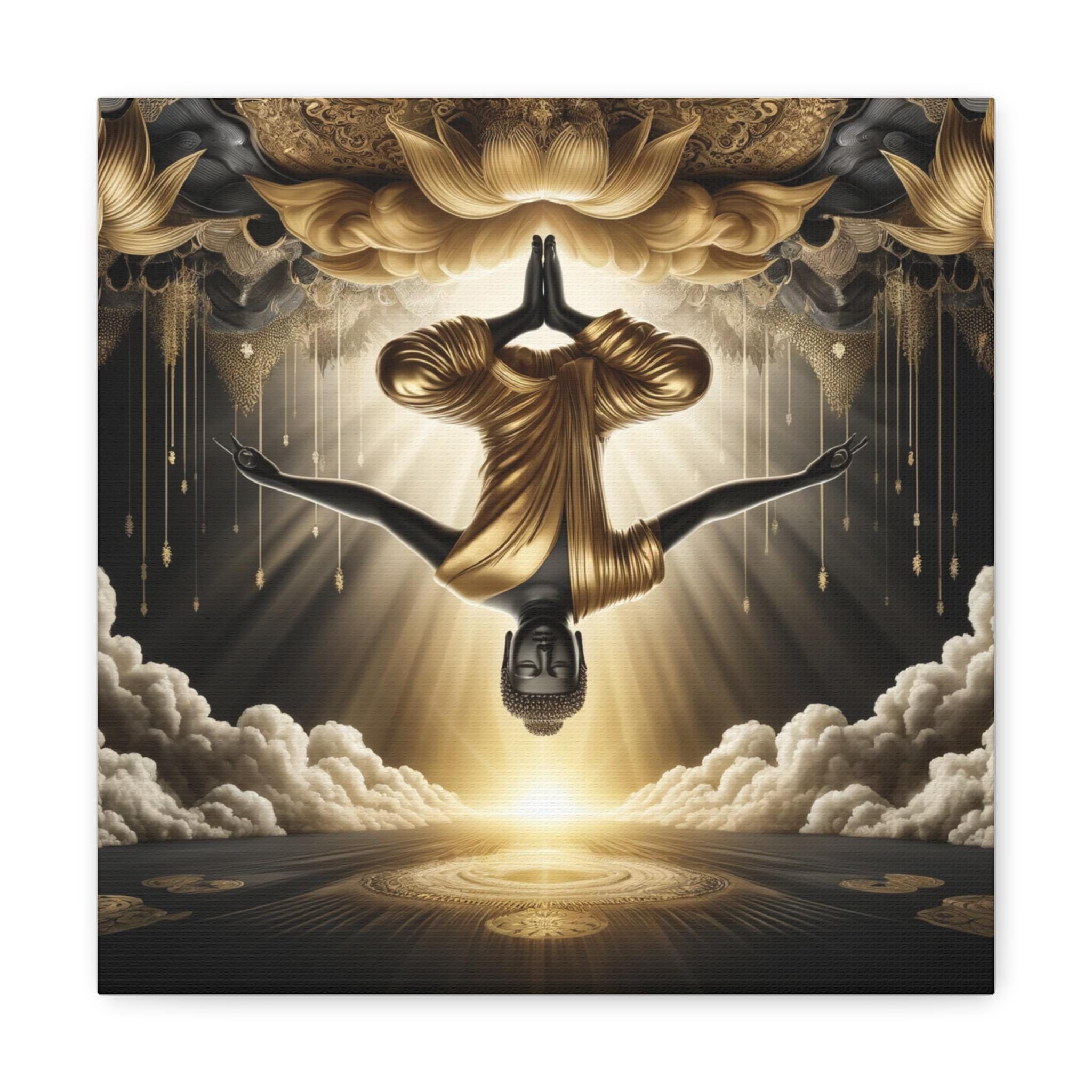 This evocative canvas art piece features an inverted Buddha in an outstretched pose, practicing Dzogchen meditation. The Buddha's serene face, with eyes gently closed, exudes deep tranquility and enlightenment. His body, gracefully inverted, stretches out with arms extended and palms open, embodying the release and acceptance central to Dzogchen meditation. His flowing clothing, depicted in soft, ethereal white and golden hues, cascade gently downward, adding a sense of fluid motion and harmony.