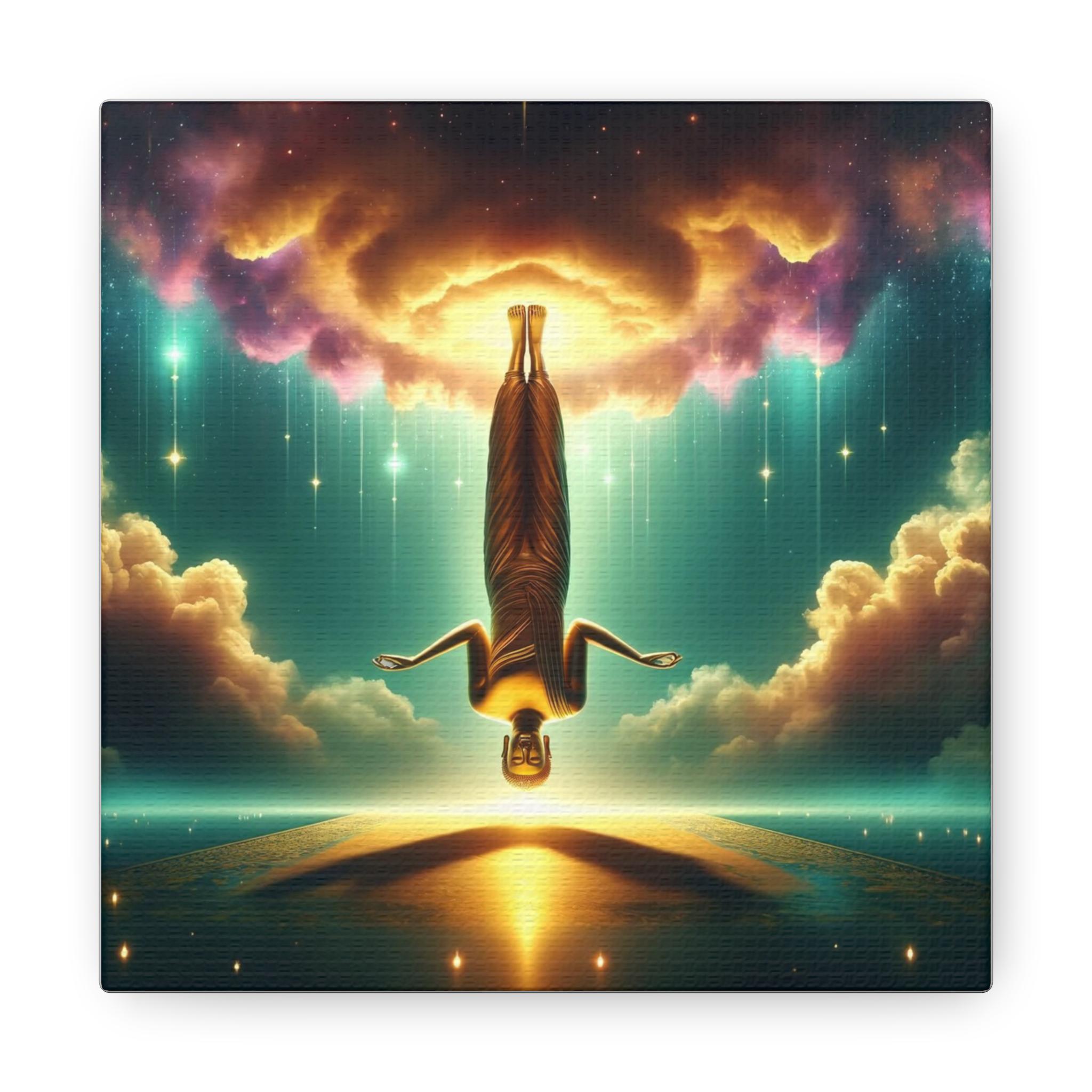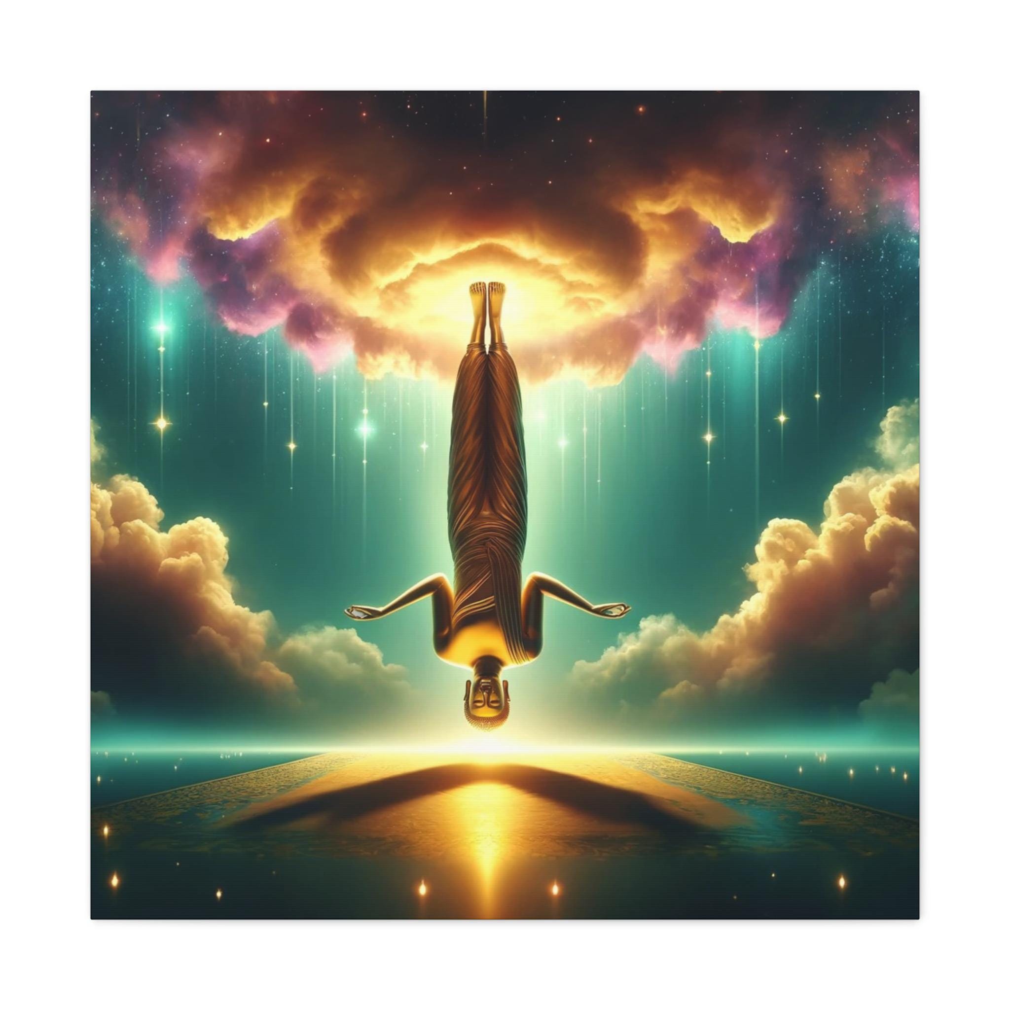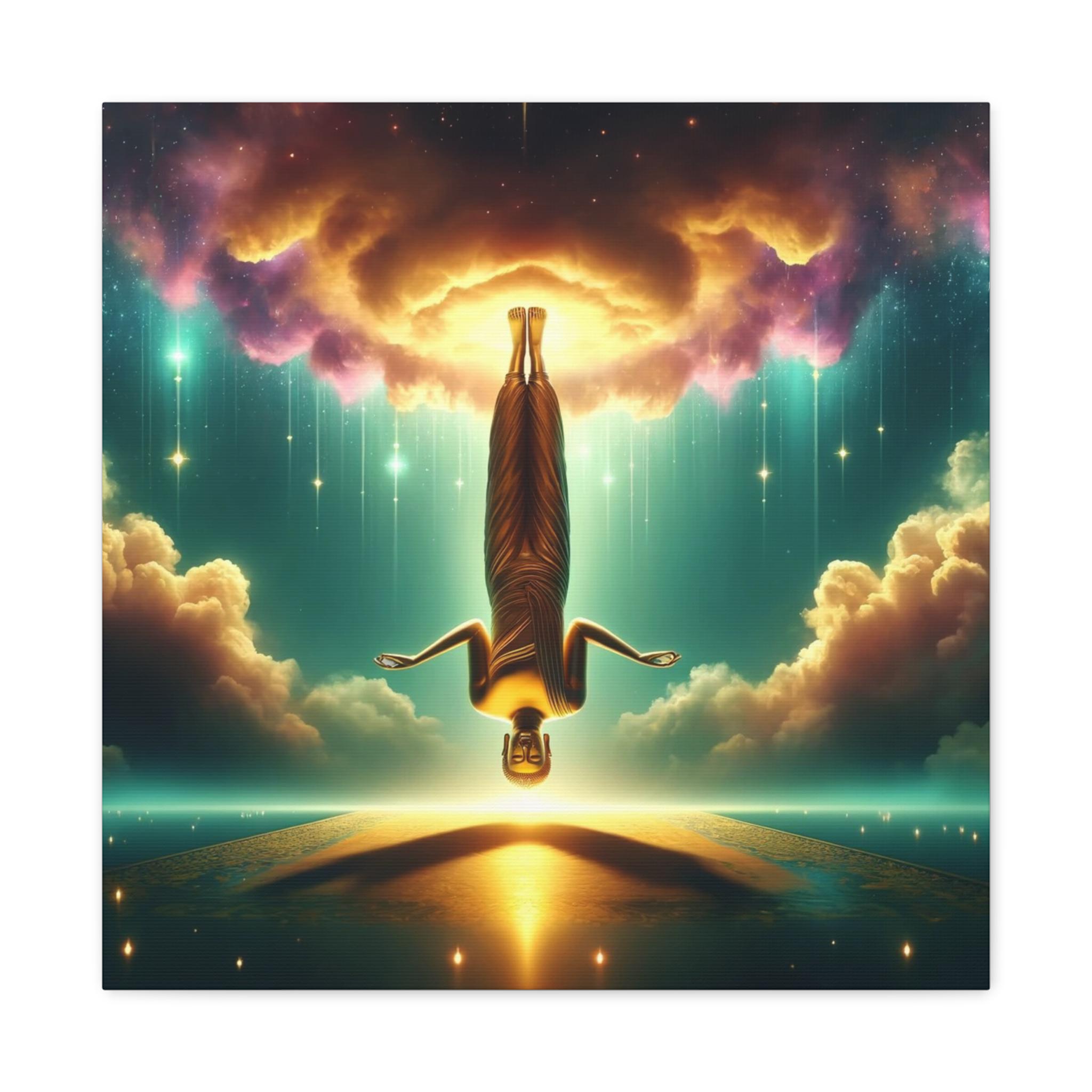 This evocative canvas art piece features an inverted Buddha in an outstretched pose, practicing Dzogchen meditation. The Buddha's serene face, with eyes gently closed, exudes deep tranquility and enlightenment. His body, gracefully inverted, stretches out with arms extended and palms open, embodying the release and acceptance central to Dzogchen meditation. His flowing clothing, depicted in soft, ethereal white and golden hues, cascade gently downward, adding a sense of fluid motion and harmony.