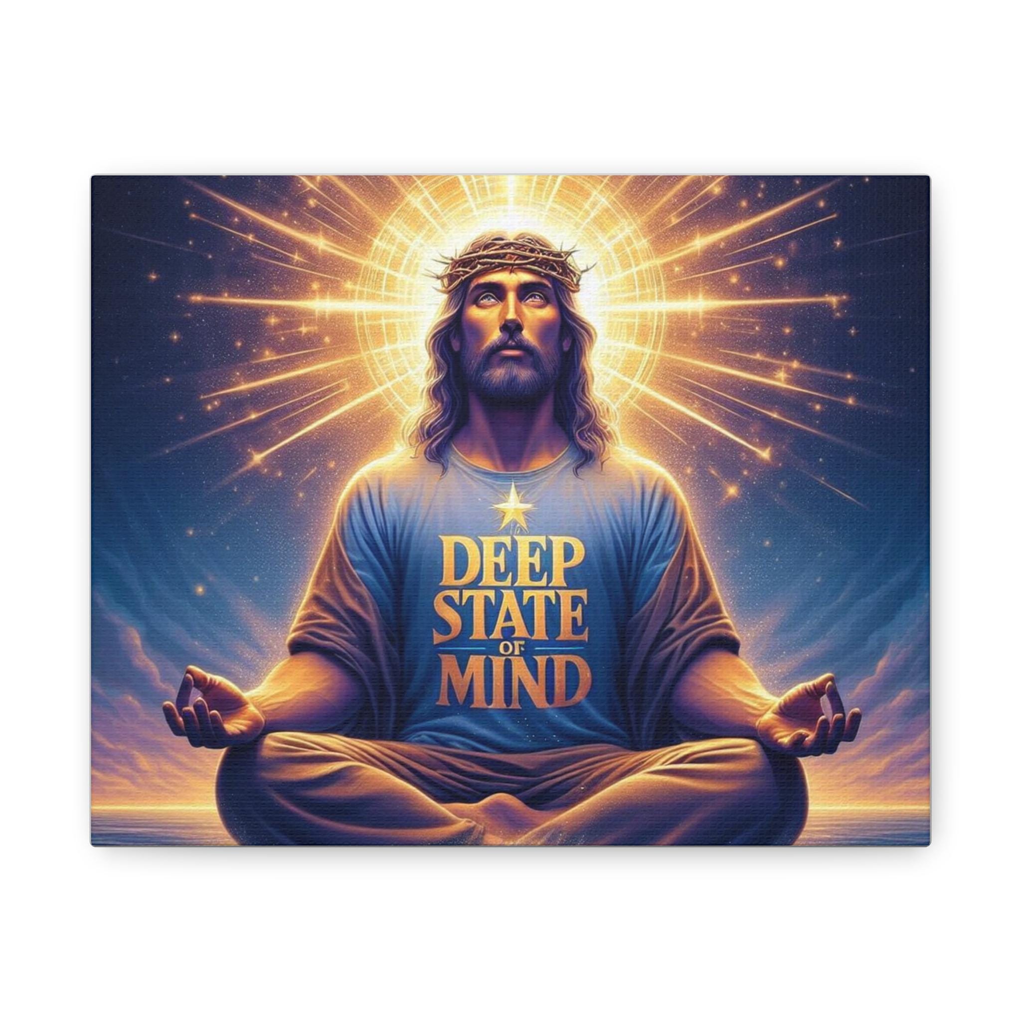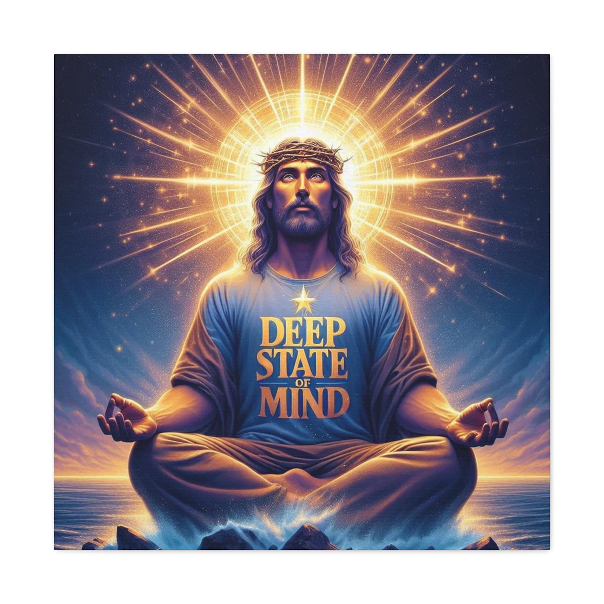 Adding a modern touch to this timeless figure, Jesus is portrayed wearing a shirt that boldly states "Deep State of Mind," bridging the ancient spiritual essence with contemporary mindfulness. The intricate details and vibrant colors make this artwork a captivating centerpiece, perfect for any room seeking a blend of spirituality and modernity.