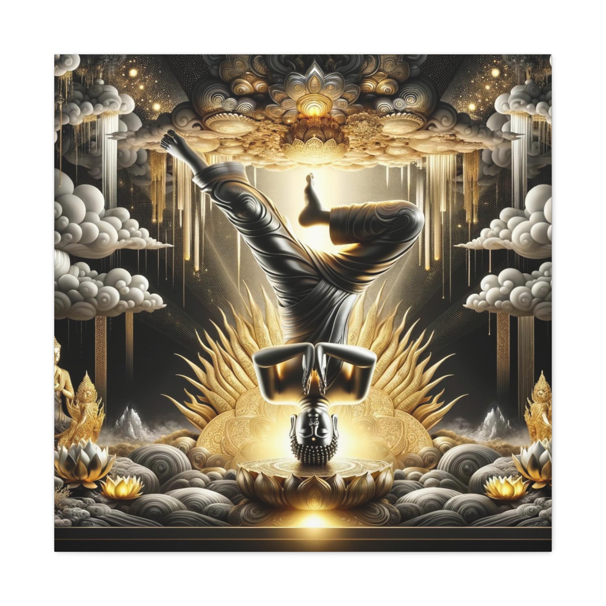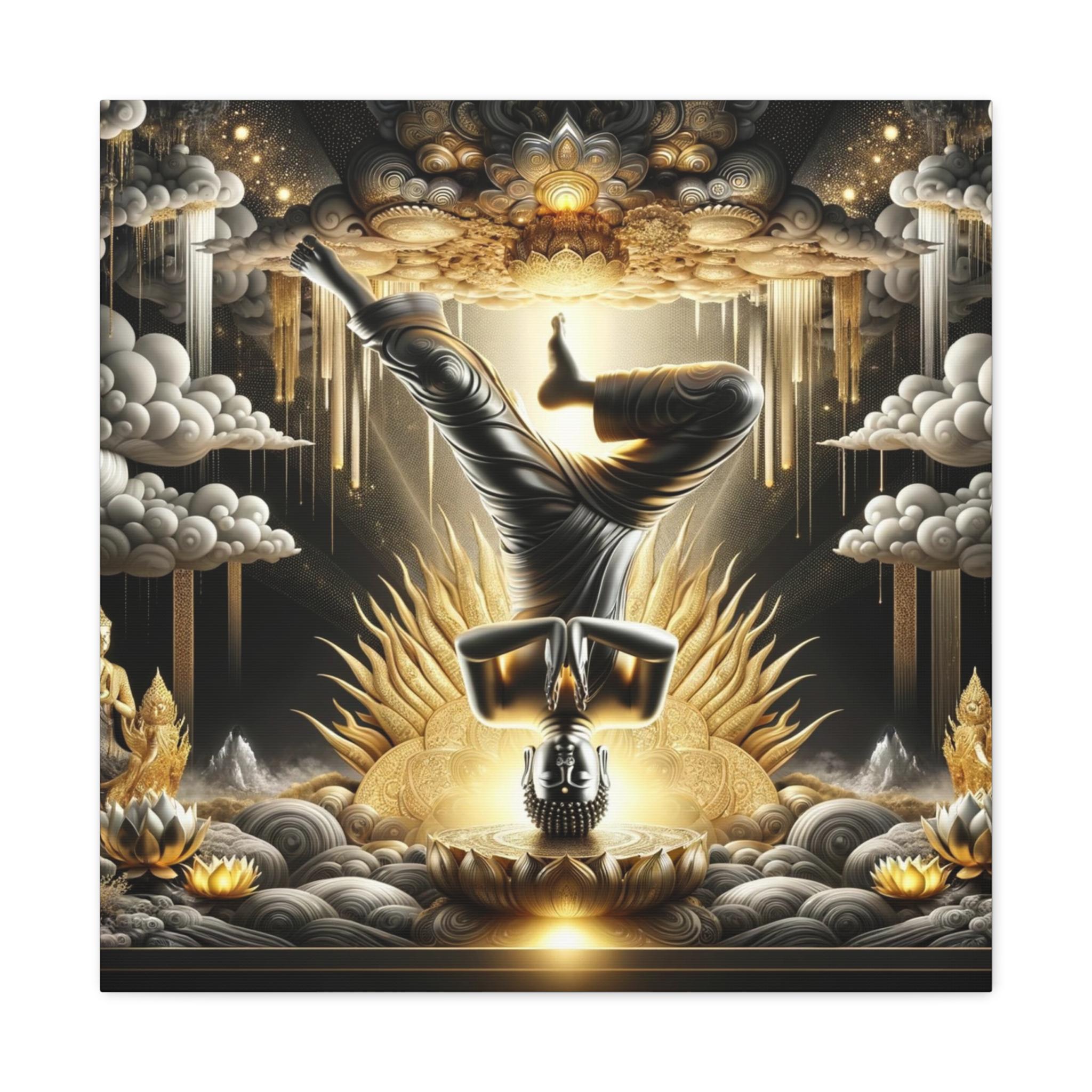 This evocative canvas art piece features an inverted Buddha in an outstretched pose, practicing Dzogchen meditation. The Buddha's serene face, with eyes gently closed, exudes deep tranquility and enlightenment. His body, gracefully inverted, stretches out with arms extended and palms open, embodying the release and acceptance central to Dzogchen meditation. His flowing robes, depicted in soft, ethereal white and golden hues, cascade gently downward, adding a sense of fluid motion and harmony.