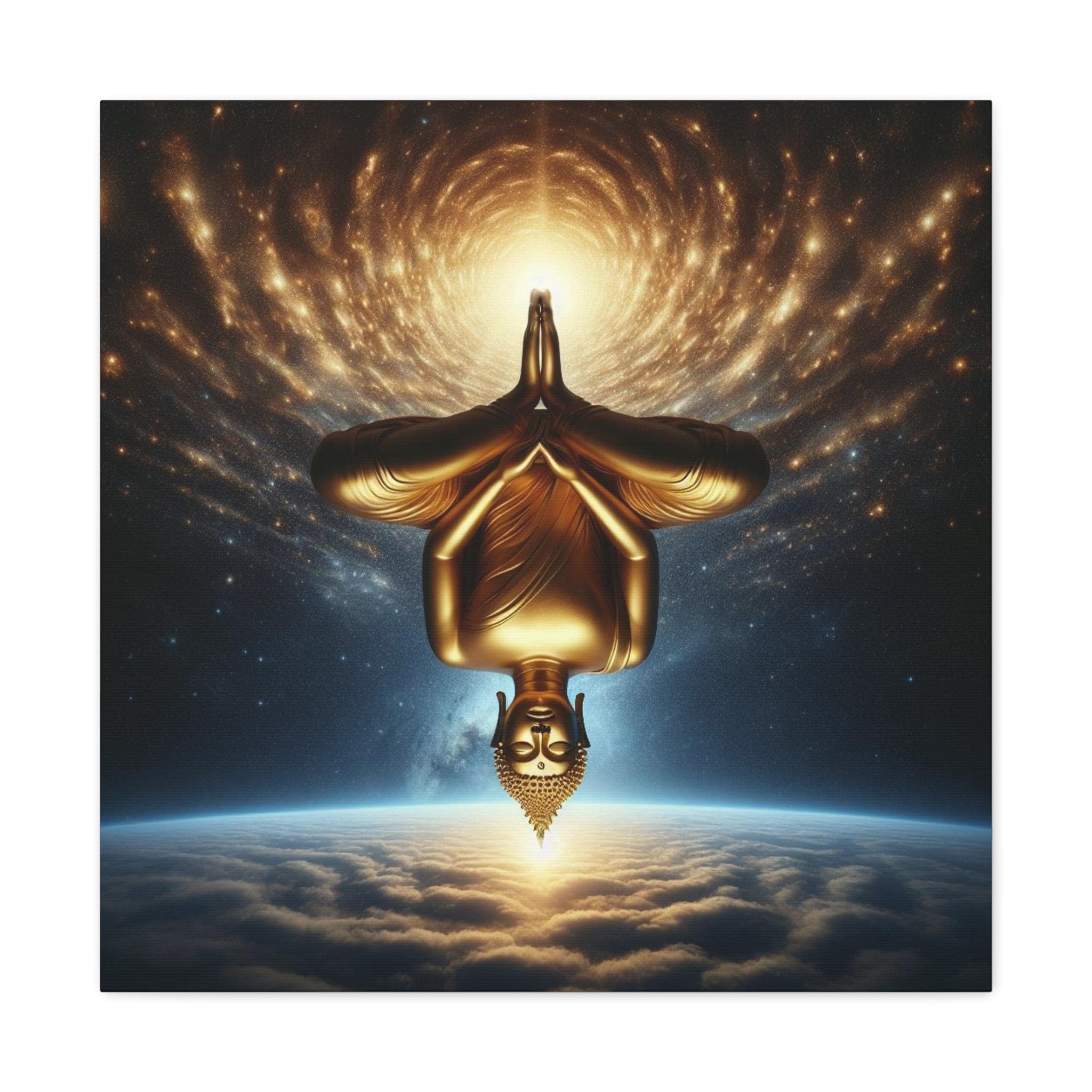 This evocative canvas art piece features an inverted Buddha in a seated pose, practicing Dzogchen meditation. The Buddha's serene face, with eyes gently closed, exudes deep tranquility and enlightenment. His body, gracefully inverted, embodying the release and acceptance central to Dzogchen meditation.