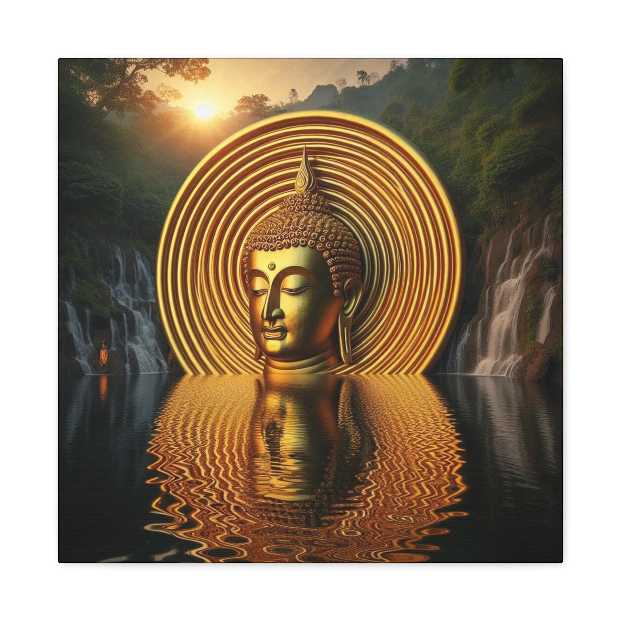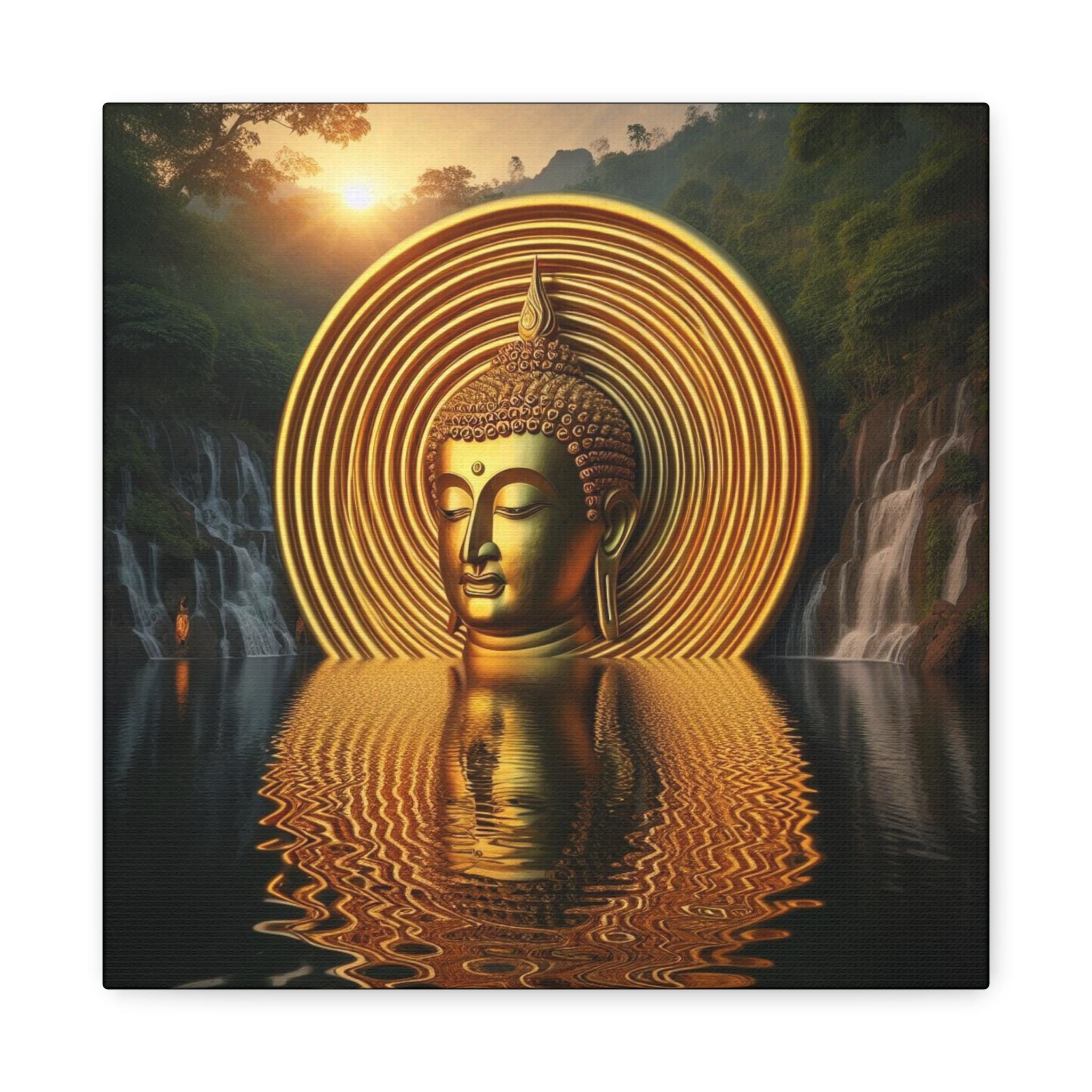 Immerse yourself in the luminous presence of the Golden Buddha Sacred Art, a mesmerizing portrayal of serenity, wisdom, and divine radiance. This captivating artwork features a golden Buddha head emerging from tranquil waters, encircled by concentric halos of glowing light, symbolizing spiritual awakening, boundless energy, and the infinite nature of awareness.