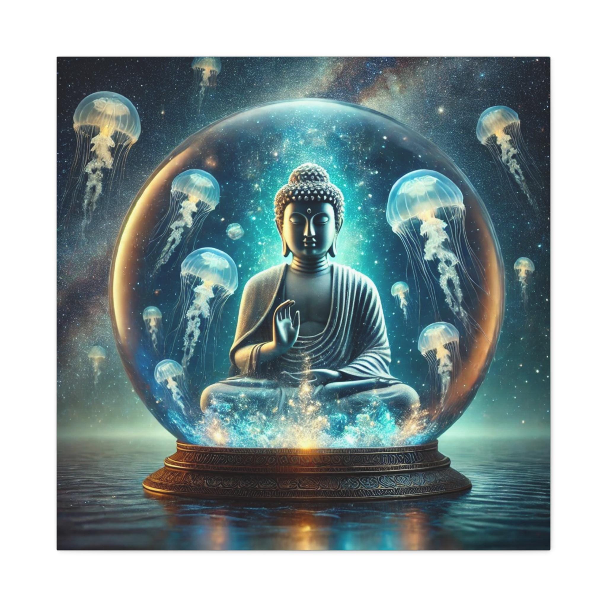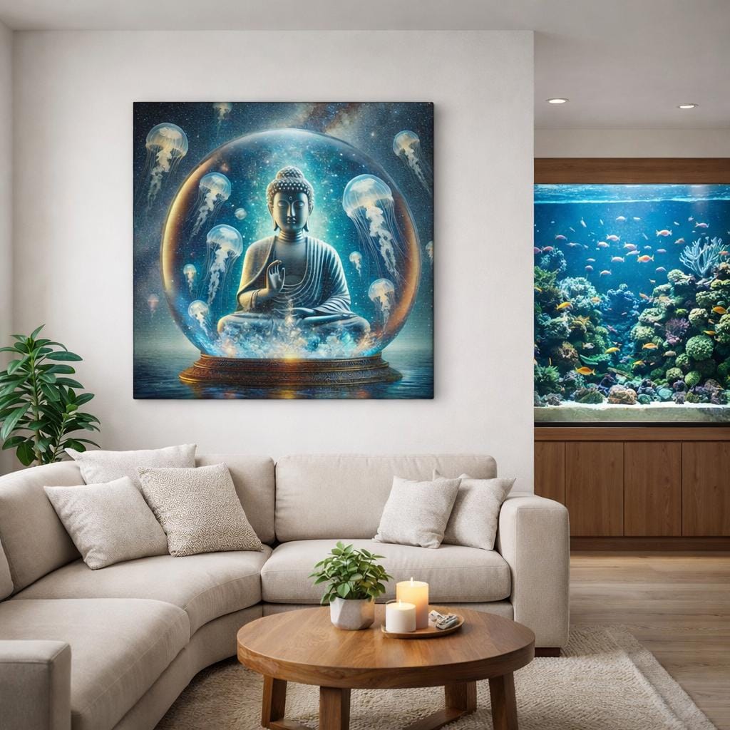 Immerse yourself in the serene beauty of Lotus Sphere Buddha, a breathtaking canvas print that captures the essence of tranquility and spiritual awakening. This ethereal artwork depicts a meditating Buddha gracefully encased in a crystal-clear, lotus-shaped water sphere, surrounded by golden koi fish gliding effortlessly. Their gentle movements create sacred geometric ripples, symbolizing the flow of energy and harmony in the universe.