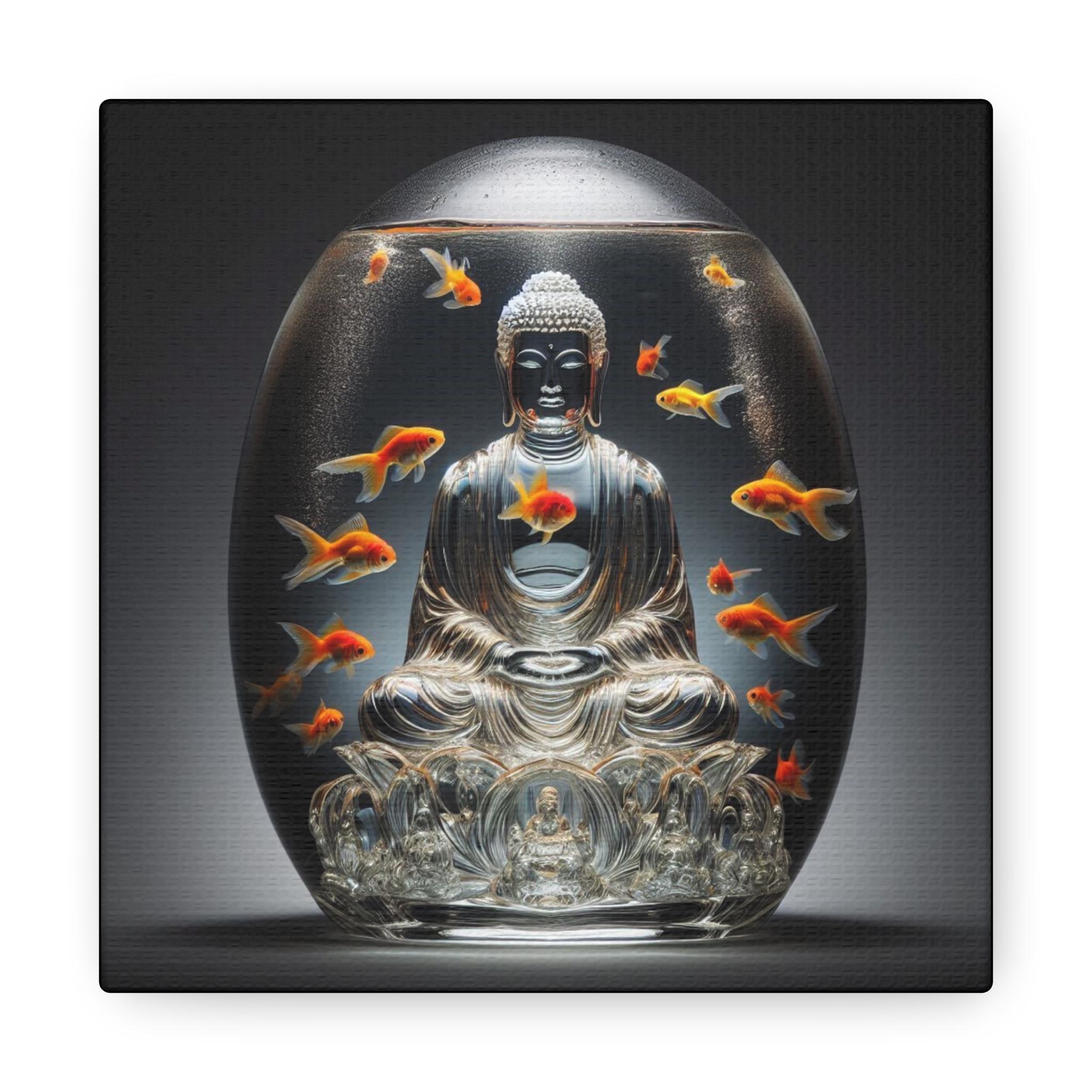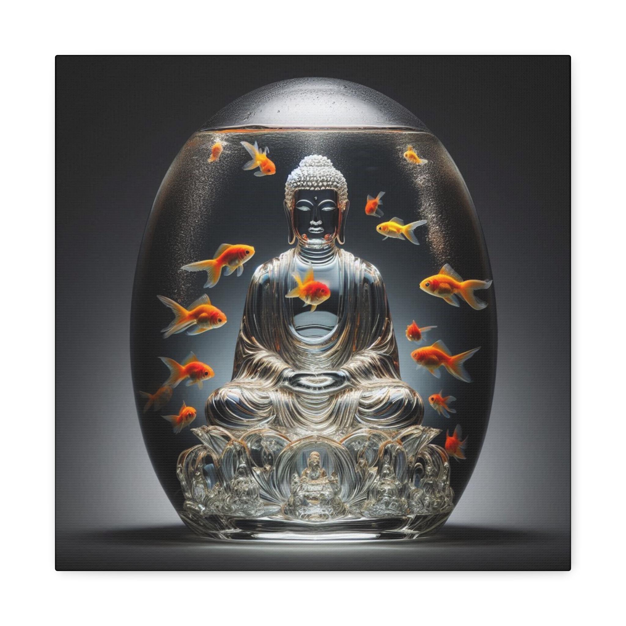Immerse yourself in the serene beauty of Lotus Sphere Buddha, a breathtaking canvas print that captures the essence of tranquility and spiritual awakening. This ethereal artwork depicts a meditating Buddha gracefully encased in a crystal-clear, lotus-shaped water sphere, surrounded by golden koi fish gliding effortlessly. Their gentle movements create sacred geometric ripples, symbolizing the flow of energy and harmony in the universe.
