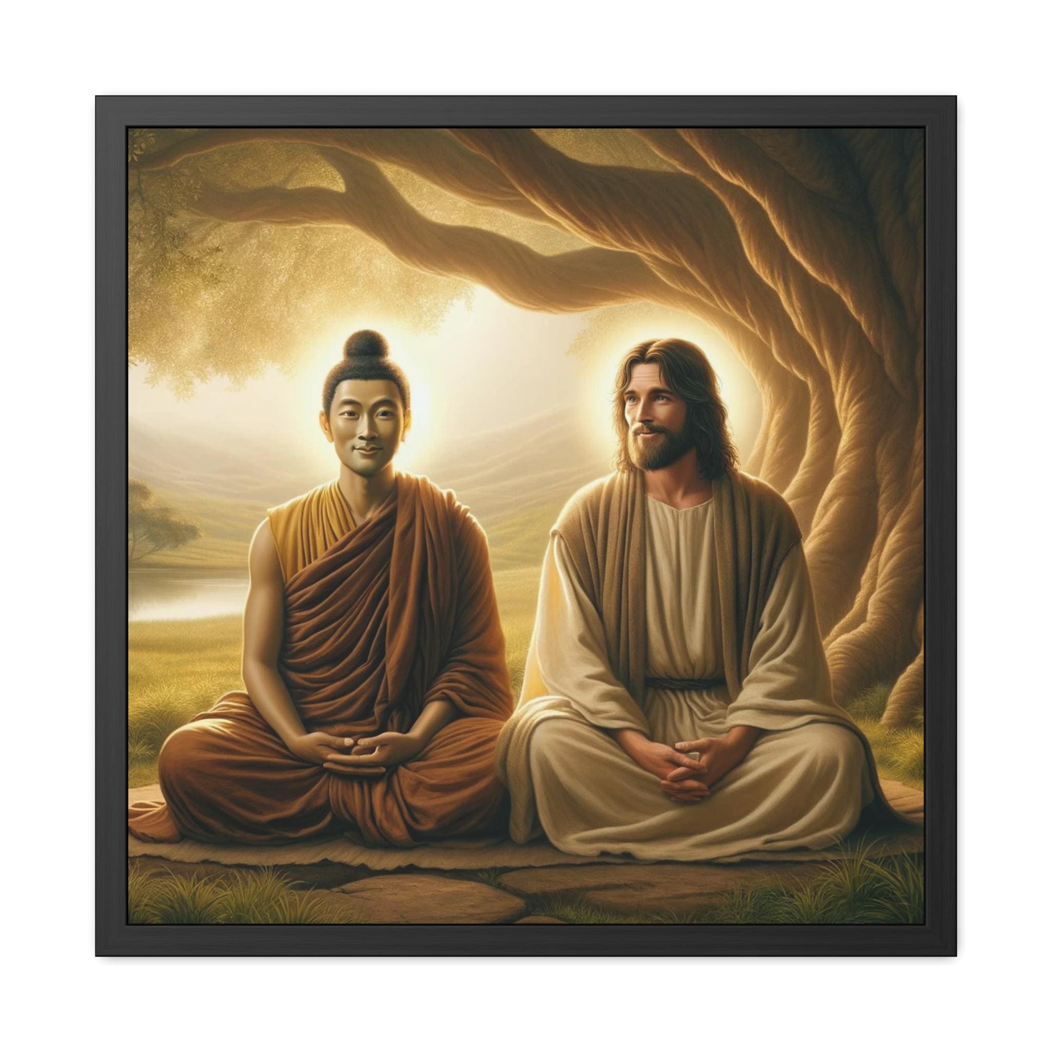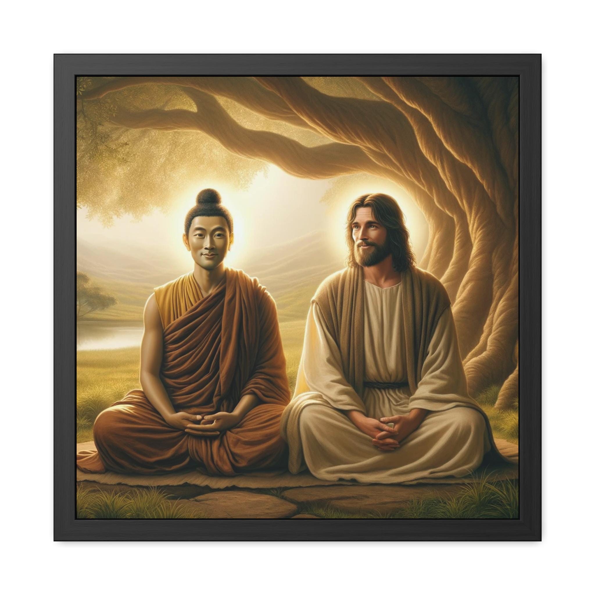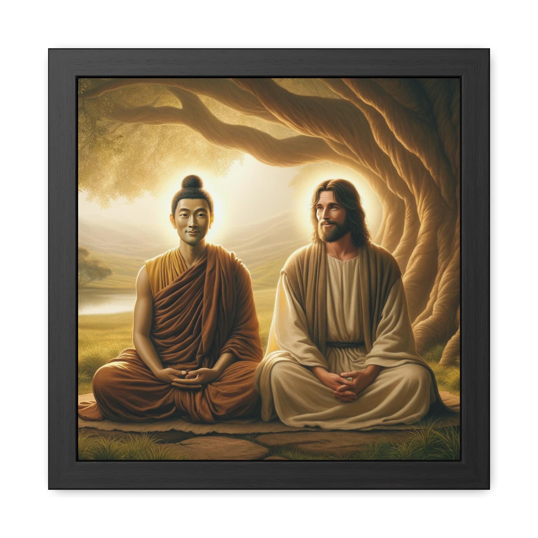 Printed with vibrant detail and offered as a high-quality framed poster, this piece makes a powerful focal point for meditation rooms, yoga studios, healing spaces, or as a meaningful gift for seekers on their spiritual journey. Its soft golden tones and tranquil setting inspire reflection, inner calm, and reverence for the shared essence of enlightenment across traditions.