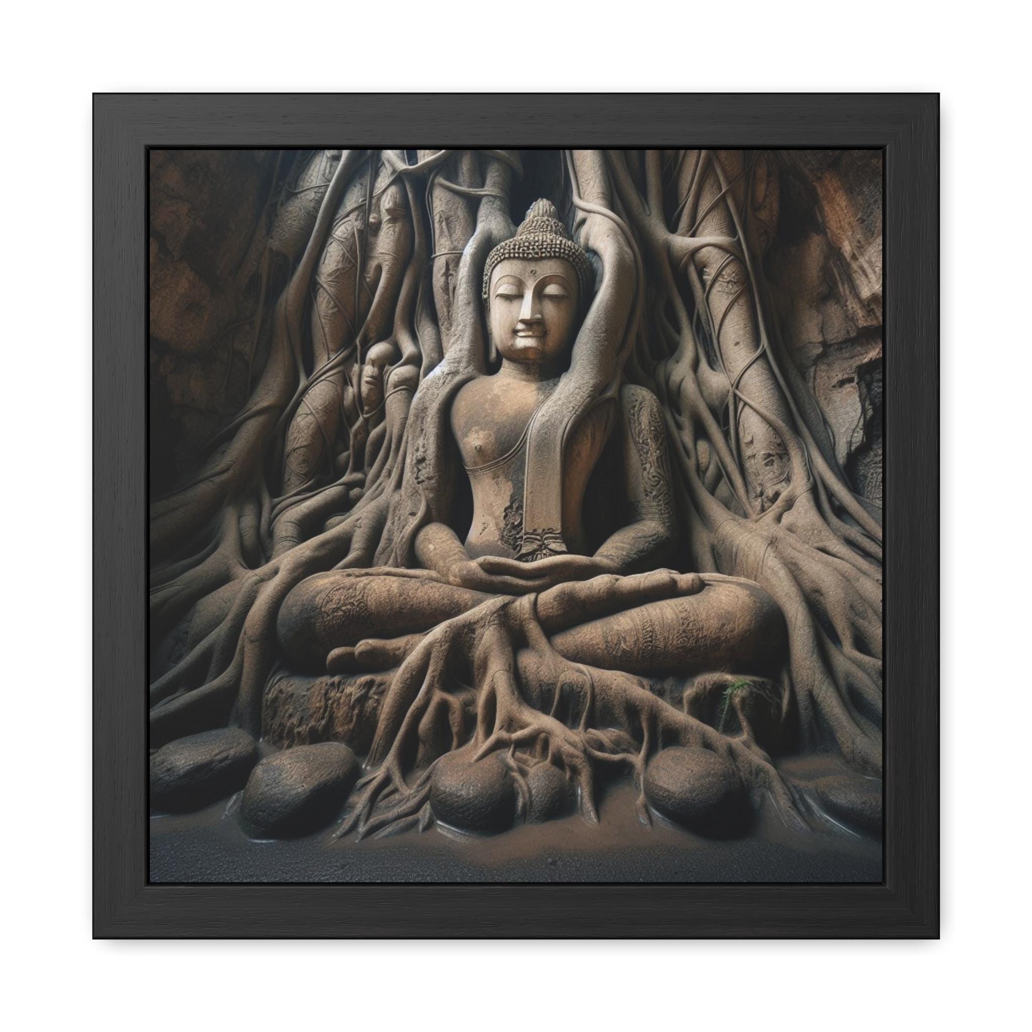 This framed poster portrays a meditating Buddha embraced by the living roots of Pacha Mama, the Earth Mother. The sculpture rests in stillness as the roots of nature intertwine around him, symbolizing the eternal bond between human spirit and the living earth. In this sacred meeting of stone and soil, stillness and growth, we are reminded of our rootedness in the natural world and the transcendence that blossoms from it.