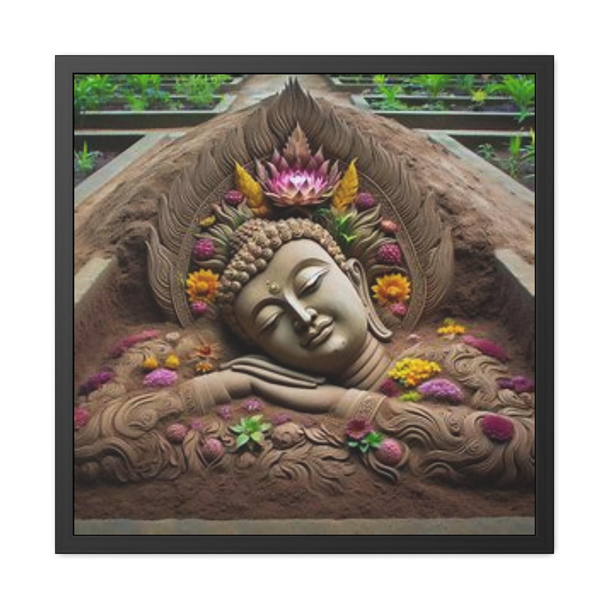 This framed poster portrays the serene image of Buddha resting in dying meditation, embraced by the fertile earth of Pacha Mama, the Great Mother. Surrounded by flowers, lotus blossoms, and sacred patterns of soil, the Buddha’s gentle expression reflects the final release into peace and unity with nature.