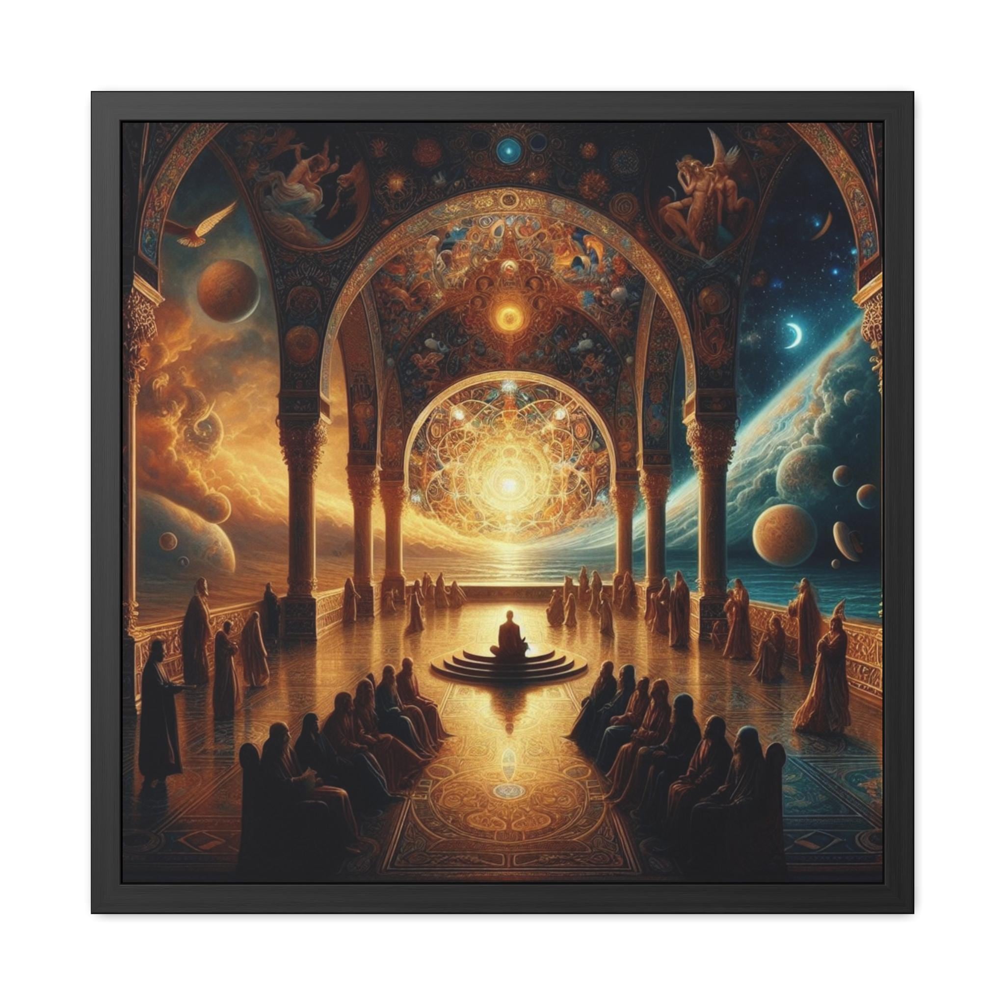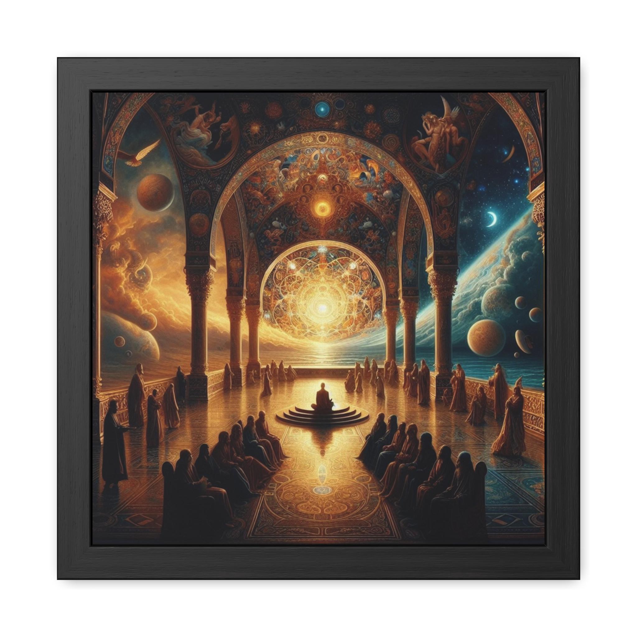 This framed poster reveals a breathtaking vision of life as a sacred school, where souls gather in a cosmic temple to study the mysteries of existence. At the center, a luminous teacher radiates wisdom beneath ornate arches, with galaxies and planets beyond symbolizing the infinite classroom of the universe. Every detail reflects the truth that our experiences — both joys and challenges — are lessons guiding us toward awakening.