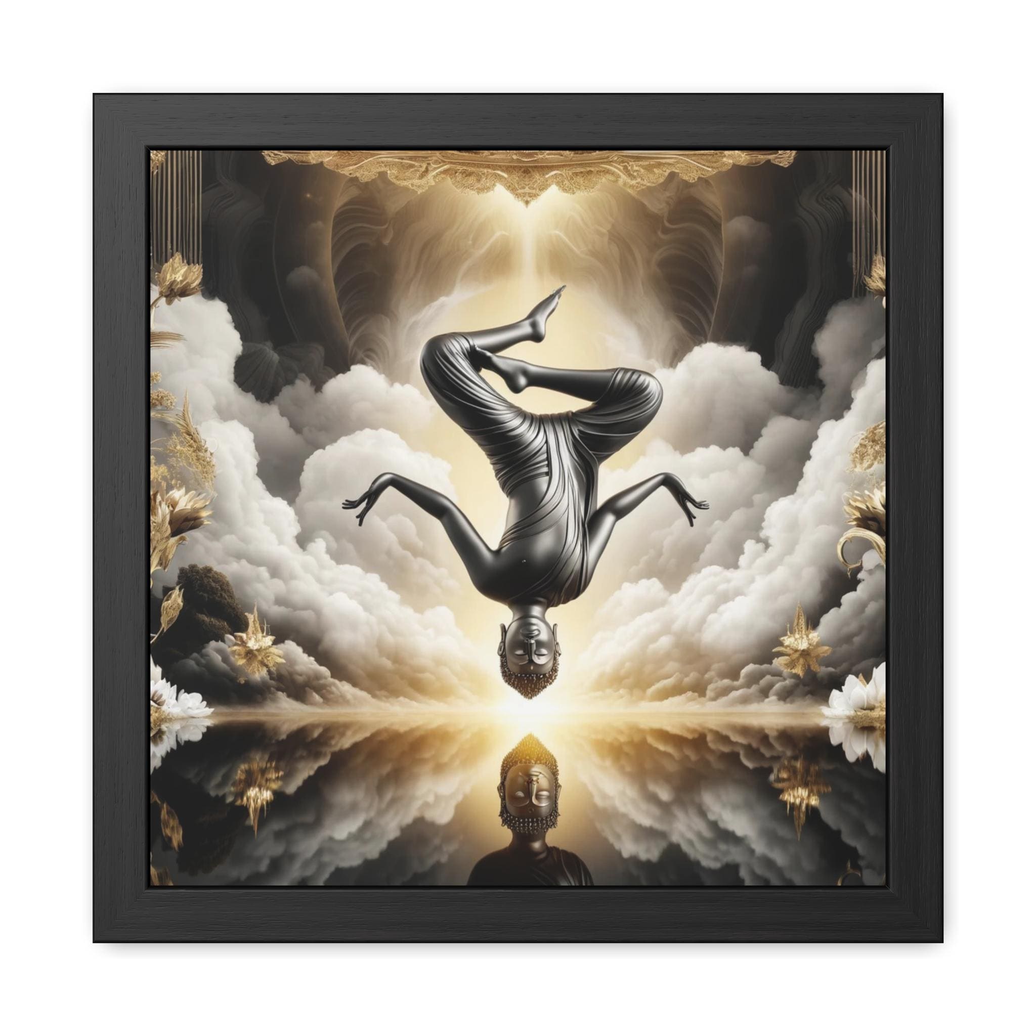 This profound artwork depicts a black and gold Buddha suspended upside down in radiant inversion, defying gravity and merging with the luminous sky. Below, a distorted reflection shimmers on the still waters—symbolizing the Dzogchen insight that our true Buddha nature can never be directly grasped or seen as an object. Like a reflection, it is always present, yet elusive, beyond distortion, beyond perception. The inversion embodies the turning of ordinary view, while the celestial radiance calls us back to the timeless awareness that underlies all appearances. A contemplative centerpiece for meditation rooms, sacred spaces, or seekers drawn to the luminous paradox of the awakened mind.
