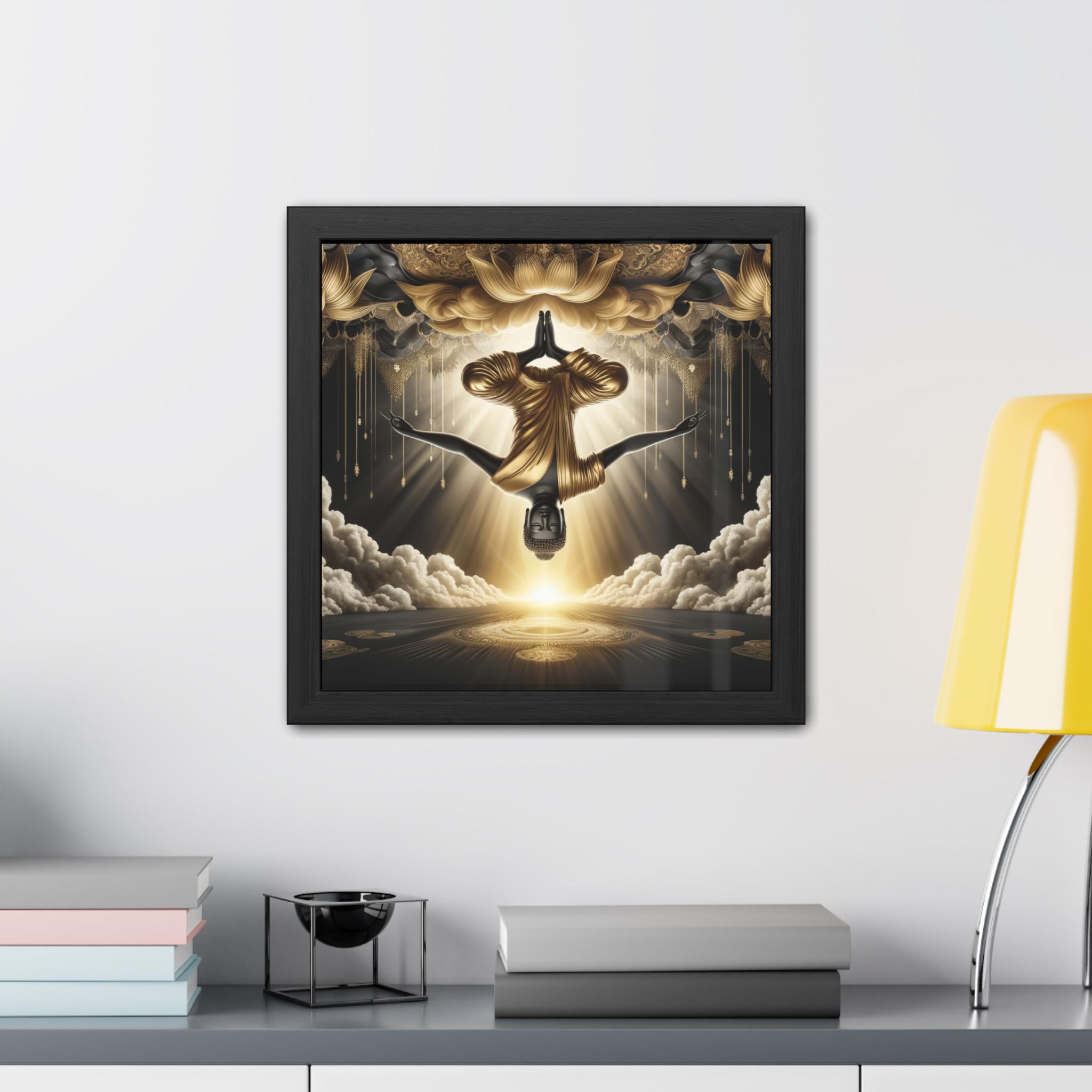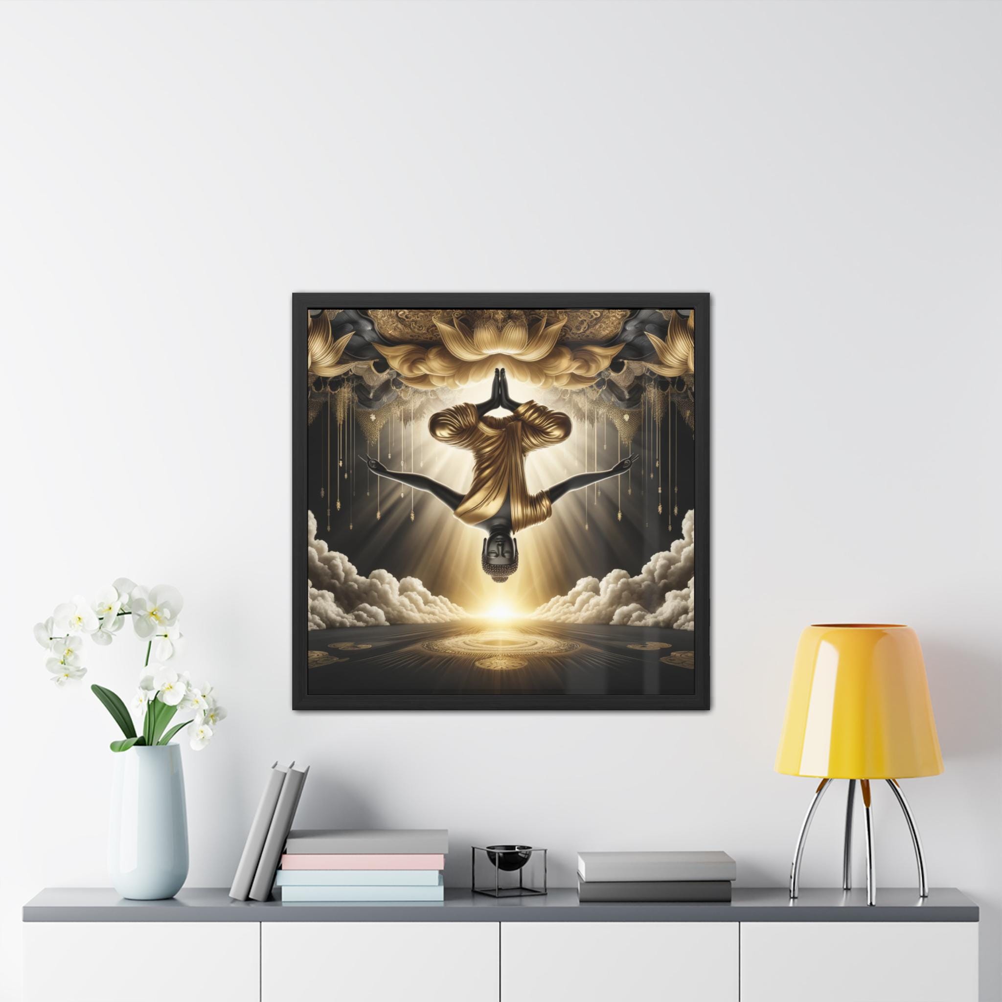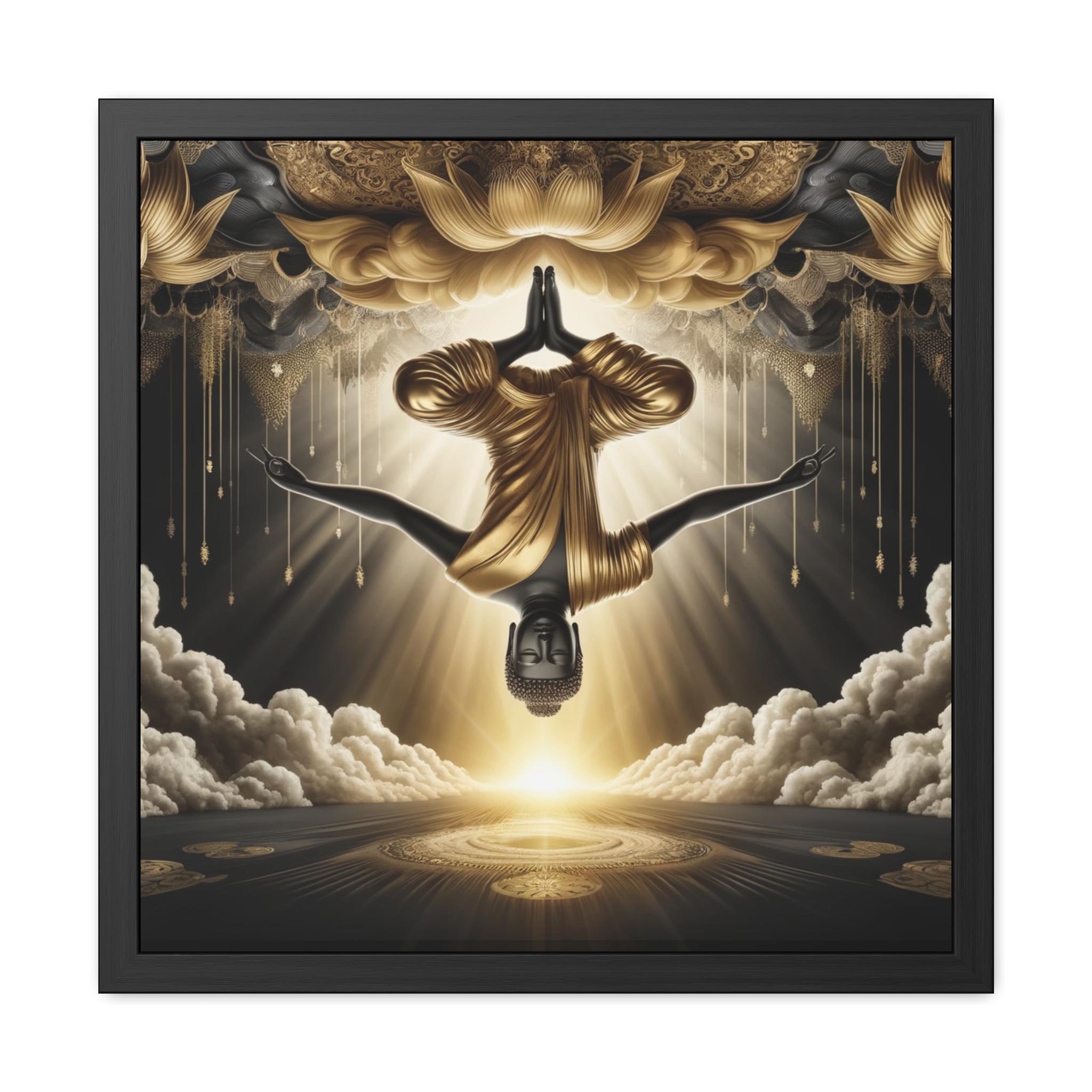 This transcendent artwork depicts the Buddha suspended upside down, robed in radiant gold, dissolving into the luminous vastness of sky and lotus. The inversion of gravity symbolizes the great turning of perception taught in Dzogchen—revealing that Buddha nature is always present, beyond up and down, beyond holding and release. Rays of awakened light pour through clouds and mandalas, illuminating the effortless ground of being. A powerful piece for meditation rooms, sacred spaces, or as a contemplative reminder that liberation arises when awareness recognizes itself.