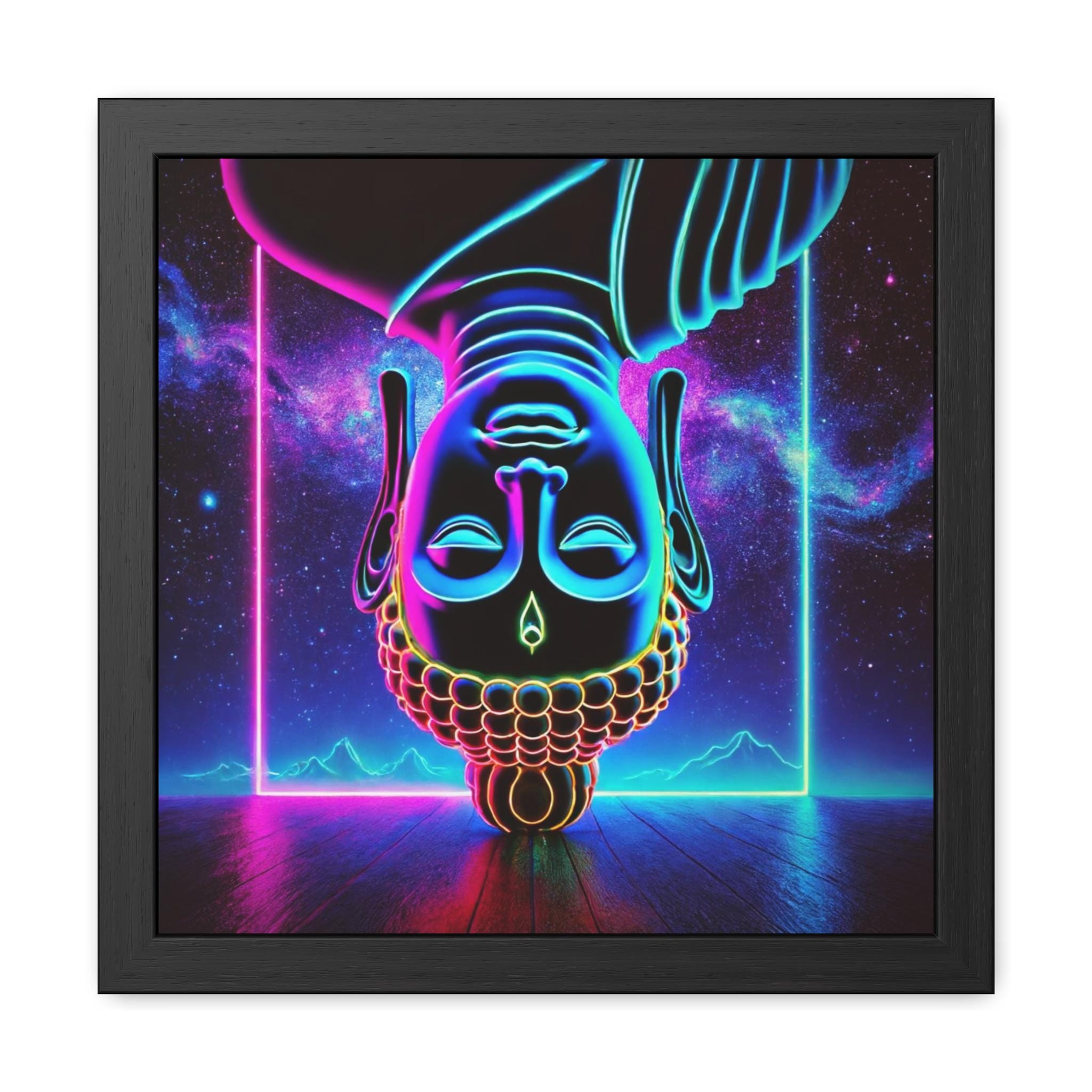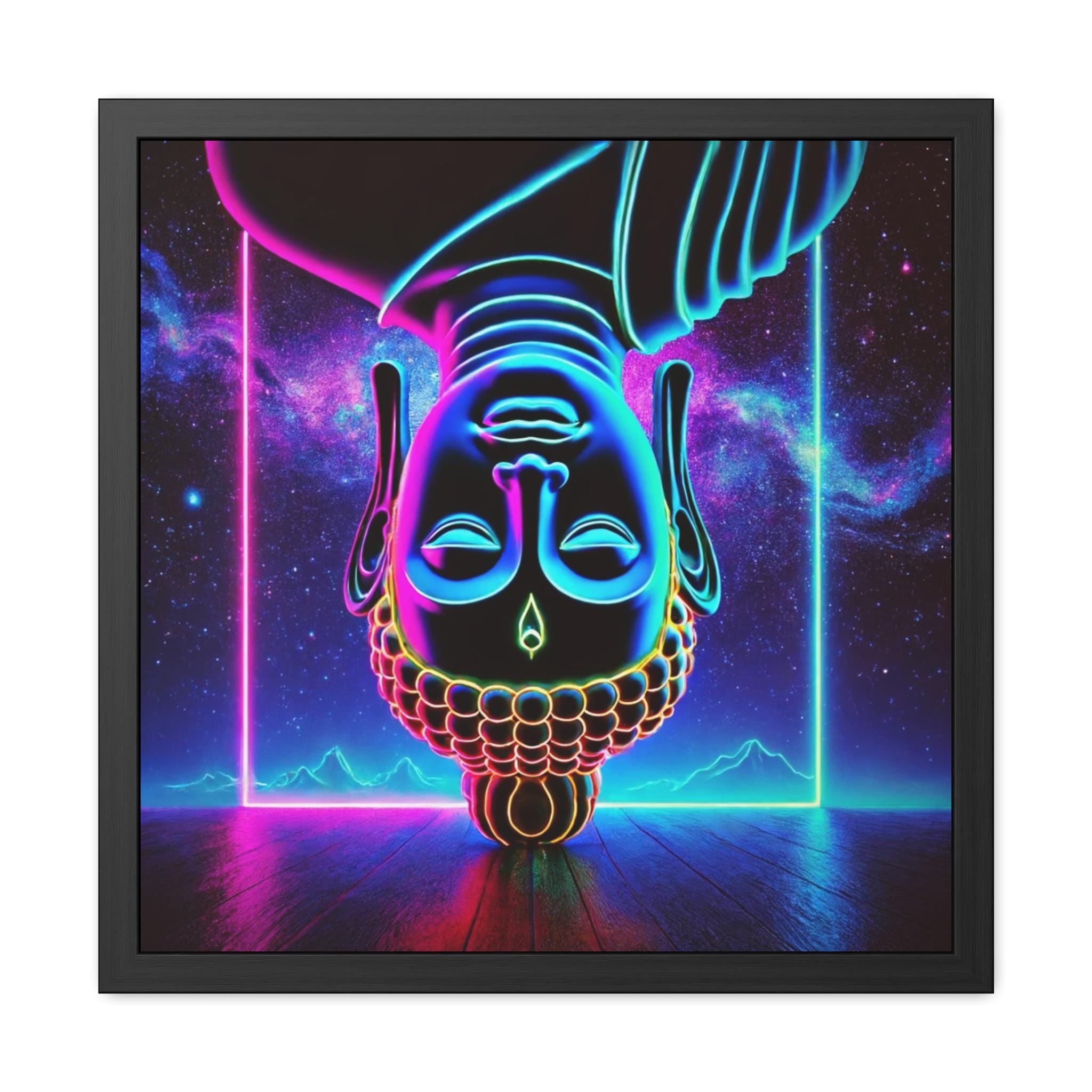 This electrifying artwork reimagines the Buddha upside down in radiant neon hues of blue, pink, and gold. The inversion defies ordinary gravity, symbolizing the shift of perspective needed to glimpse true Buddha nature. Against a cosmic backdrop of luminous clouds and radiant lines, the serene face reflects stillness amid vibrant energy. This piece blends modern neon aesthetics with timeless wisdom, making it perfect for meditation spaces, yoga studios, or as a bold centerpiece celebrating the luminous paradox of form and emptiness.