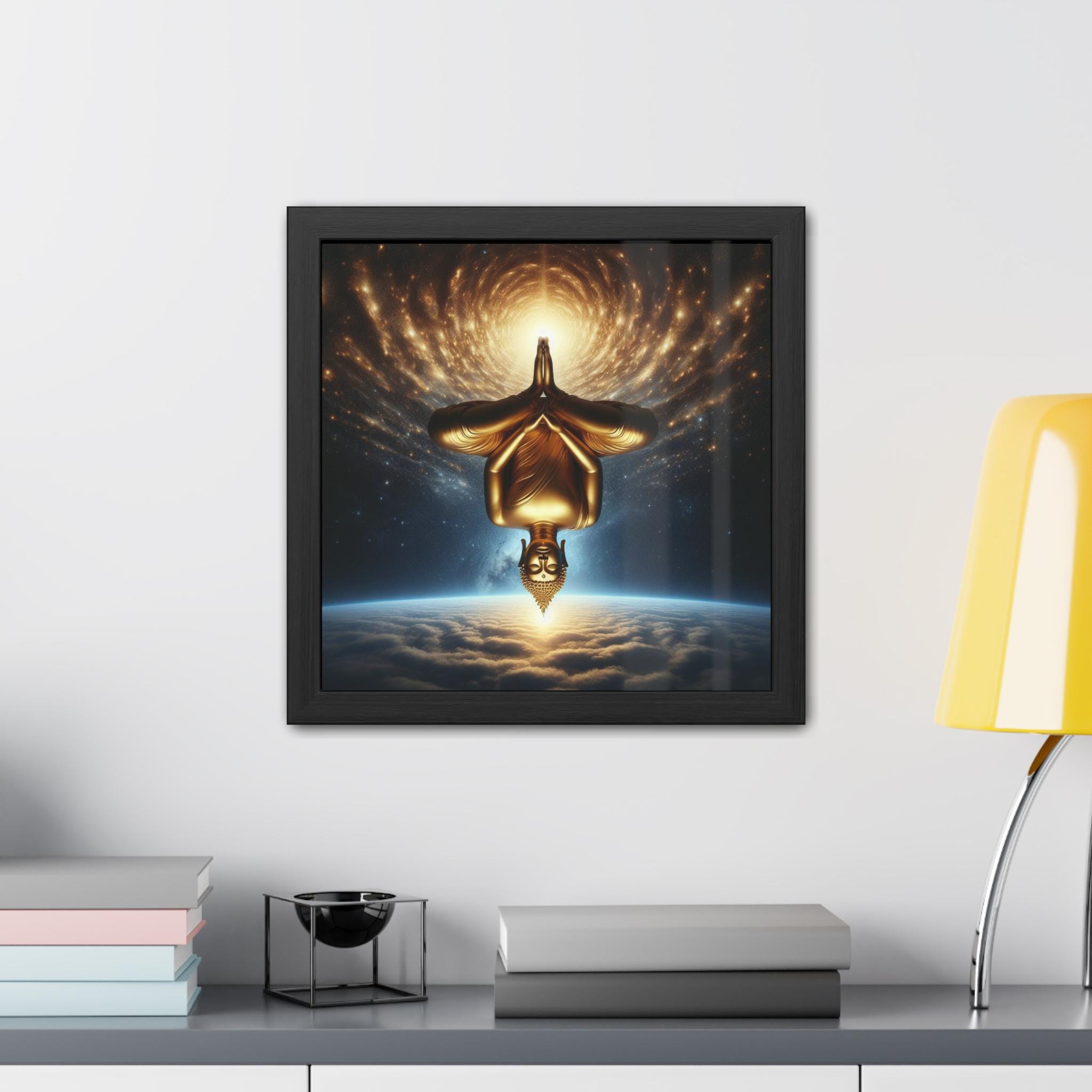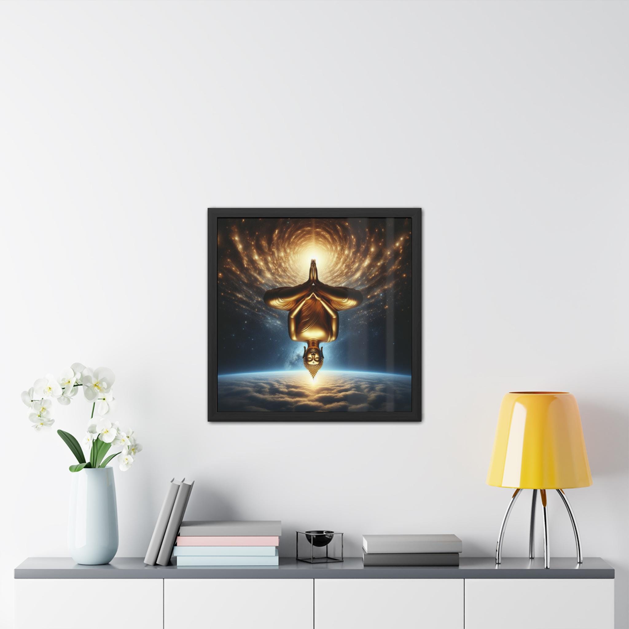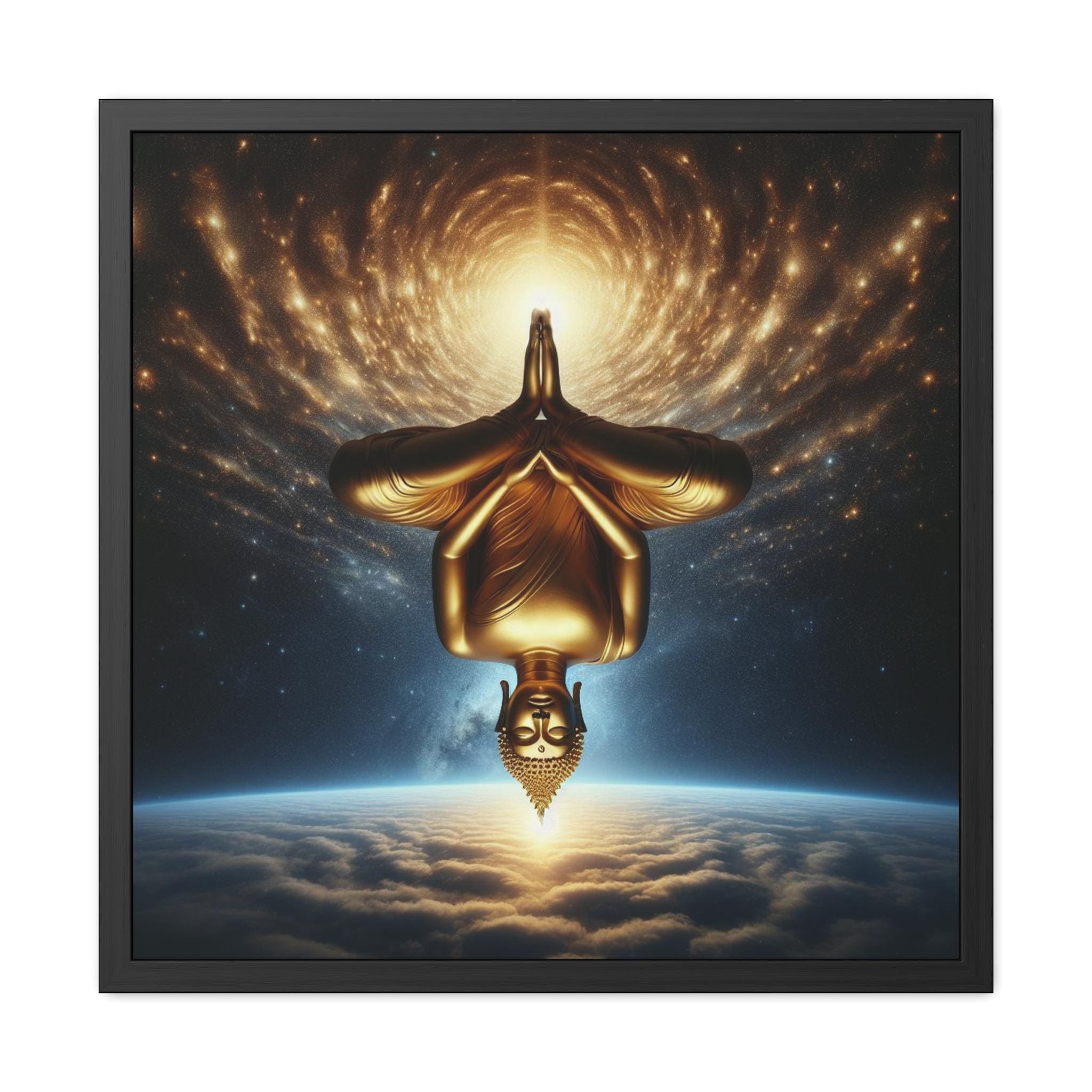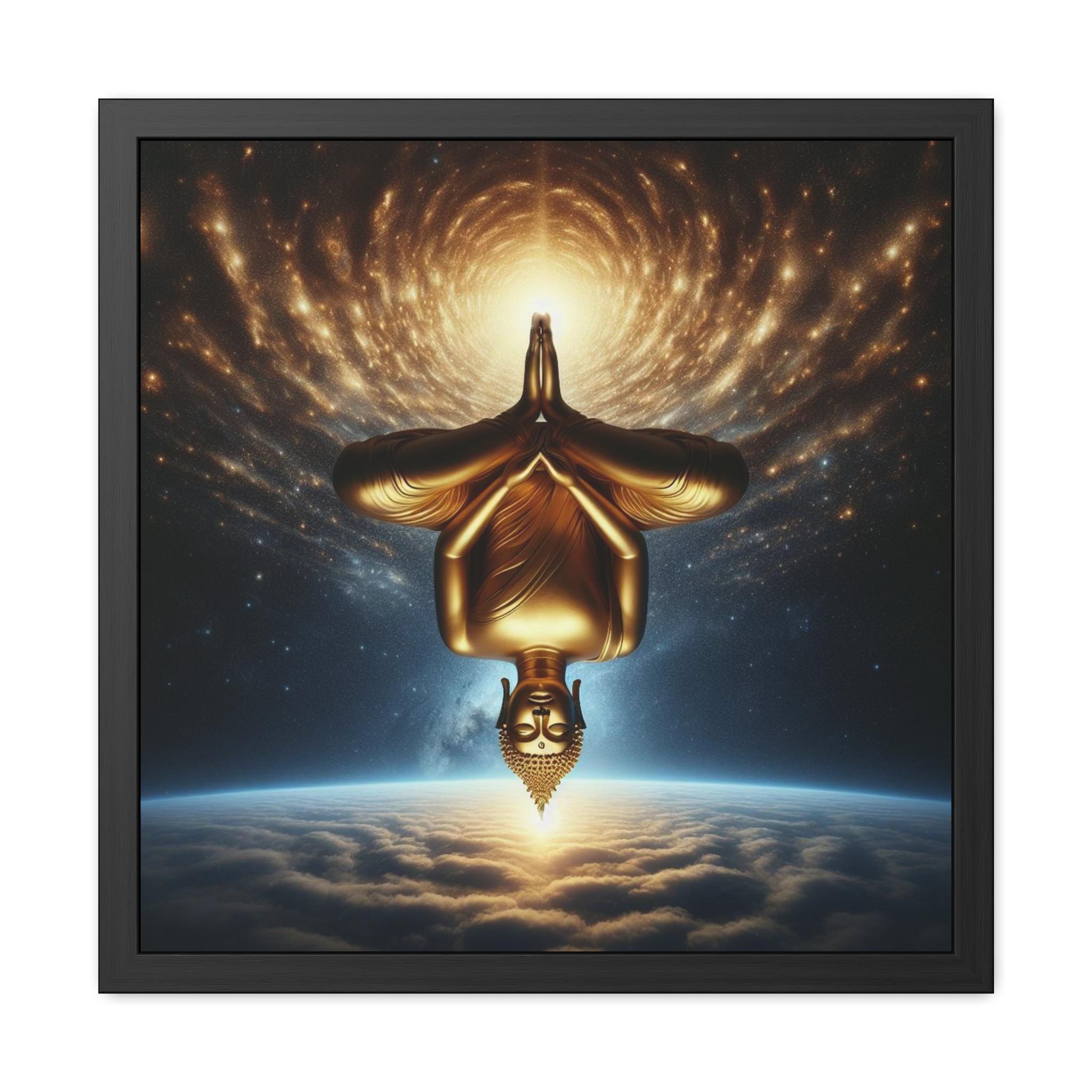 This radiant artwork portrays a golden Buddha suspended upside down above the Earth, with the infinite cosmos spiraling outward in luminous waves. The inversion challenges our ordinary sense of gravity and direction, symbolizing the awakening that arises when we turn perception inside out. Here, Buddha nature shines timelessly, reminding us that true freedom is not bound by the pull of the world but discovered in stillness beyond inversion. A striking piece for meditation rooms, sacred spaces, or anyone drawn to the meeting of cosmic wonder and inner silence.