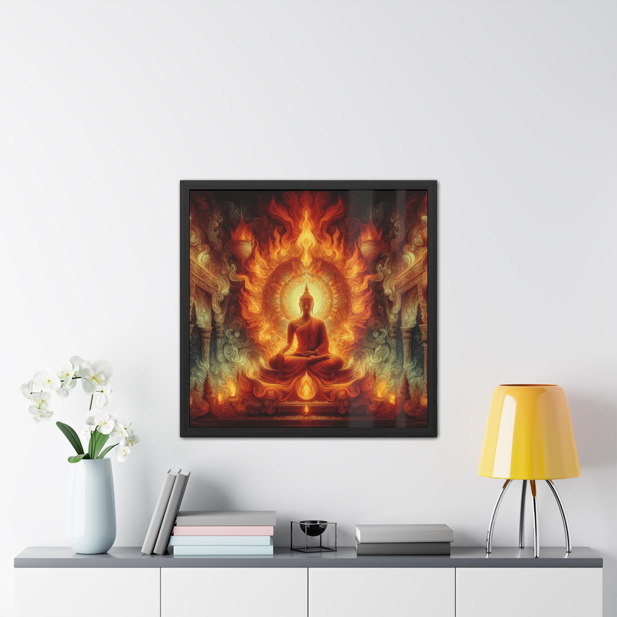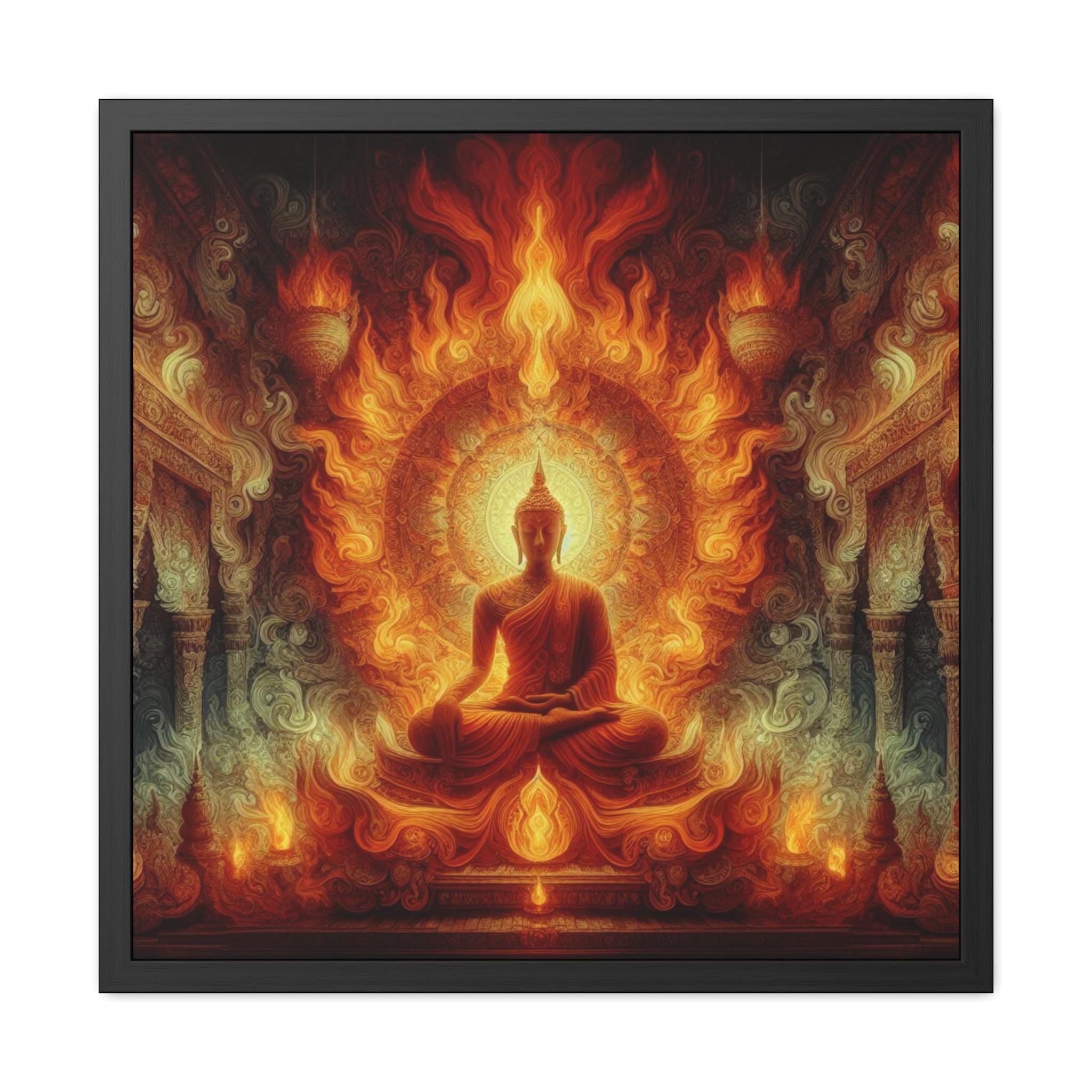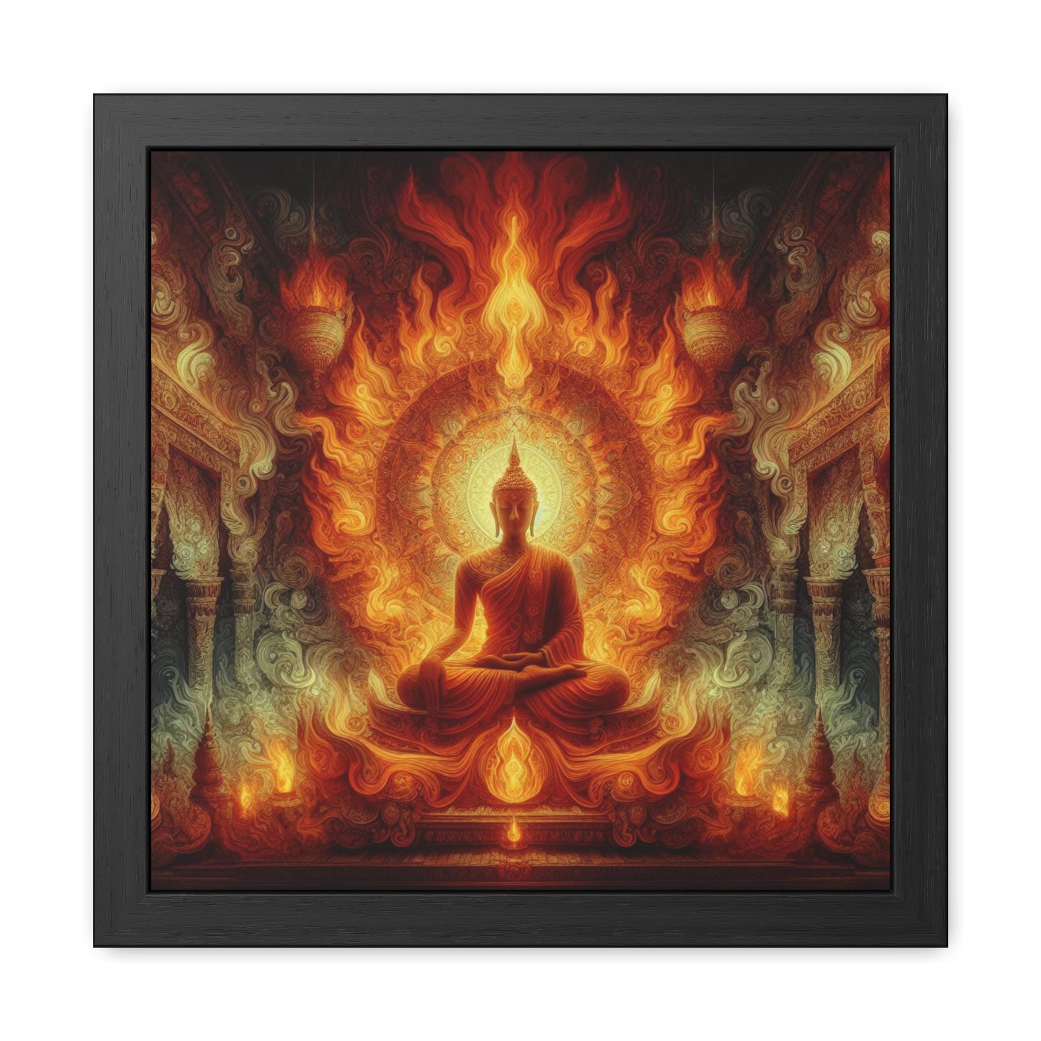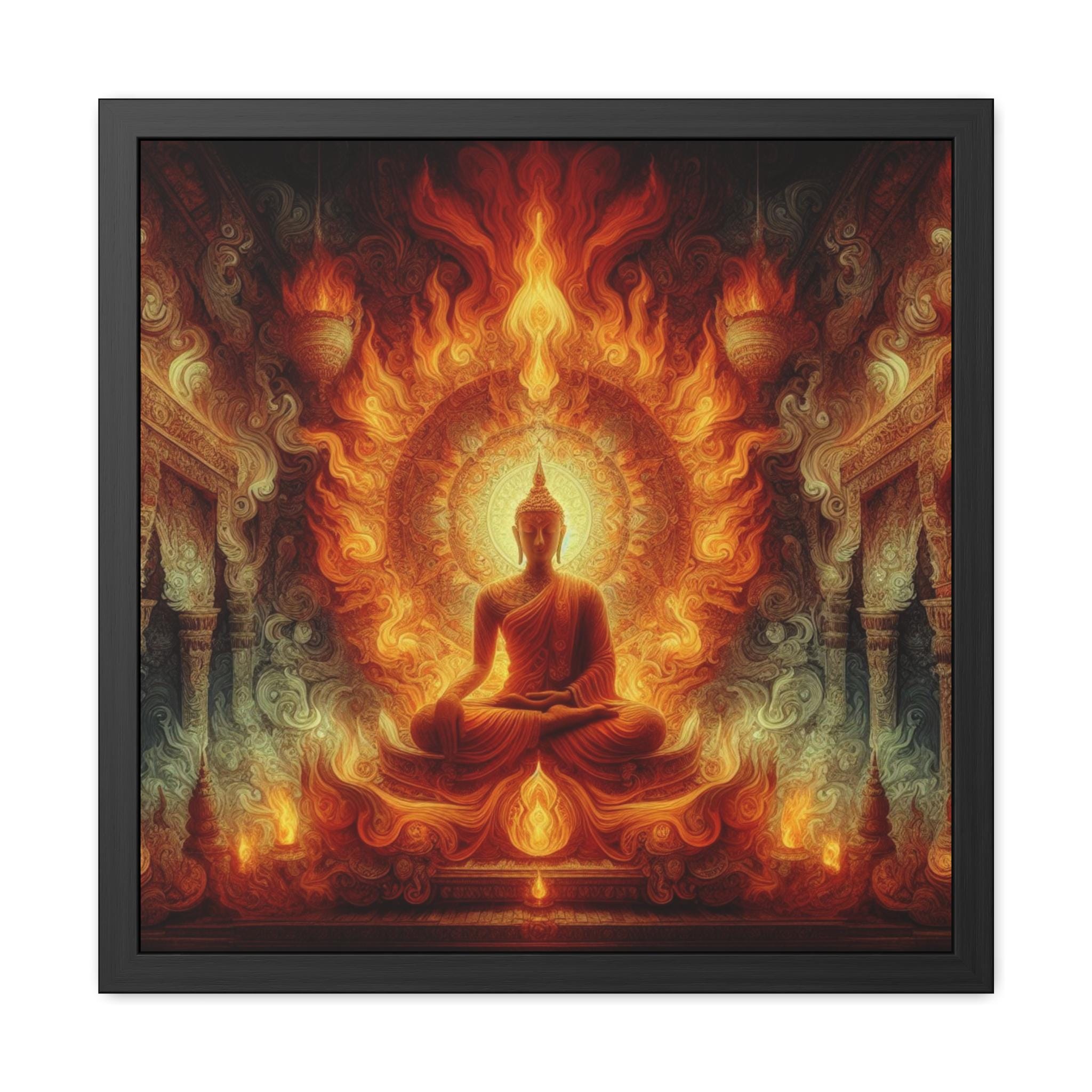 This striking artwork portrays the Buddha seated in profound meditation, enveloped in a radiant blaze of flames that illuminate the temple around him. Fire, as one of the primordial elements, symbolizes transformation, purification, and the fierce clarity of awakened awareness. The mandala-like aura radiating behind the Buddha merges seamlessly with the rising fire, representing the incineration of ignorance and the illumination of wisdom. This powerful depiction invites the viewer to reflect on the inner flame of truth, the spark of enlightenment that cannot be extinguished. A mesmerizing piece for meditation halls, yoga sanctuaries, or seekers drawn to the transformative energy of the Dharma.