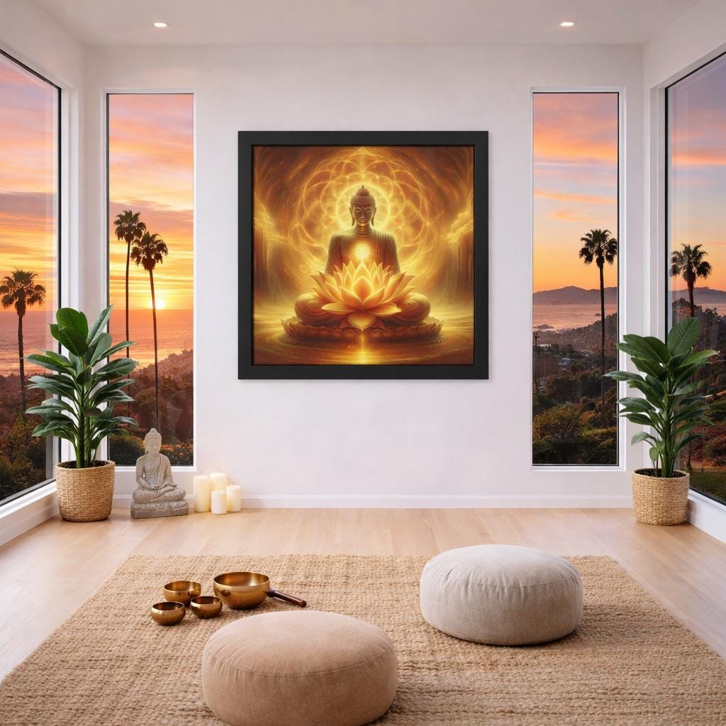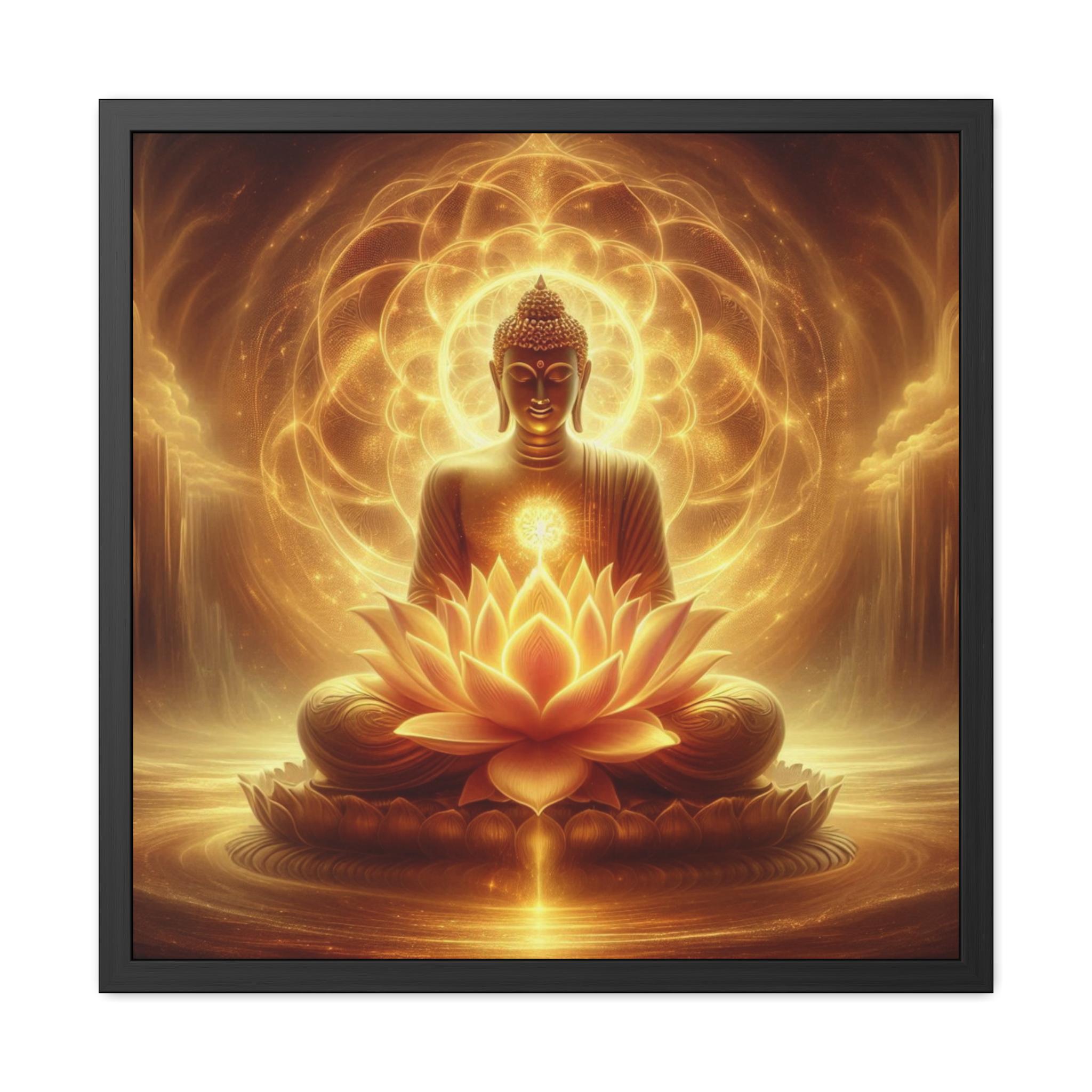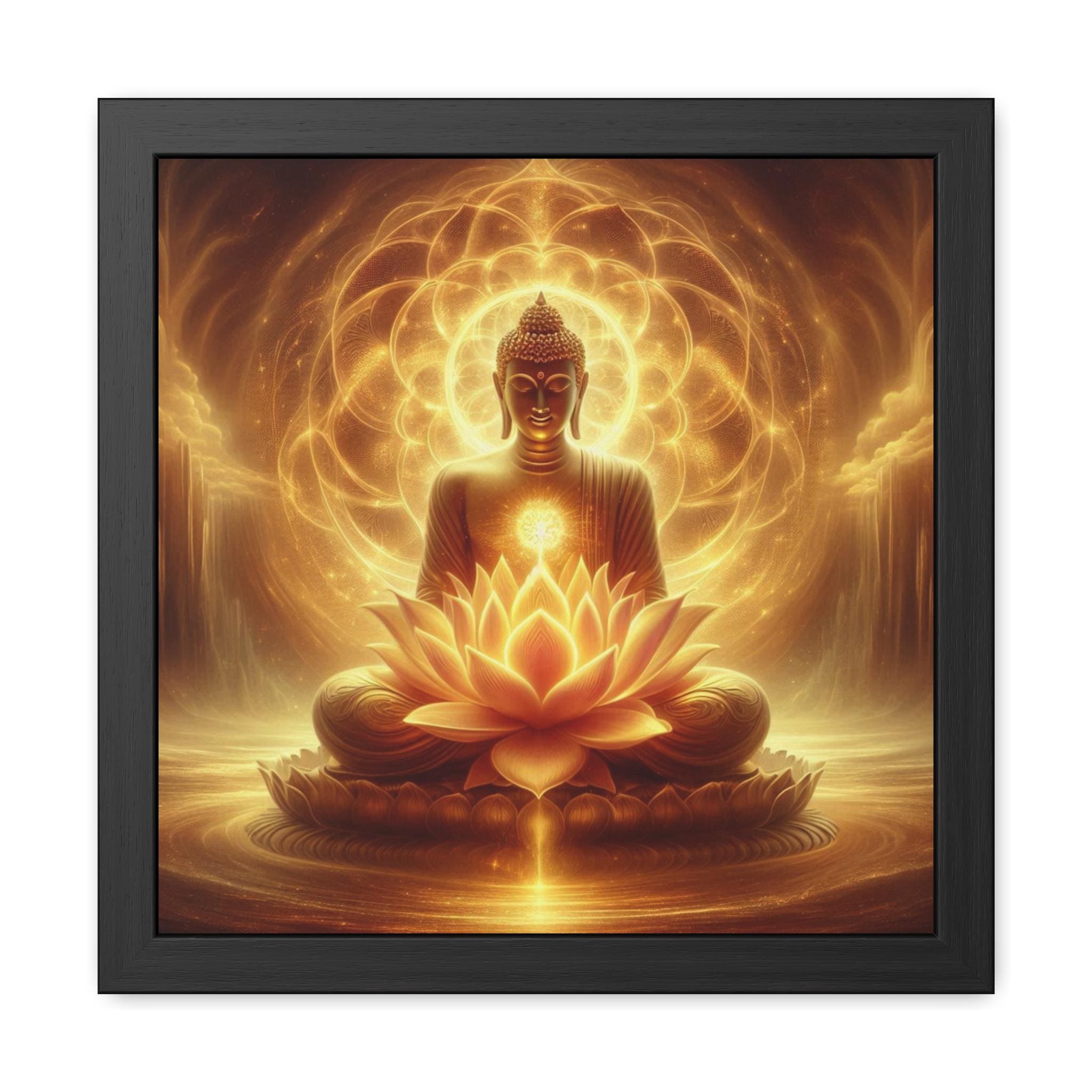 This mesmerizing artwork depicts the Buddha seated in radiant golden light upon a luminous lotus, symbolizing purity, awakening, and the timeless glow of enlightenment. Surrounded by sacred patterns of light, the Buddha radiates peace and inner wisdom, offering a reminder of stillness and divine presence. Perfect for meditation rooms, yoga spaces, or as an inspiring focal point, this piece brings harmony, serenity, and spiritual depth to any environment.