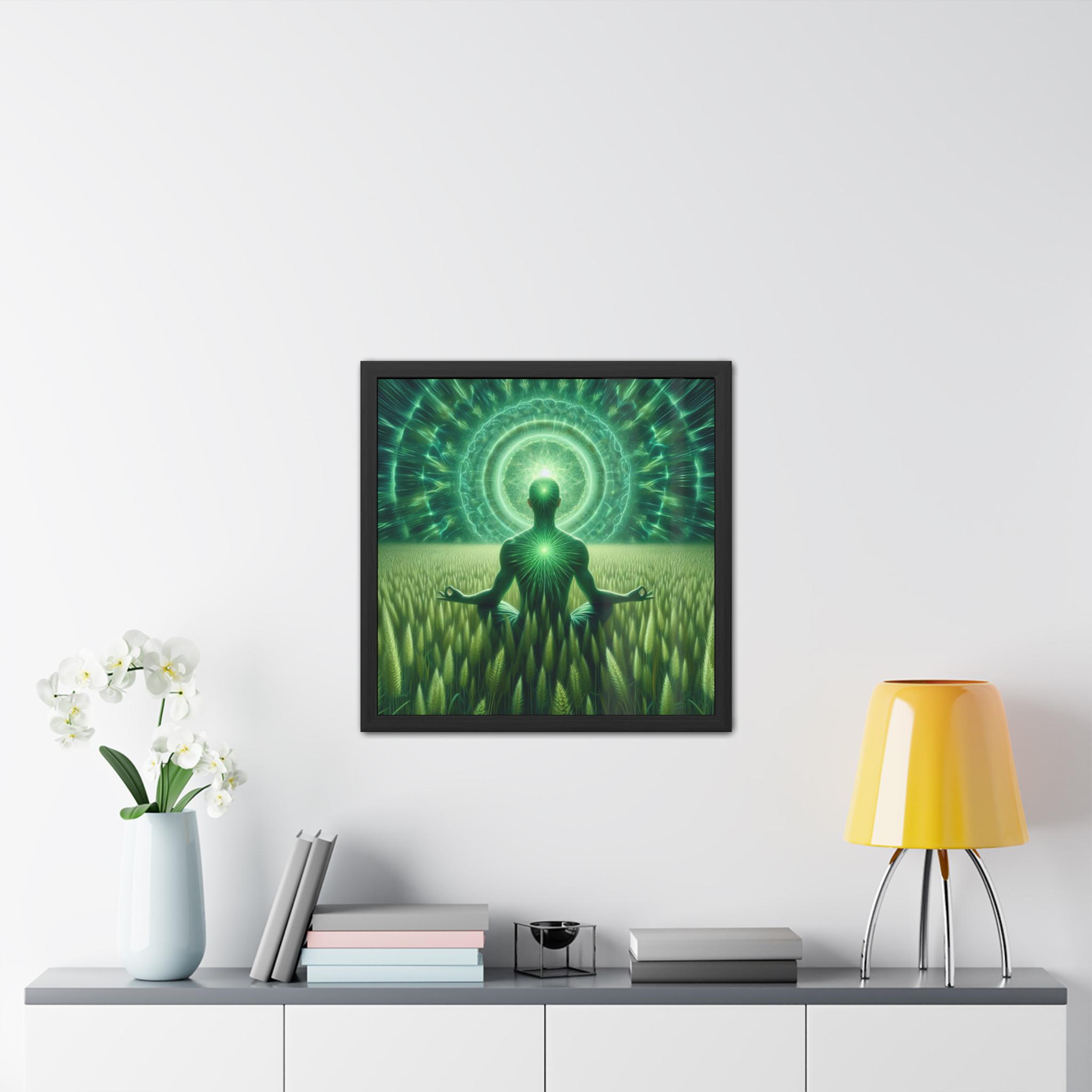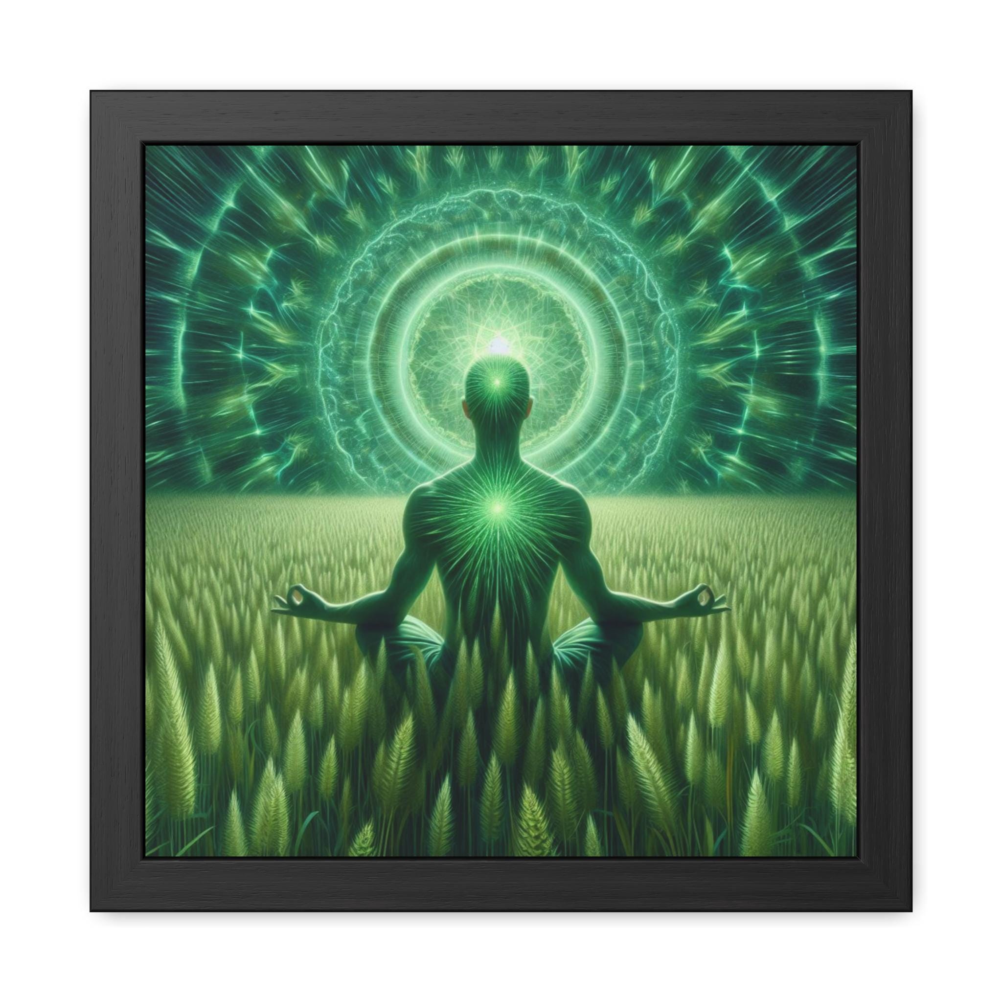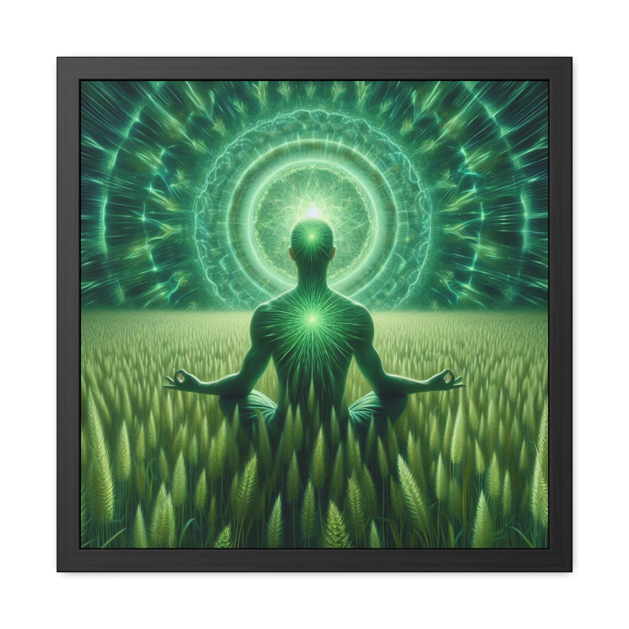 This stunning artwork shows a meditator seated in a field of green grass beneath a radiant mandala of light, symbolizing the deep connection between nature, body, and universal consciousness. The glowing heart center and vibrant green aura reflect balance, grounding, and spiritual awakening. Ideal for meditation rooms, yoga studios, or as nature-inspired wall art, this piece invites harmony, peace, and connection to the living earth.