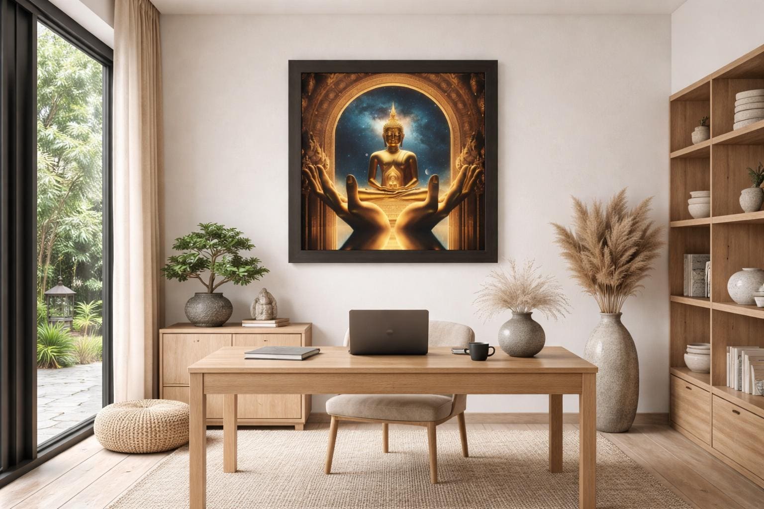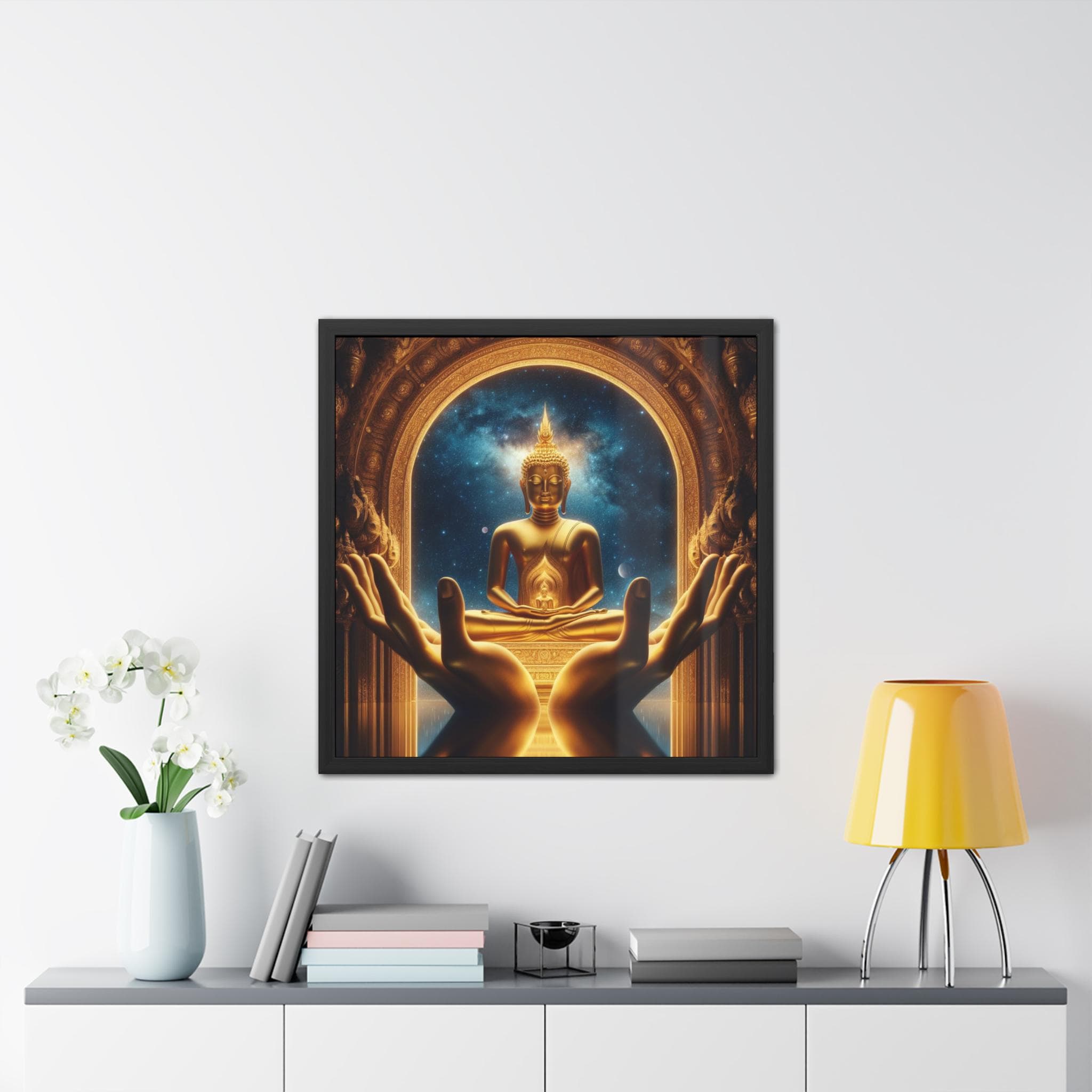 A radiant golden Buddha rests at the center of cosmic wonder, framed by sacred hands and celestial stars. This image captures the essence of awe, reverence, and timeless serenity—inviting us to behold the infinite light of awakening within and beyond.