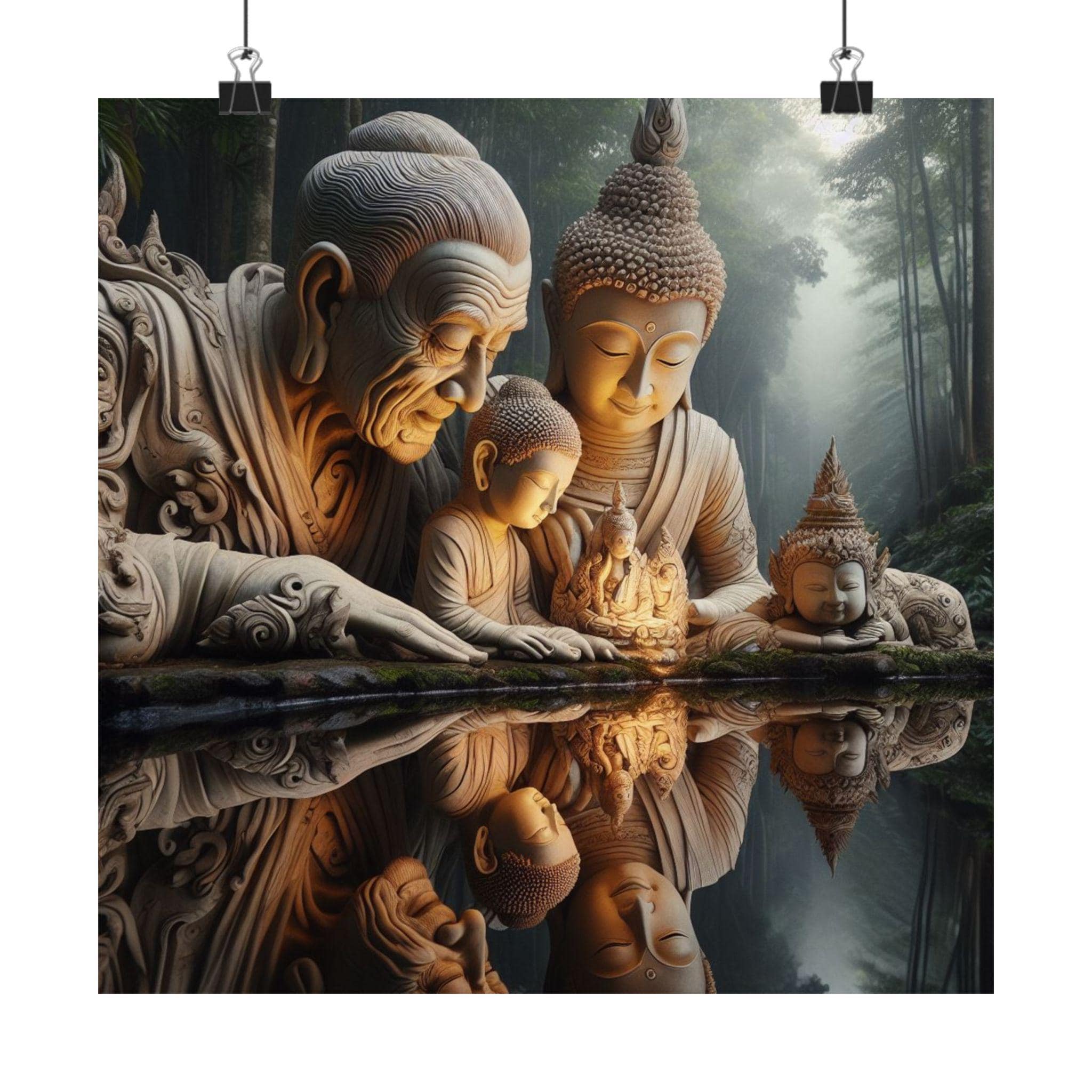 This serene artwork depicts generations of enlightened beings, their presence radiating wisdom and compassion as they gather in quiet reflection. The mirrored water below emphasizes the continuity of guidance across time, symbolizing how ancestral wisdom flows into the present, guiding each soul on the path of awakening.