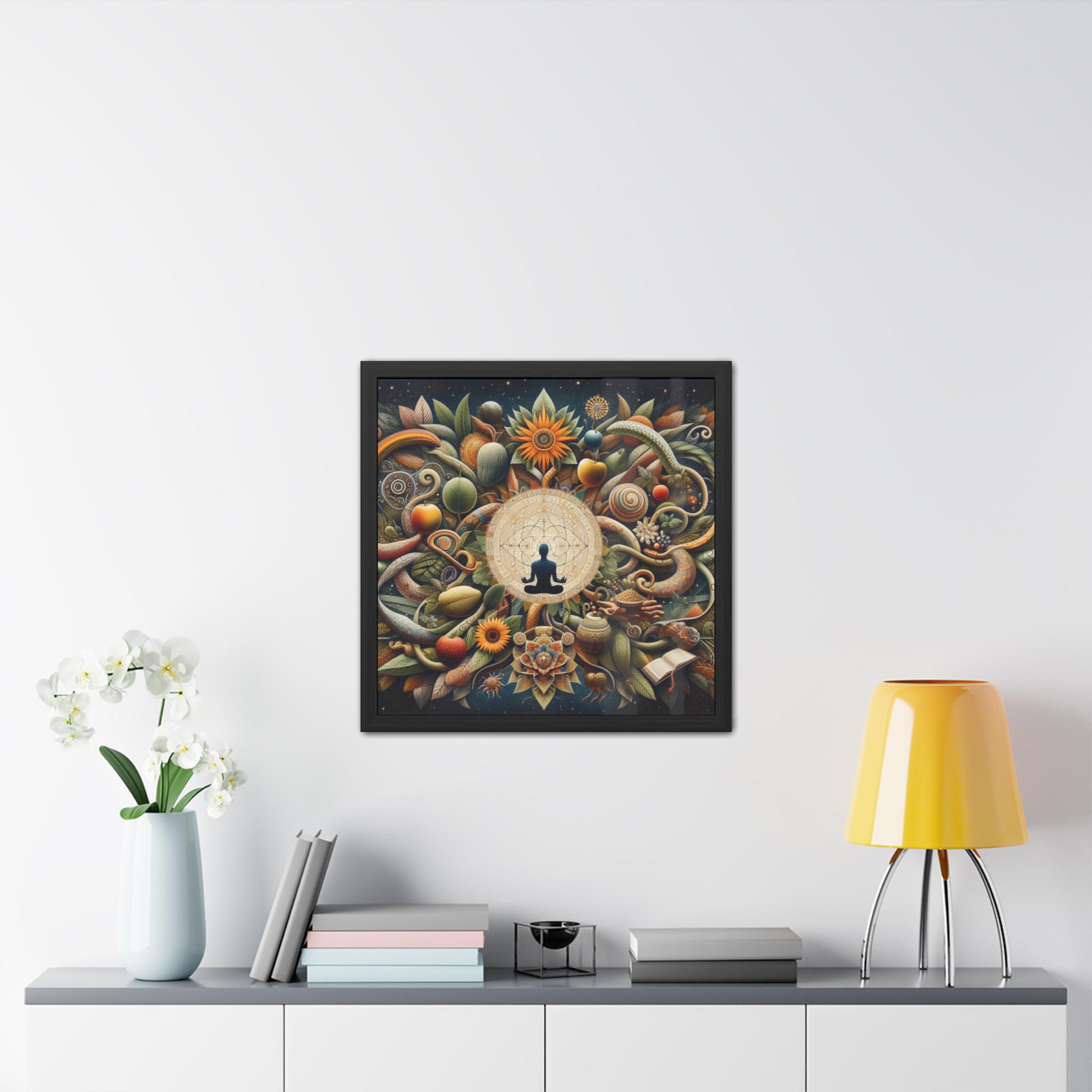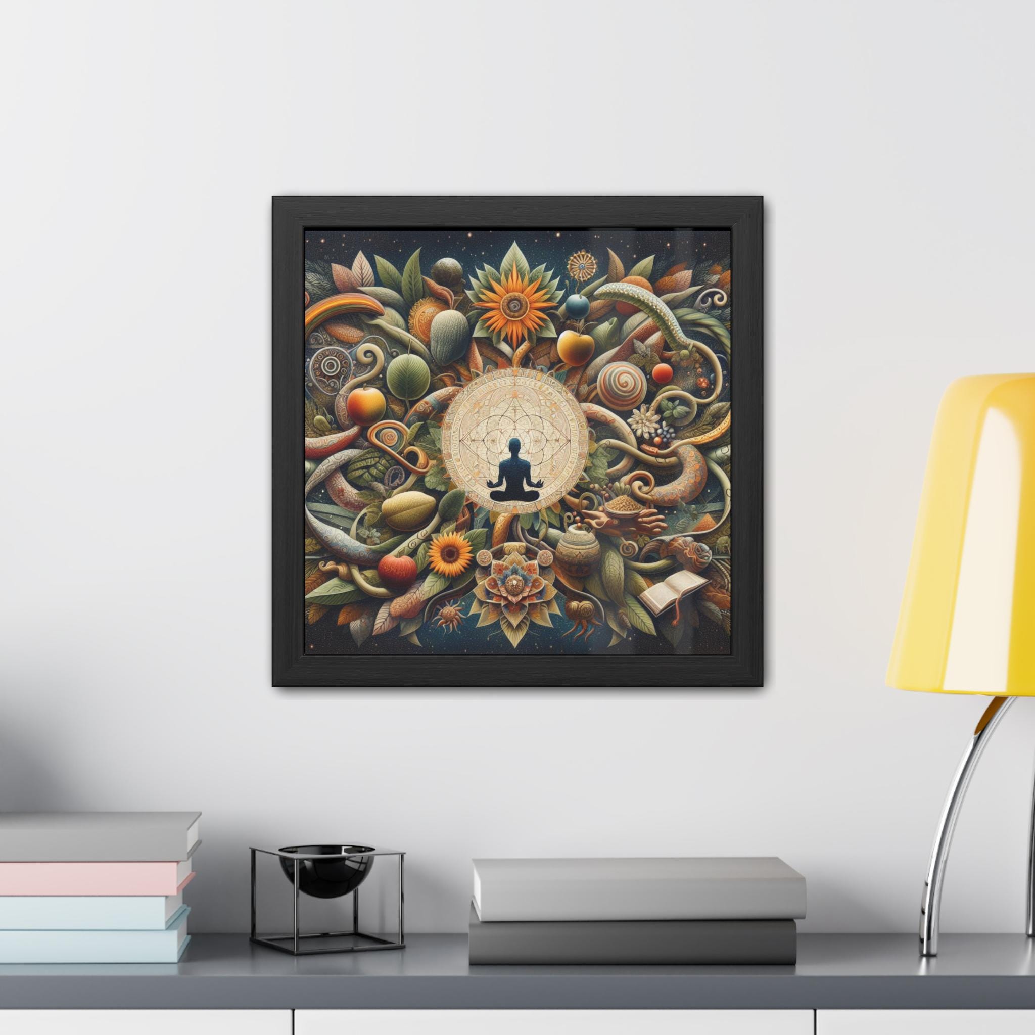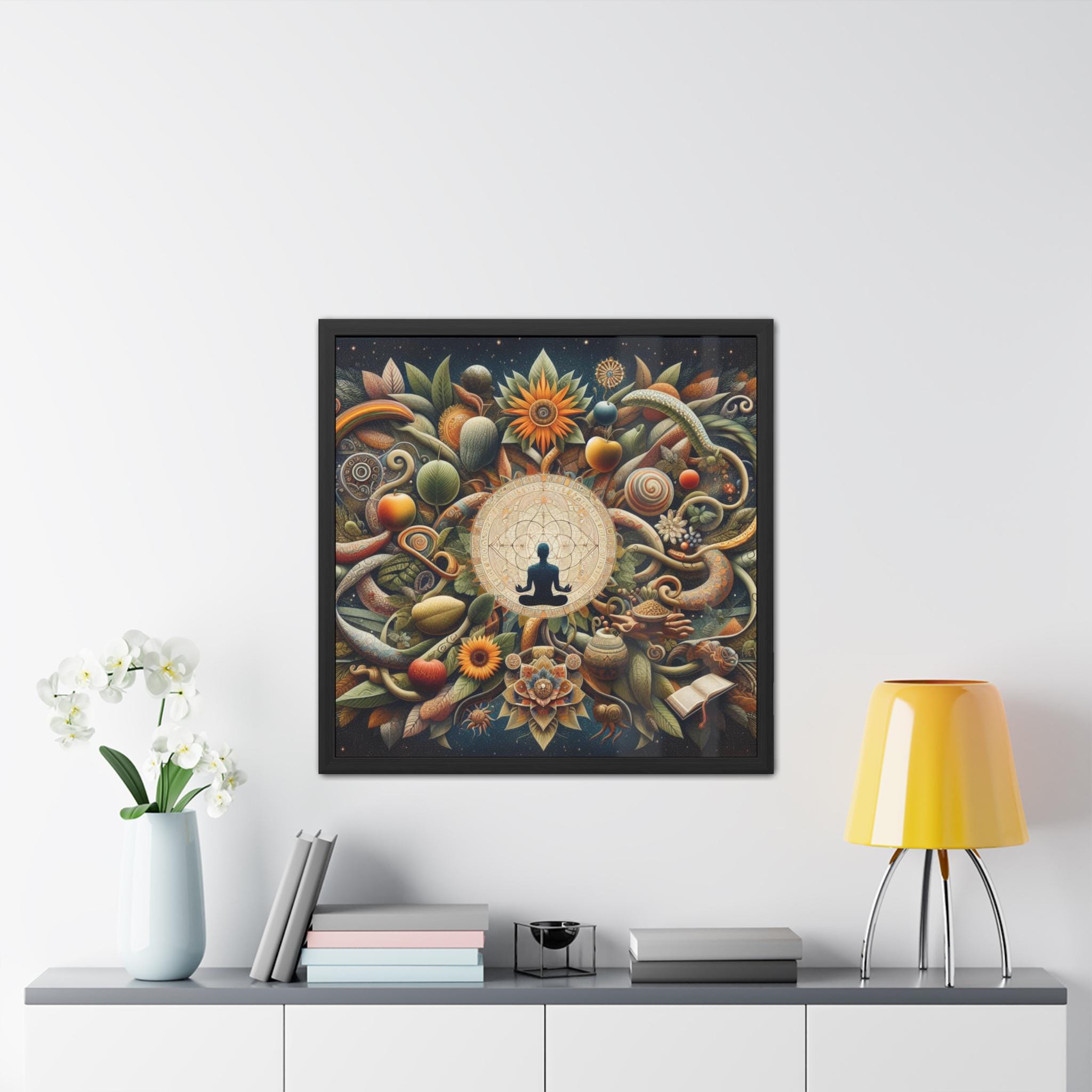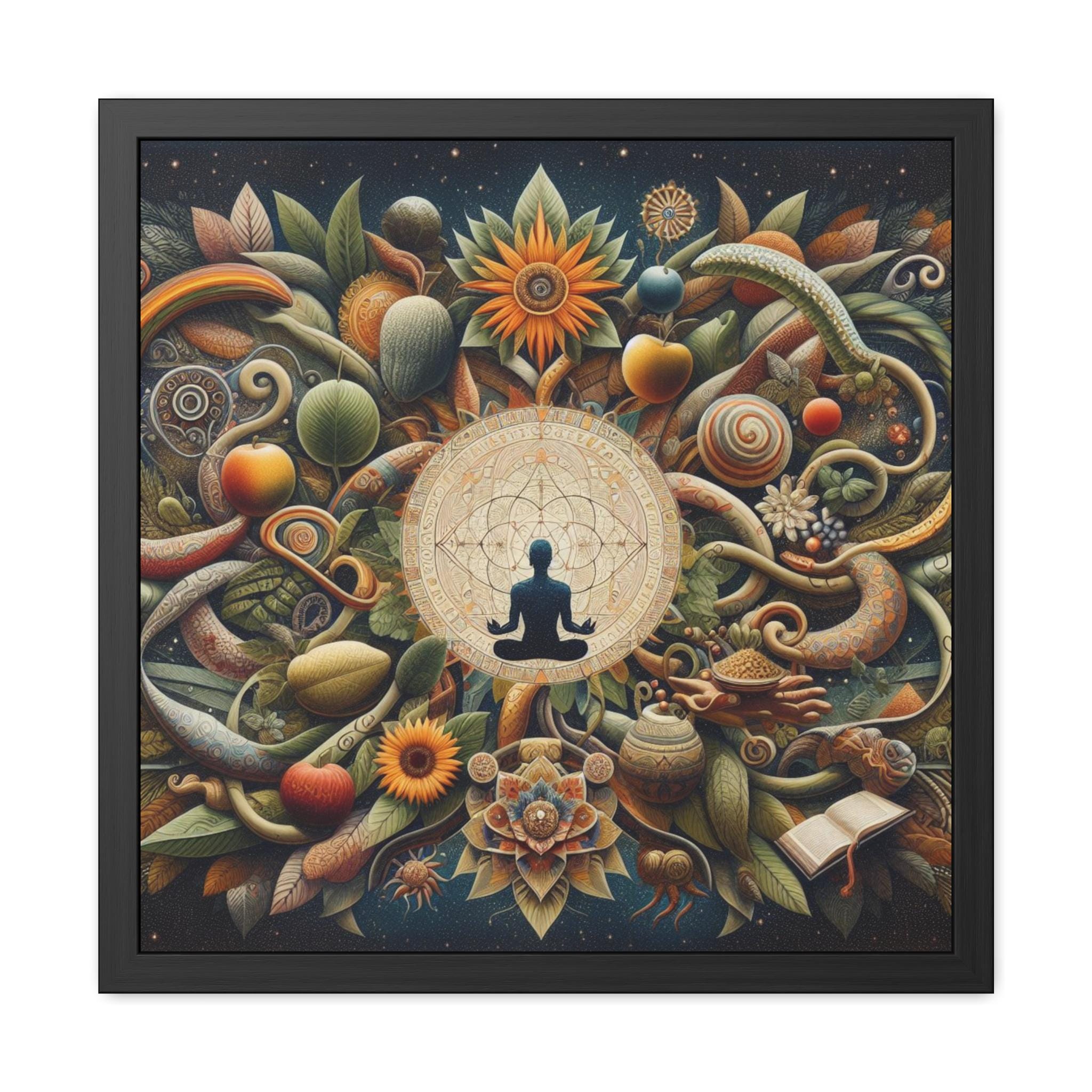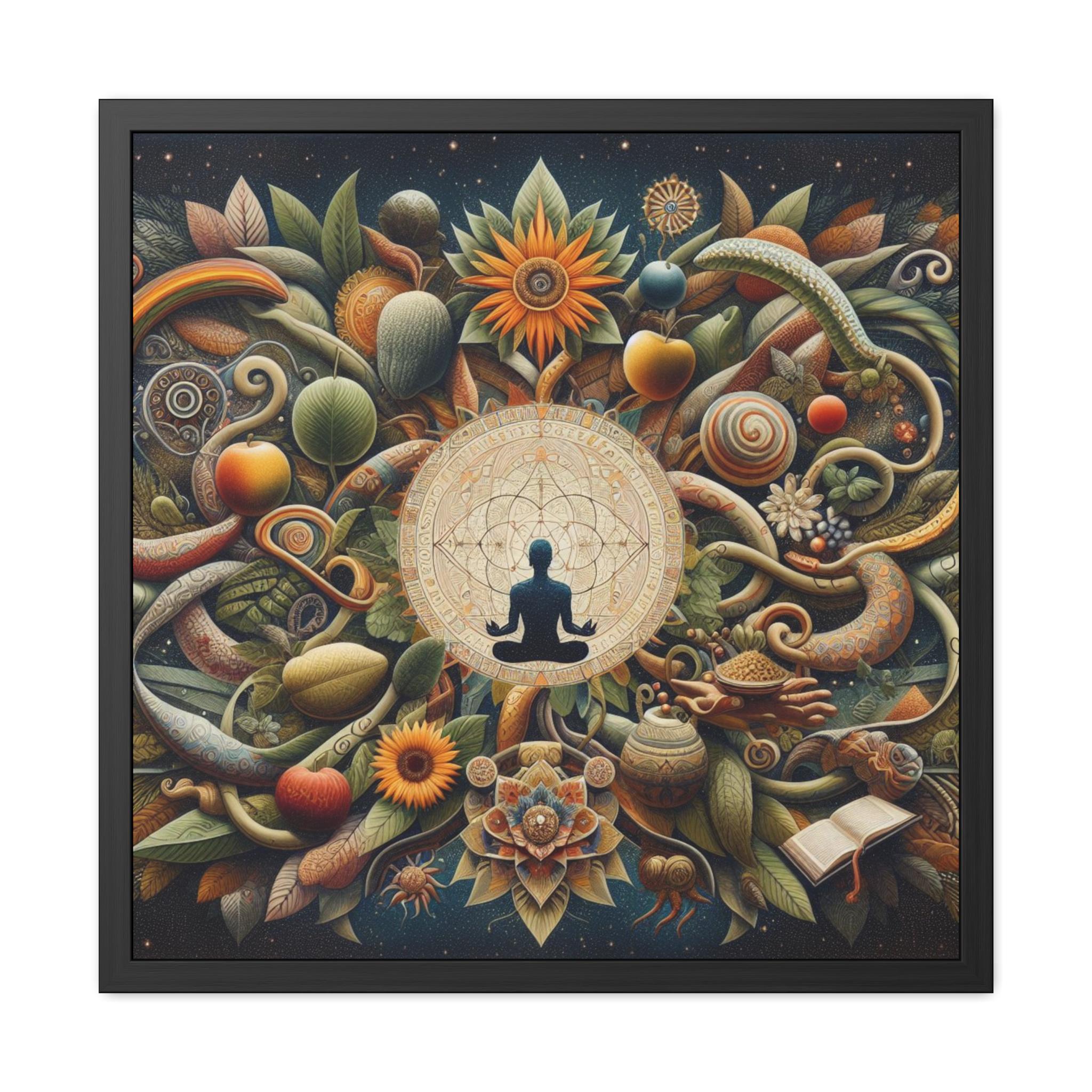 This visionary artwork reflects the profound merging of Ayahuasca consciousness with the timeless wisdom of Dzogchen. At the center, a meditator sits within a radiant mandala of awareness, surrounded by spiraling vines, sacred plants, fruits, and cosmic patterns. The vibrant jungle imagery symbolizes the Ayahuasca mind—fluid, interconnected, and alive—while the luminous stillness of the meditator embodies the Dzogchen view: awareness aware of itself. Together, they reveal the union of nature’s medicine and the natural state of being. A powerful piece for seekers exploring plant wisdom, meditation, and the boundless expanse of pure awareness.