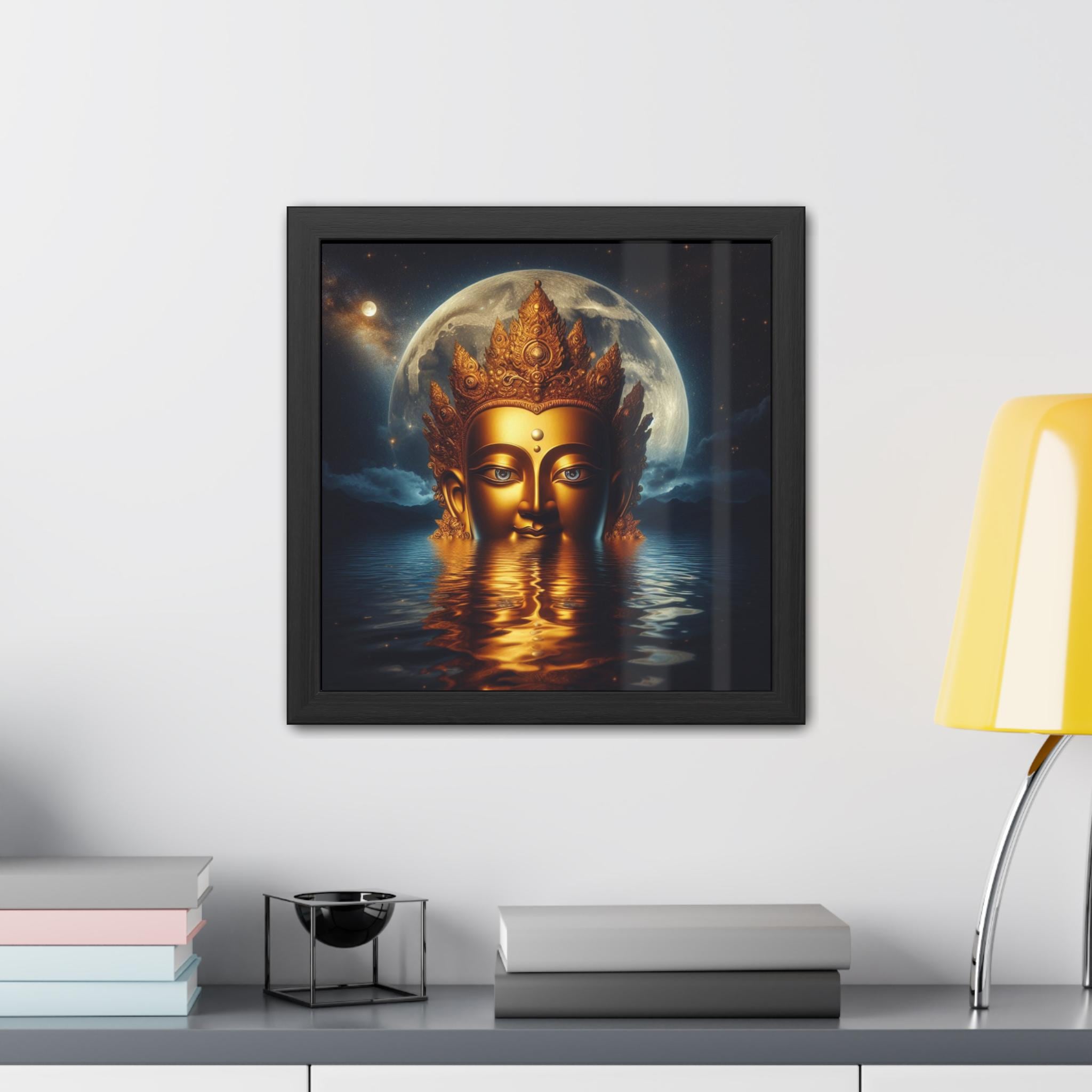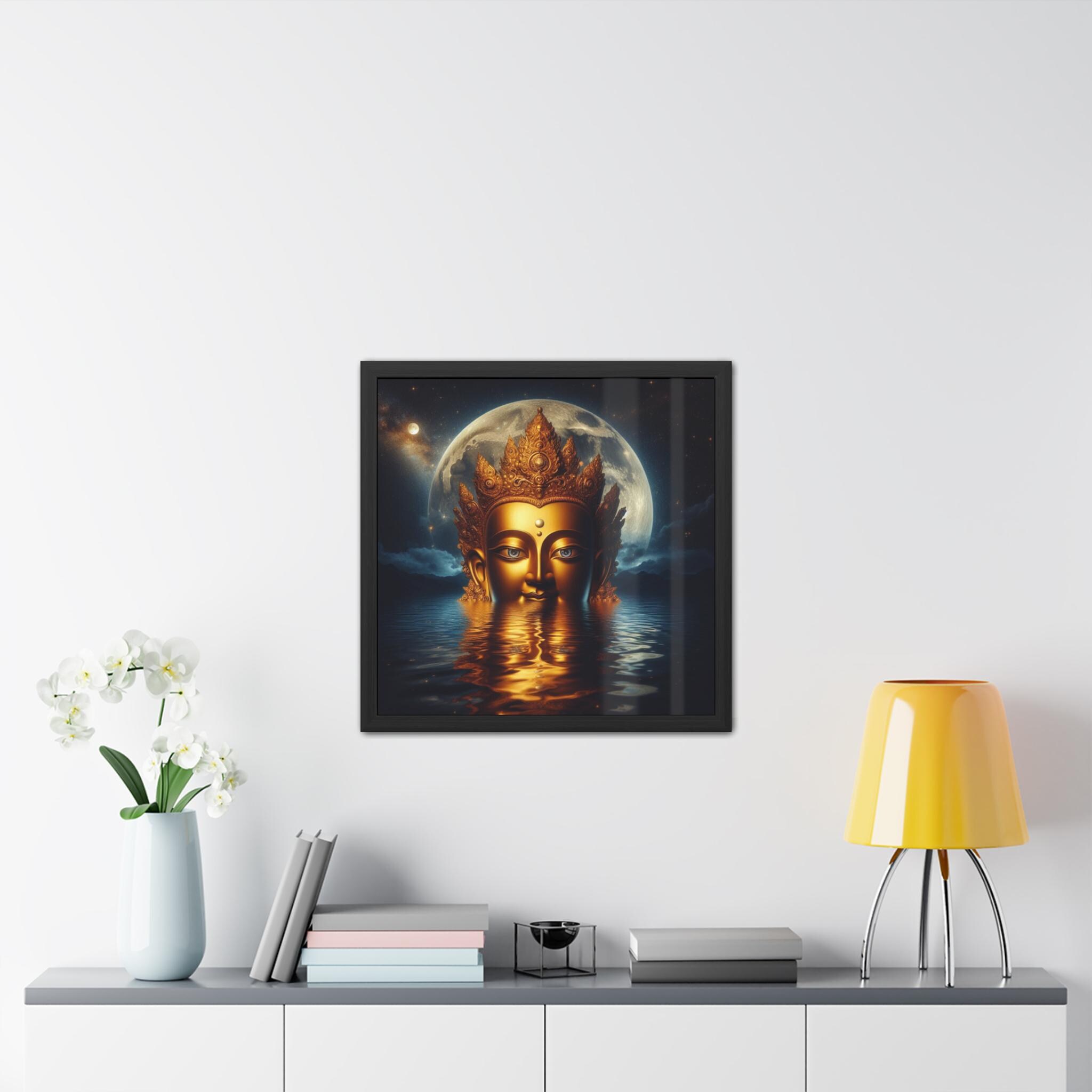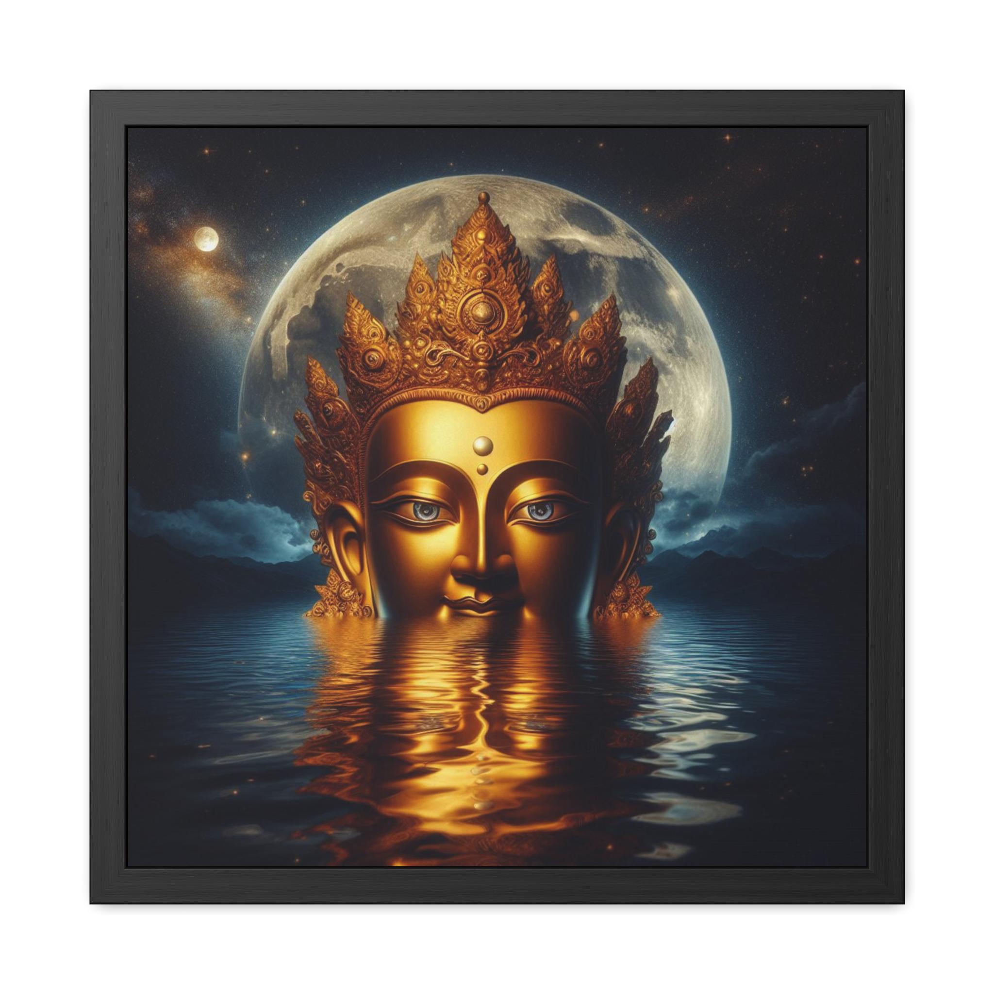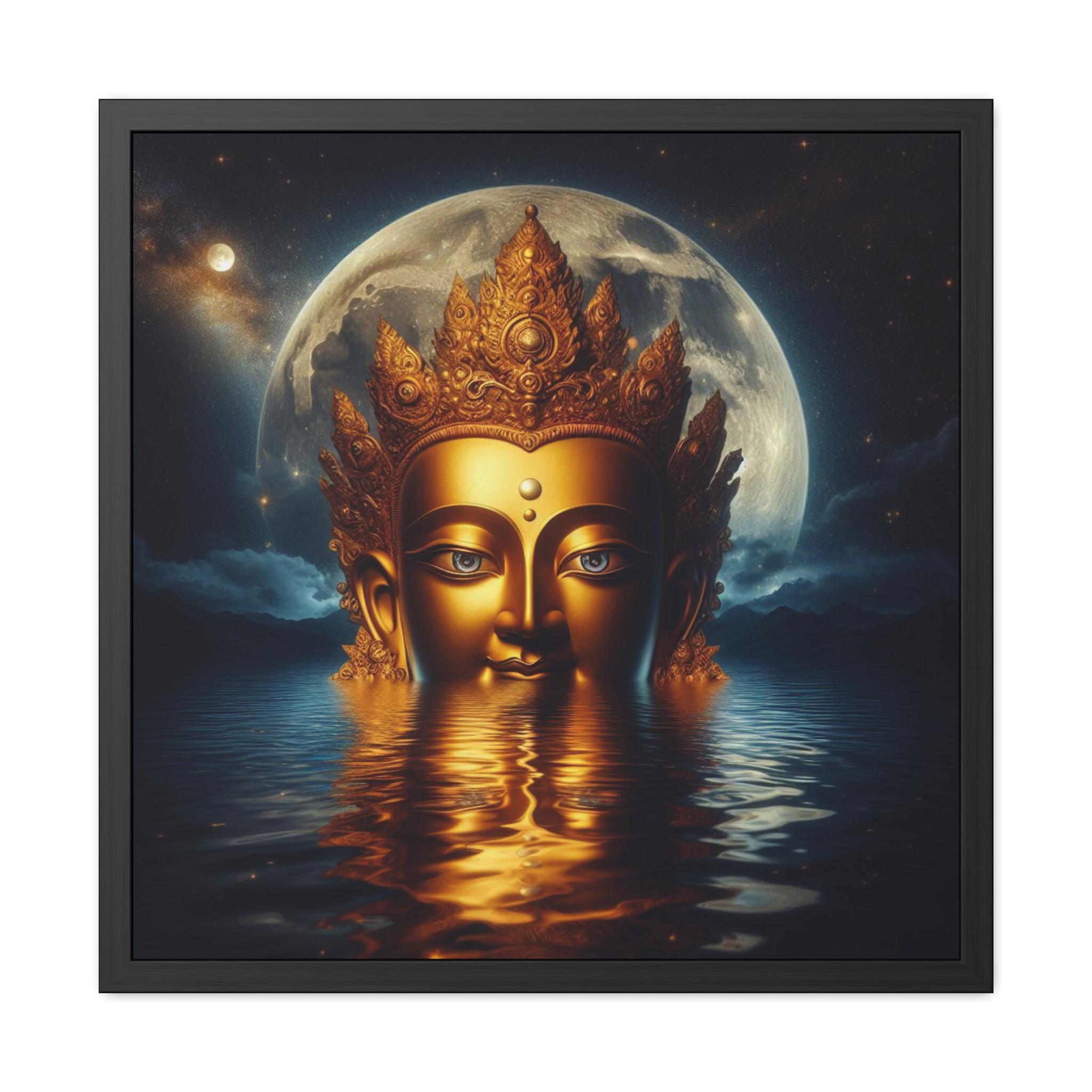 This radiant artwork honors Chenrezig, the Tibetan Bodhisattva of Infinite Compassion. Emerging from still waters beneath the luminous moon, the golden face of Chenrezig reflects boundless wisdom and the serene light of compassion that guides all beings toward liberation. The celestial background of stars and moon symbolizes the union of emptiness and clarity, while the water mirrors the awakened heart’s stillness. A sacred piece for meditation spaces, altars, or as a reminder of compassion’s transformative power in everyday life.