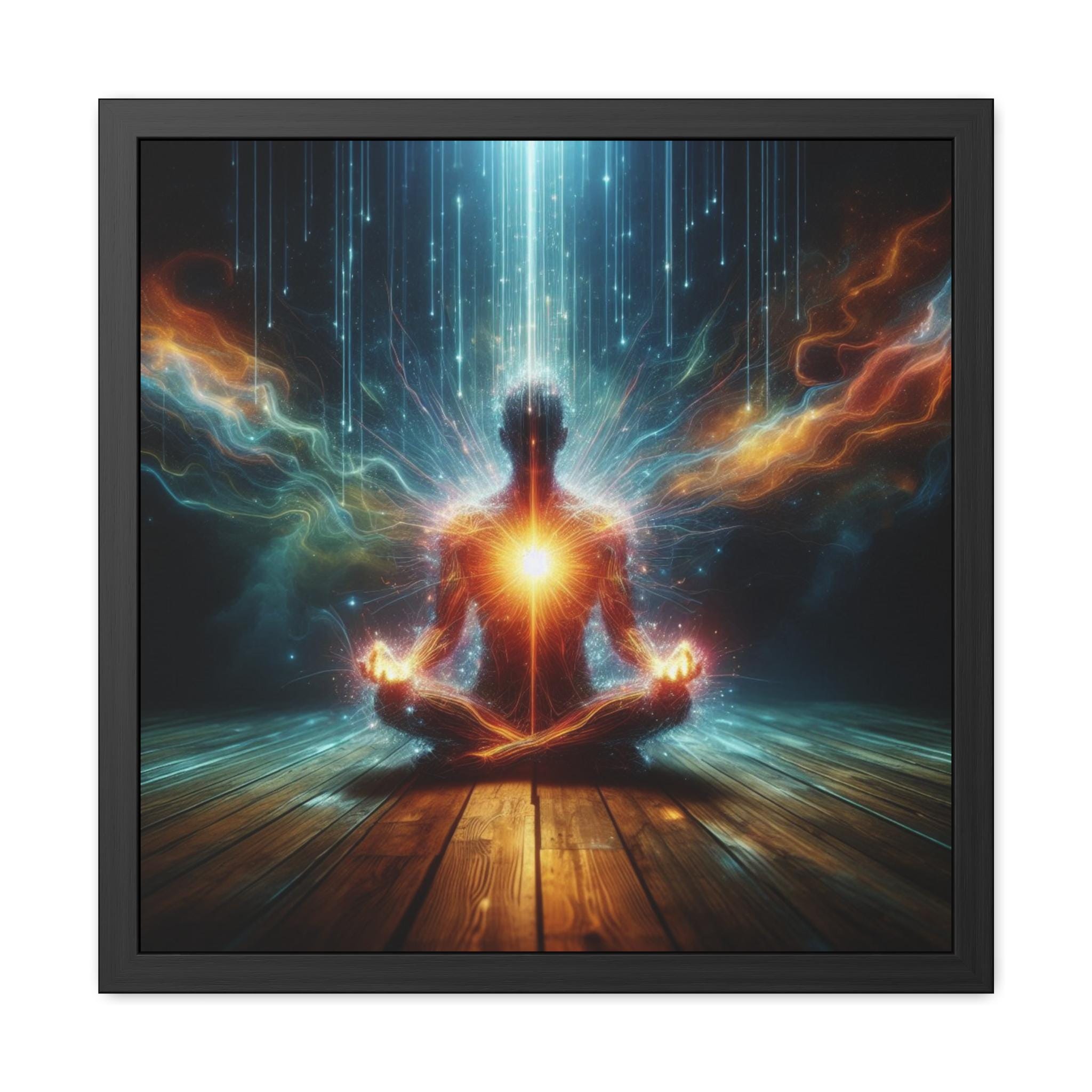 A radiant figure sits in meditation, heart illuminated and energy streams flowing through body and cosmos. This artwork symbolizes the power of welcoming intensity, embracing the force of life in its raw brilliance, and transforming it into clarity, strength, and spiritual expansion.