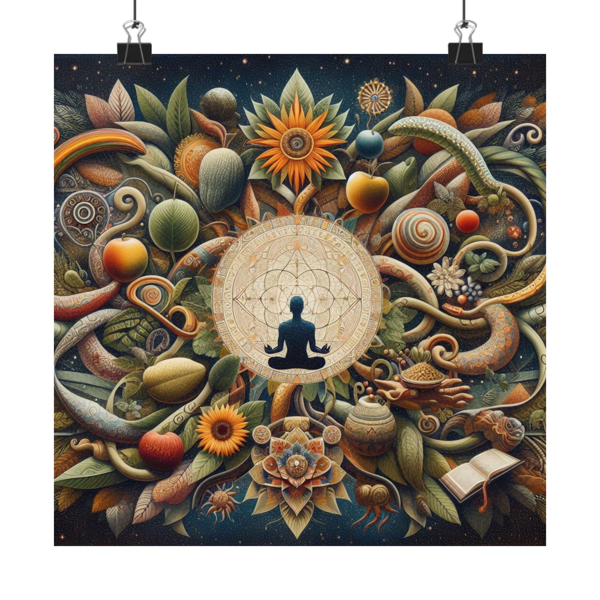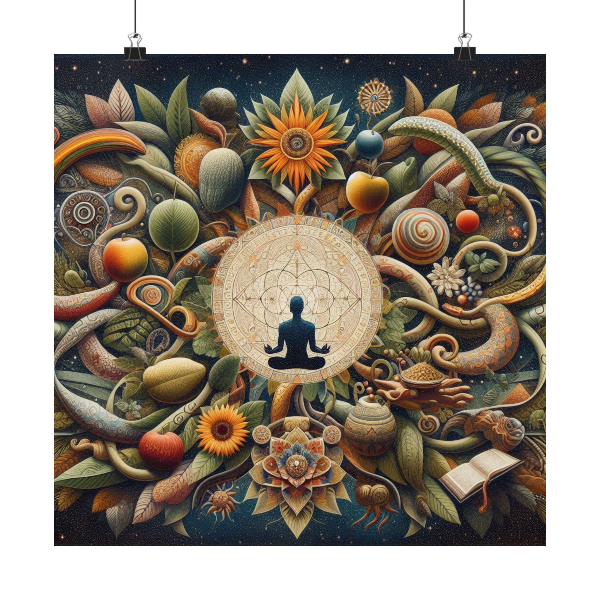 This visionary artwork reflects the profound merging of Ayahuasca consciousness with the timeless wisdom of Dzogchen. At the center, a meditator sits within a radiant mandala of awareness, surrounded by spiraling vines, sacred plants, fruits, and cosmic patterns. The vibrant jungle imagery symbolizes the Ayahuasca mind—fluid, interconnected, and alive—while the luminous stillness of the meditator embodies the Dzogchen view: awareness aware of itself. Together, they reveal the union of nature’s medicine and the natural state of being. A powerful piece for seekers exploring plant wisdom, meditation, and the boundless expanse of pure awareness.