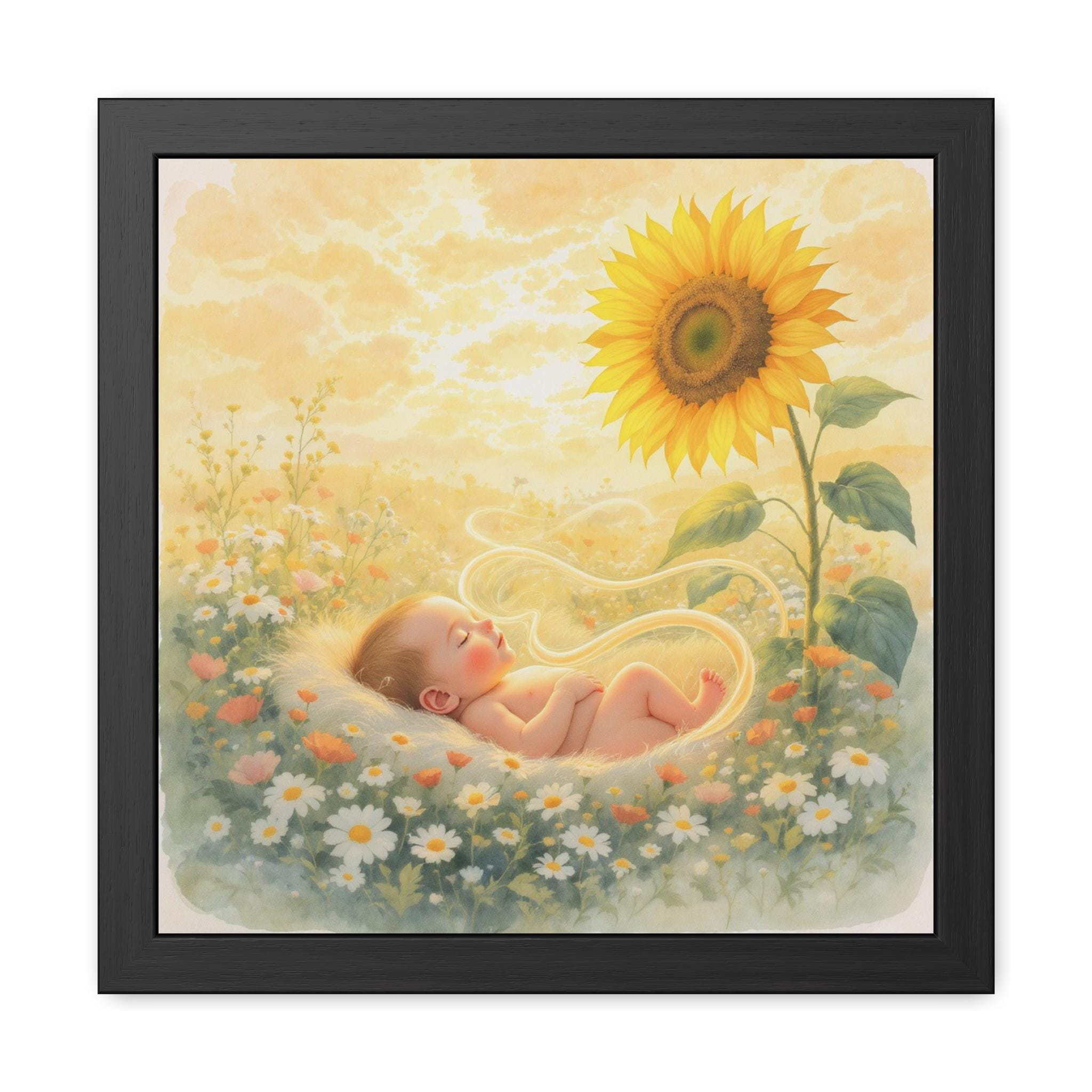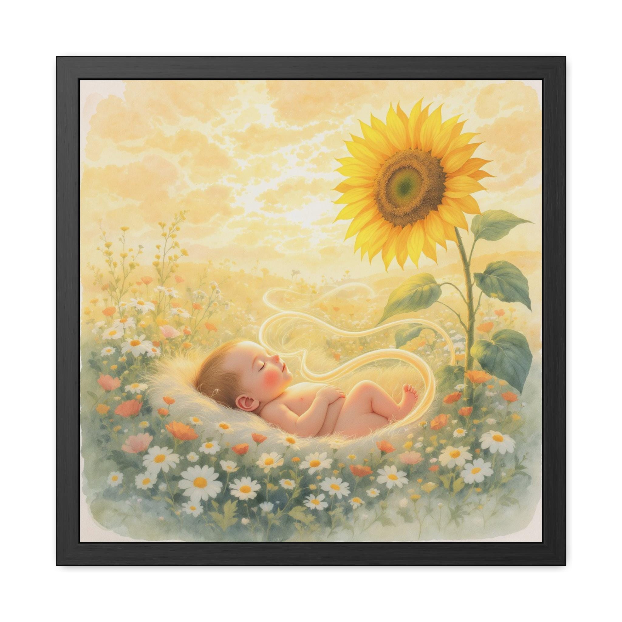 A newborn rests peacefully among wildflowers, embraced by the warmth of the sun and the towering presence of a sunflower. This artwork beautifully symbolizes the sacred bond between a child and Mother Nature, reminding us of our roots in the earth’s nurturing embrace and the cycles of life that sustain us all.