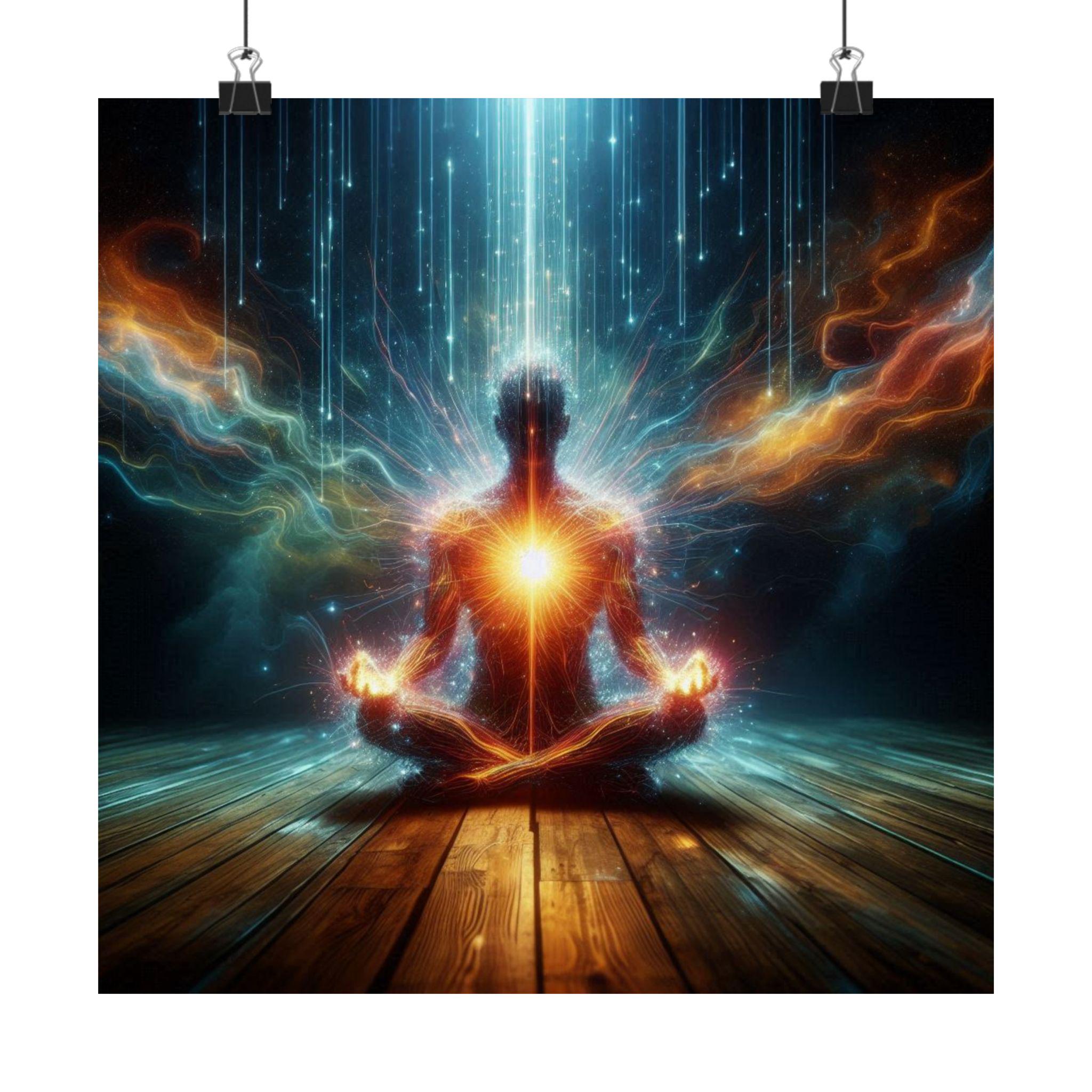 A radiant figure sits in meditation, heart illuminated and energy streams flowing through body and cosmos. This artwork symbolizes the power of welcoming intensity, embracing the force of life in its raw brilliance, and transforming it into clarity, strength, and spiritual expansion.