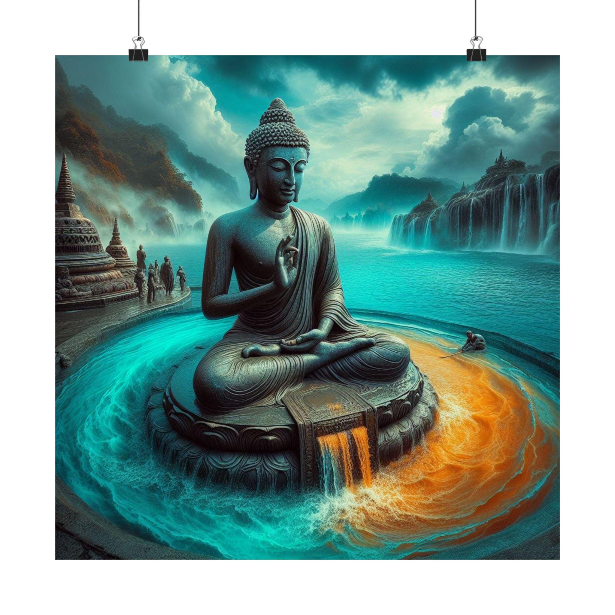 This captivating artwork portrays the Buddha seated in serene meditation at the heart of a radiant lotus fountain. From beneath him, streams of water flow—blue and orange currents merging in harmony—symbolizing the primordial element of water as both life-source and purifier. Behind, vast waterfalls cascade into mist, merging mountains, clouds, and rivers into a single boundless presence. The scene reflects the Dharma’s teaching that, like water, consciousness is ever-flowing, dissolving separation and returning all to unity. A perfect centerpiece for meditation rooms, yoga sanctuaries, or spiritual seekers drawn to the mystery of awakening.