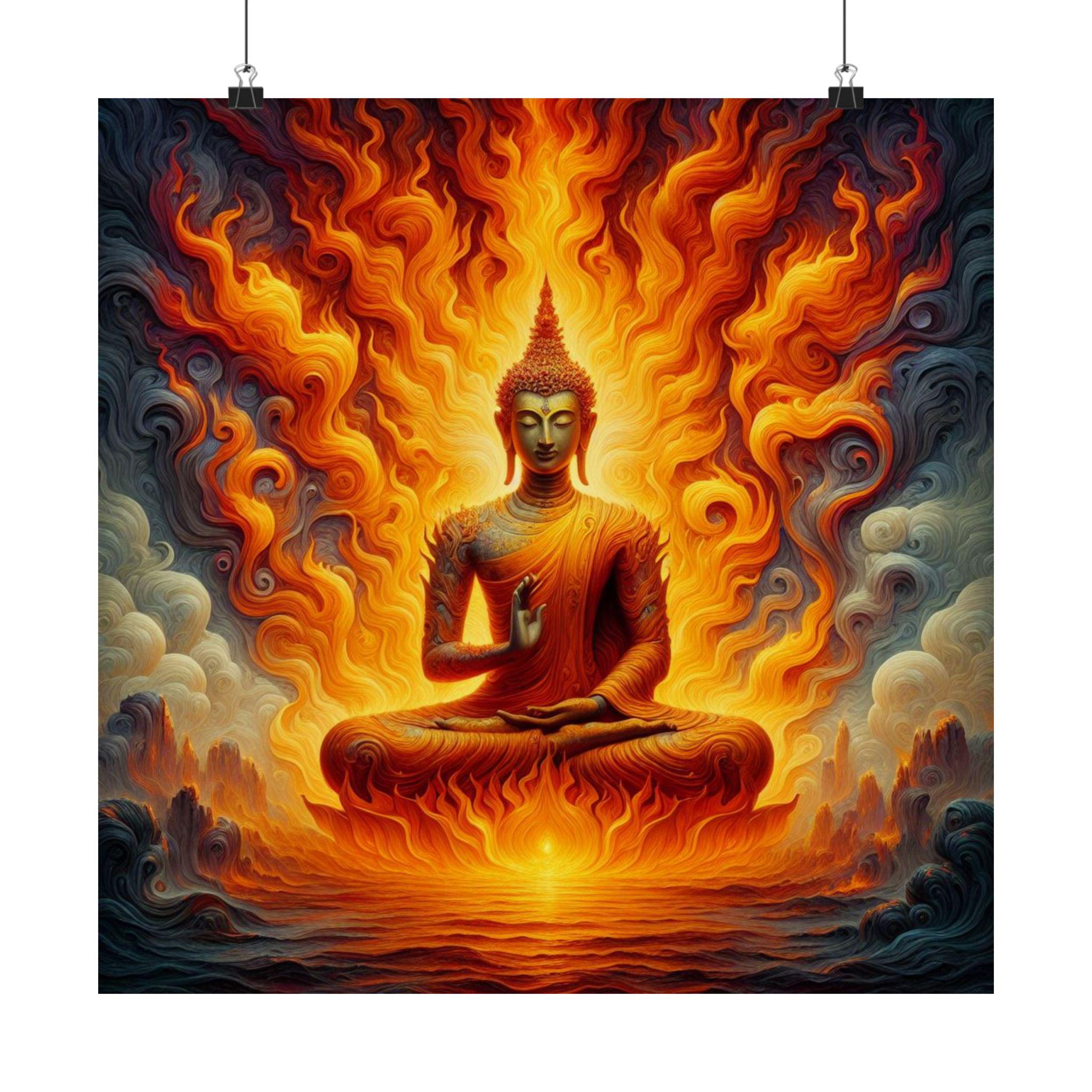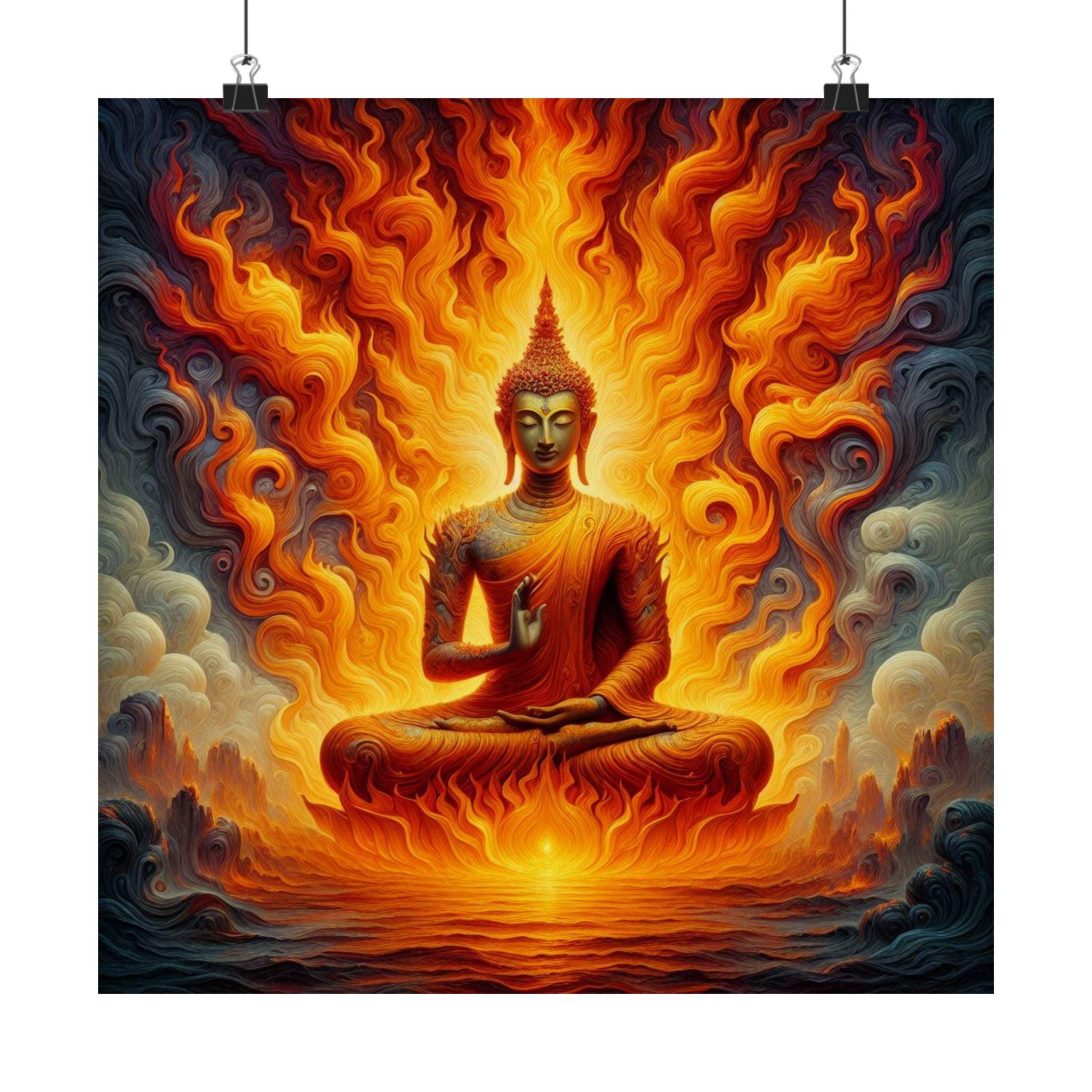 This luminous artwork depicts the Buddha seated in serene meditation, radiating amidst waves of living fire. Flames rise and swirl around him, merging with the clouds and sky, symbolizing the primordial element of fire—the force of transformation, purification, and illumination. The glowing mandala aura and fiery lotus beneath him embody the burning away of ignorance and the emergence of wisdom’s light. Set against a vast horizon of flame and ocean, this image reflects the union of elemental power and awakened presence. Perfect for meditation rooms, yoga spaces, or seekers drawn to the transformative essence of Dharma.
