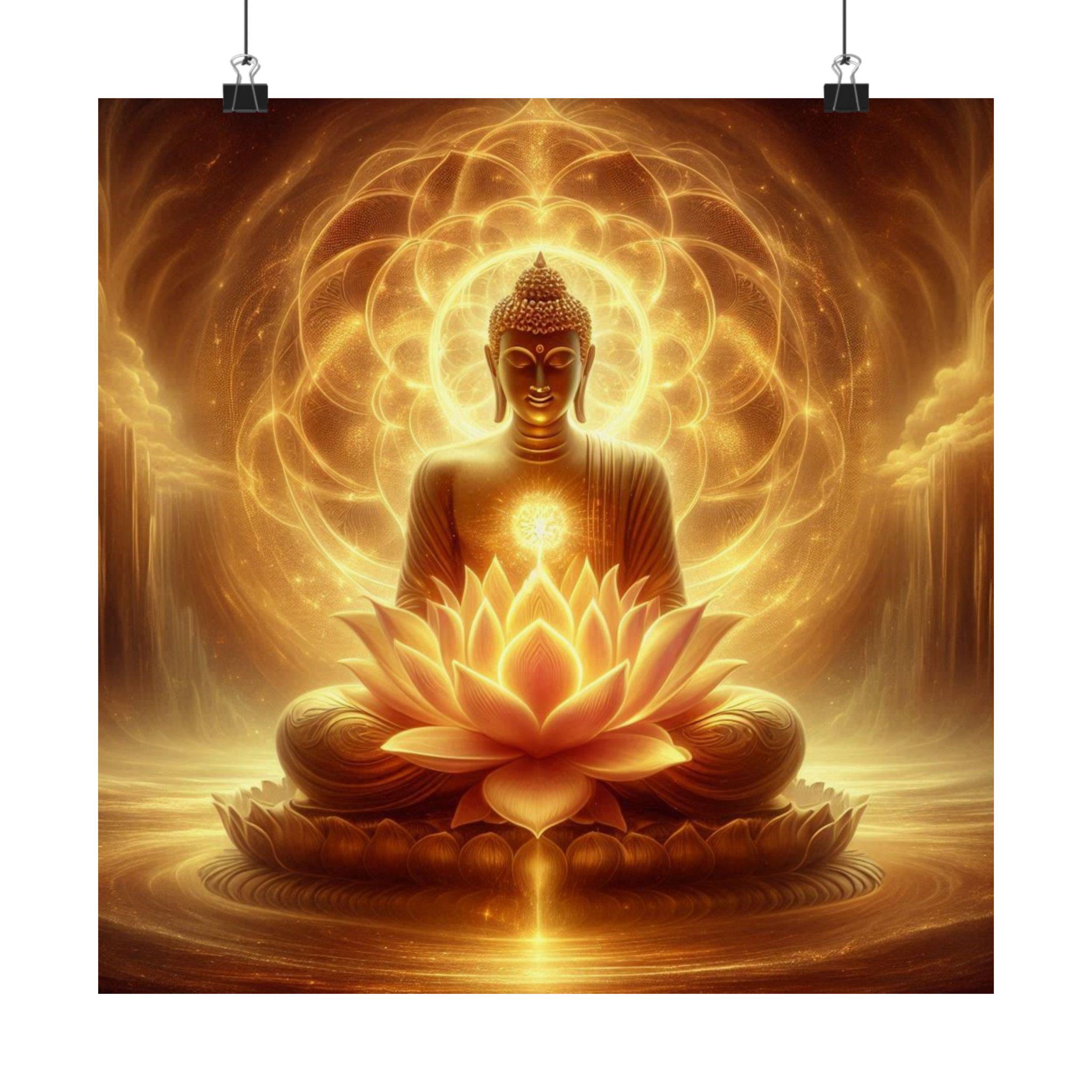 This mesmerizing artwork depicts the Buddha seated in radiant golden light upon a luminous lotus, symbolizing purity, awakening, and the timeless glow of enlightenment. Surrounded by sacred patterns of light, the Buddha radiates peace and inner wisdom, offering a reminder of stillness and divine presence. Perfect for meditation rooms, yoga spaces, or as an inspiring focal point, this piece brings harmony, serenity, and spiritual depth to any environment.