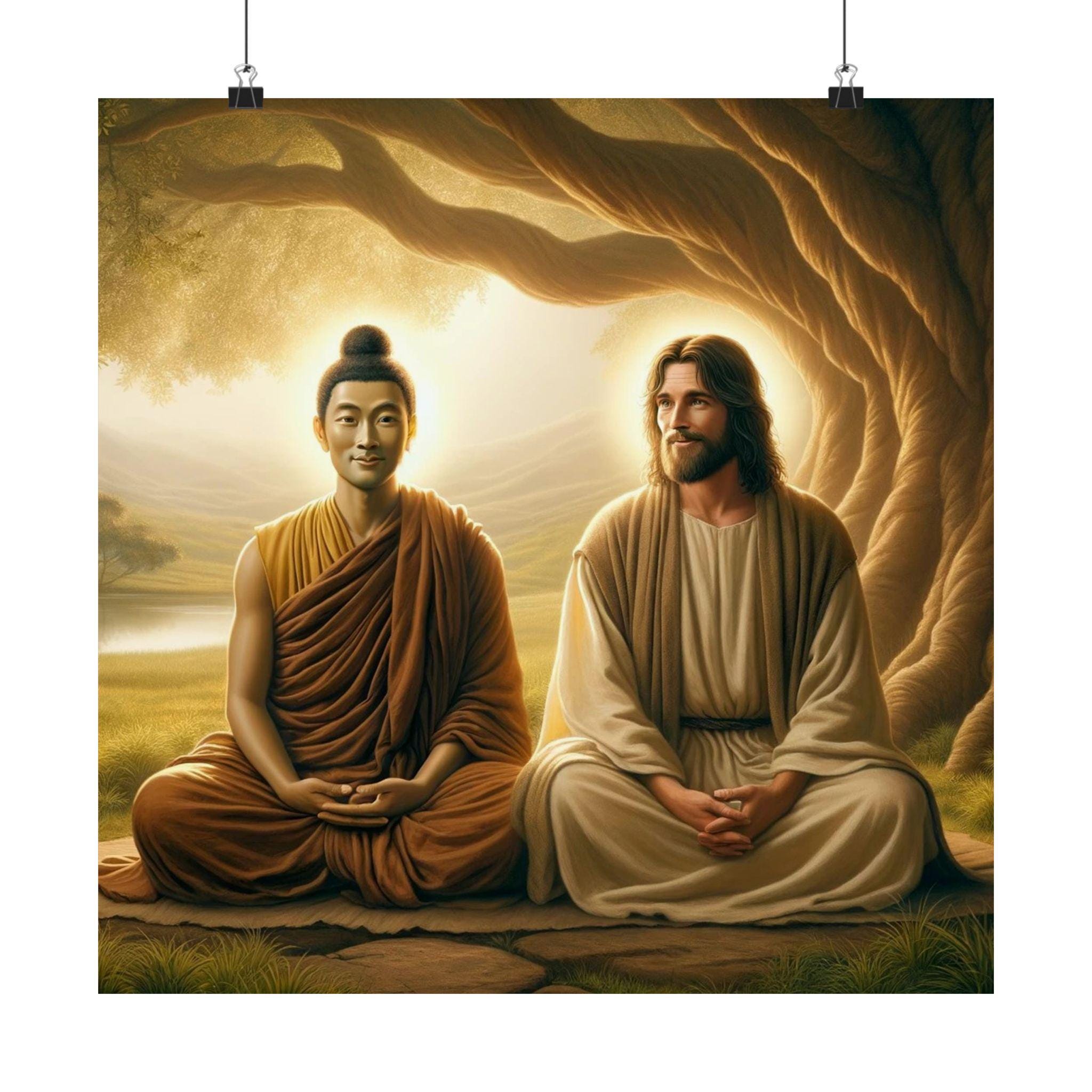 Bring quiet presence into your space with a matte vertical poster that pairs two of the world’s calmest figures — Buddha and Jesus — rendered in peaceful, meditative tones. The image reads like a shared breath: soft edges, balanced composition, and colors that settle rather than shout. Hang it where you pause — a reading nook, altar shelf, or beside a window that catches morning light. It helps shape a room into somewhere you slow down, reflect, and find a few steady moments during a busy day. The adult-oriented artwork invites contemplative practice and gentle solace, whether you live a life of ritual or are simply creating a calmer corner in your home.