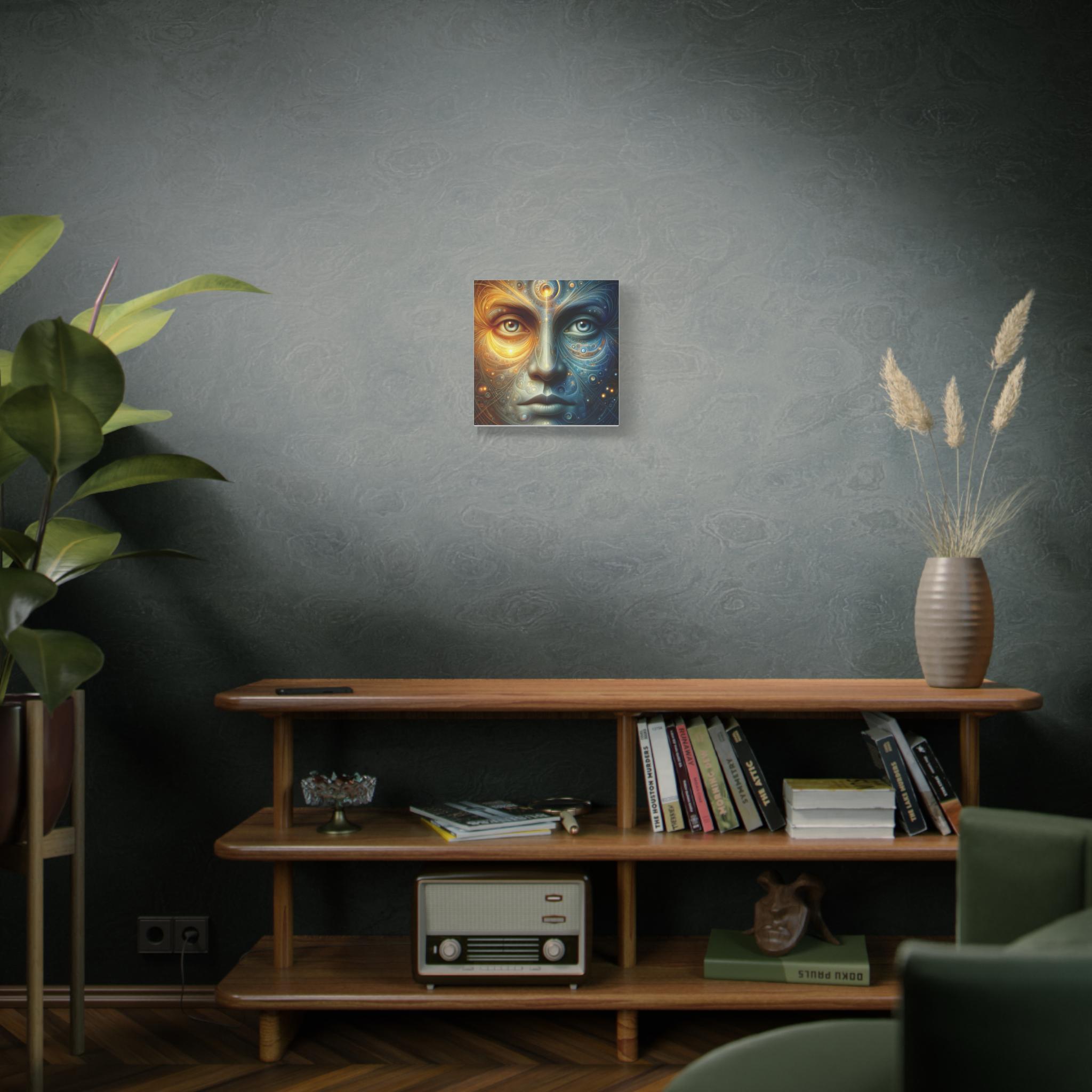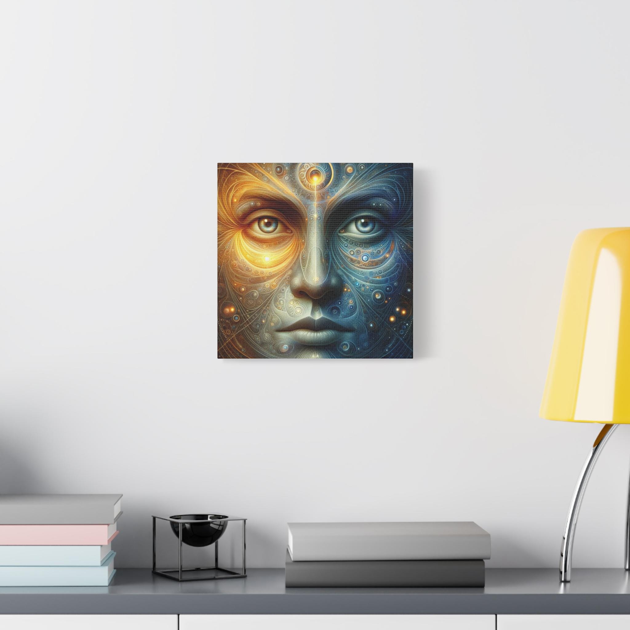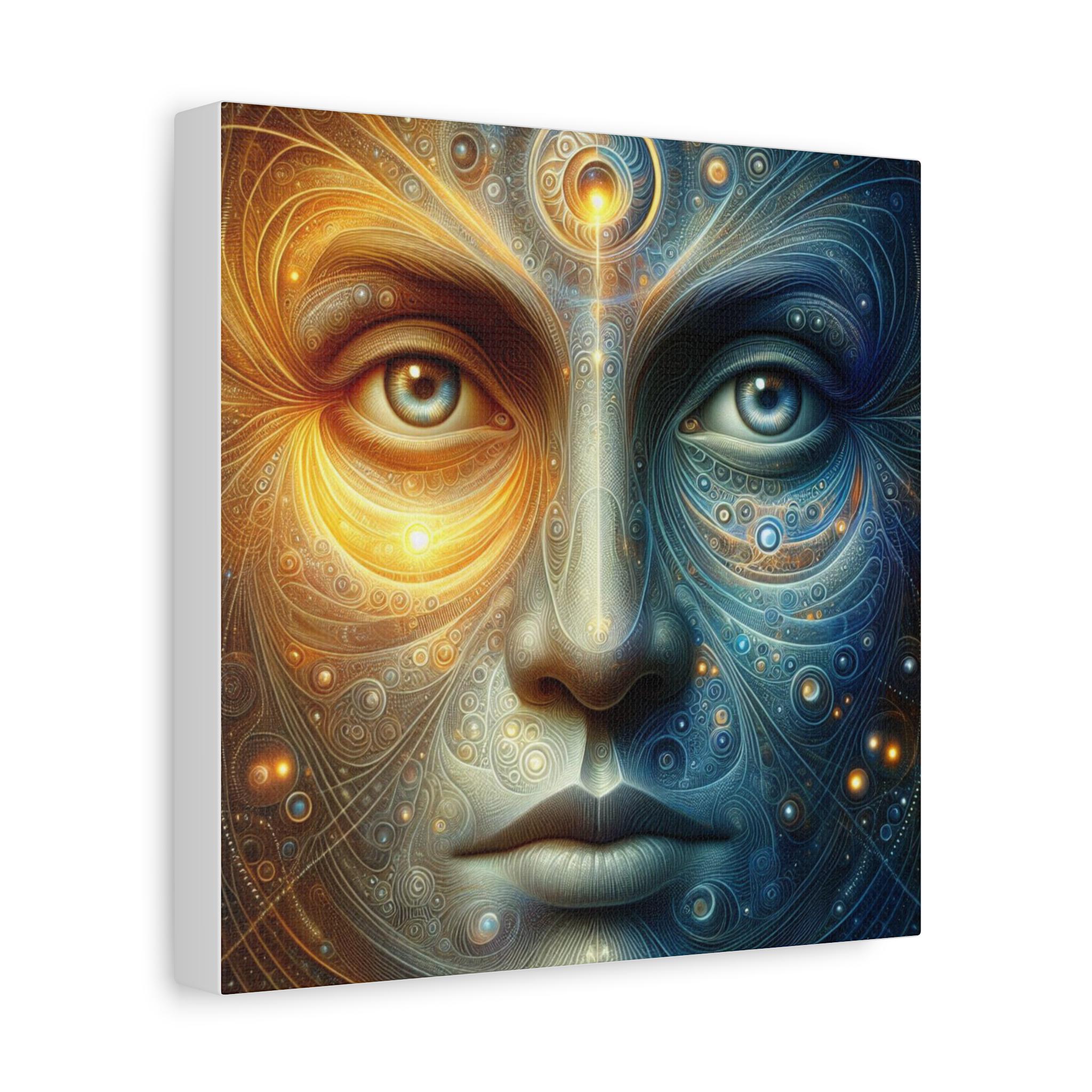 This stretched matte canvas brings a meditative presence to any wall. It portrays a serene, cosmic face split between radiant gold and deep celestial blue—two halves of one awakened presence. Every line, swirl, and luminous point pulses with quiet intelligence, like the universe sketching itself through consciousness. The gaze is unwavering: clear, steady, unshakeable.