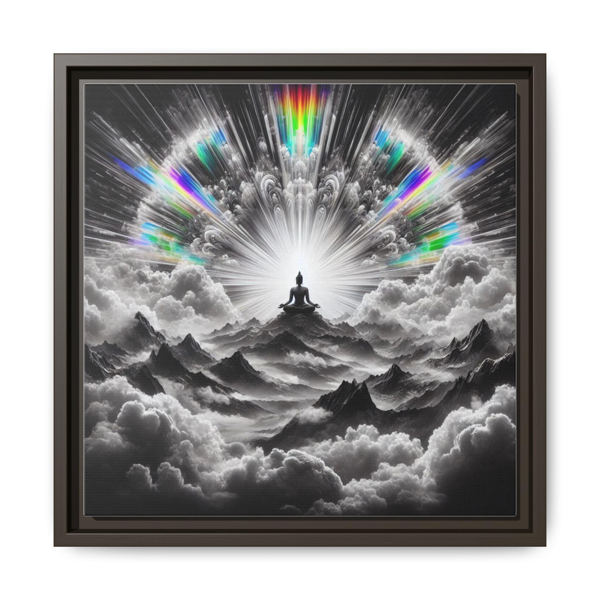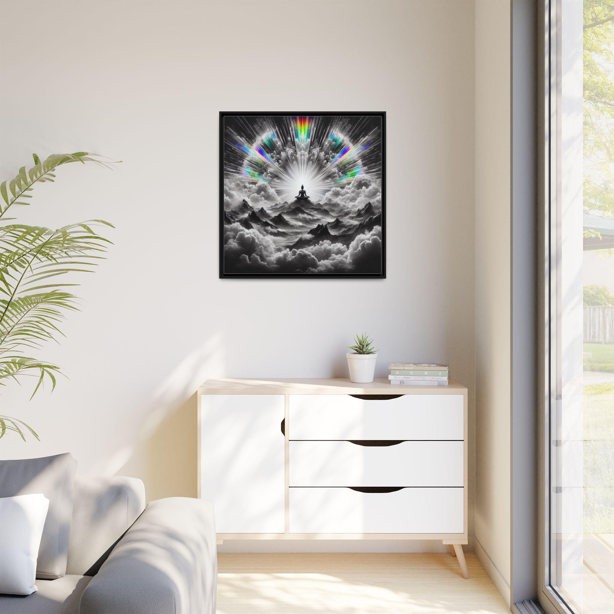 A framed matte canvas that brings quiet awe into a living space. Deep grayscale mountains and drifting clouds form a serene, meditative scene, while prismatic color rays crown the composition with surprising, luminous accents. The narrow black frame and crisp matte surface create a gallery-ready look that reads calm and contemplative from across the room. Hang it above a low altar, in a reading nook, or over a sofa to anchor a space with introspective energy and subtle, modern contrast.