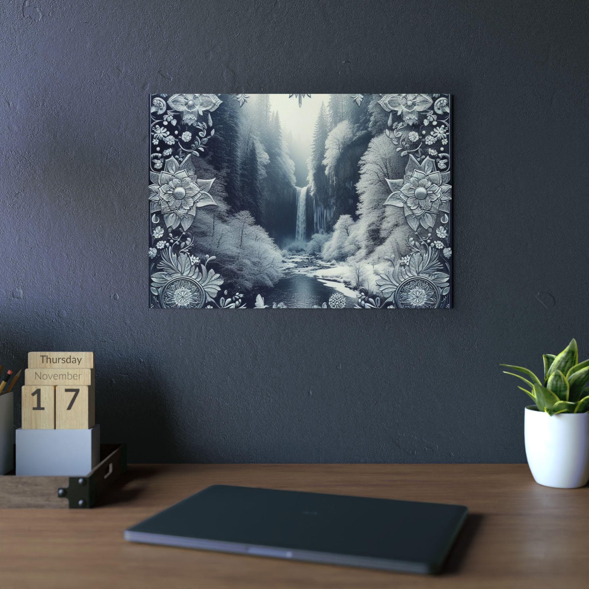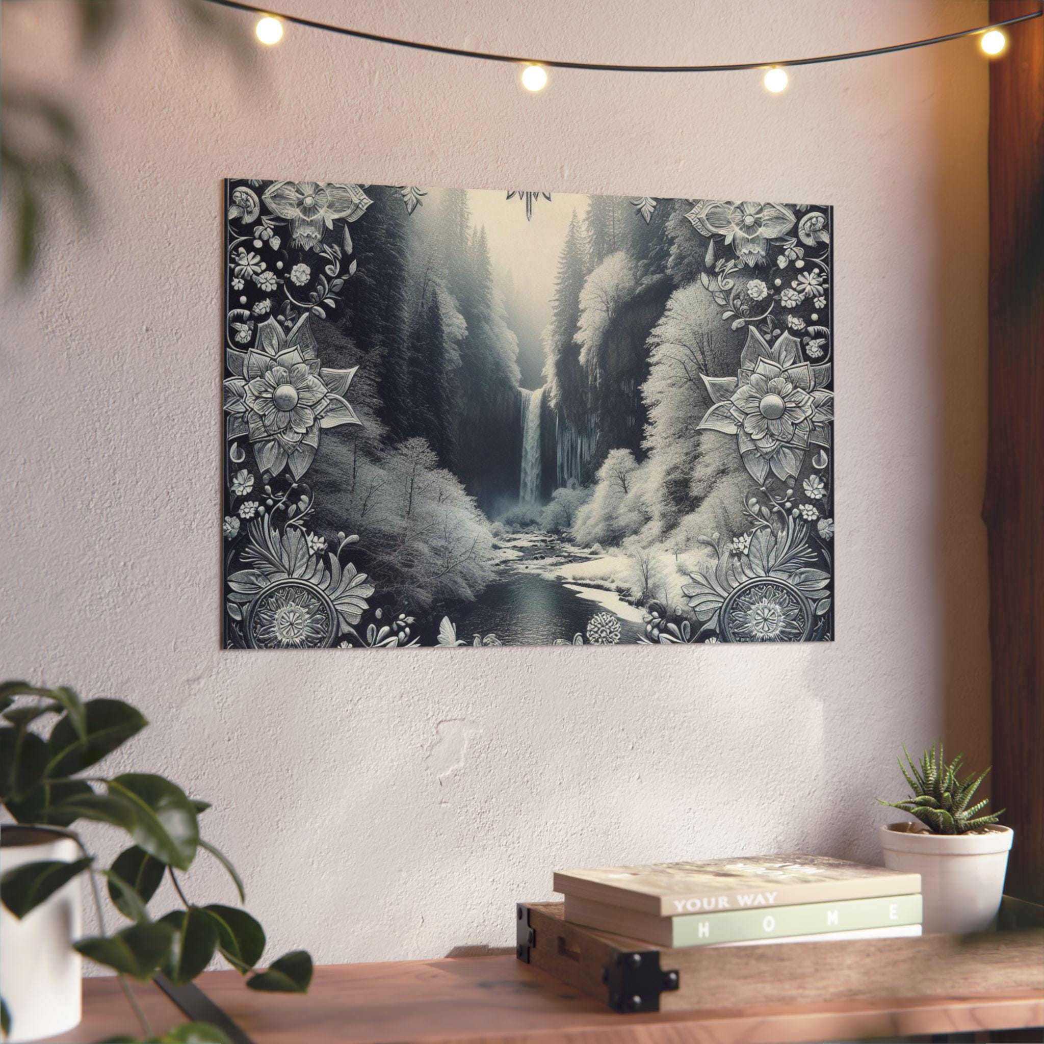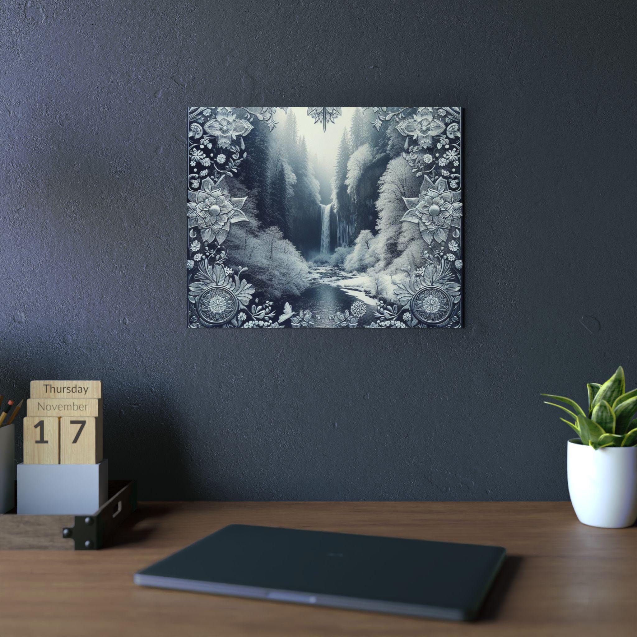 This slim aluminum art panel brings a quiet, meditative landscape into any room. Printed with deep monochrome tones and delicate ornamental borders, the matte finish reduces glare and emphasizes texture. Lightweight yet rigid, the 3mm composite holds its shape outdoors or inside and arrives ready to mount with a pre-attached metal hanger and soft bumpons for a stable, gap-forward display. Choose horizontal or vertical orientation and from seven sizes to fit a desk nook, gallery wall, or entryway — it sits confidently on a dark wall, drawing the eye to the waterfall’s gentle flow and the filigree framing that feels both vintage and modern.