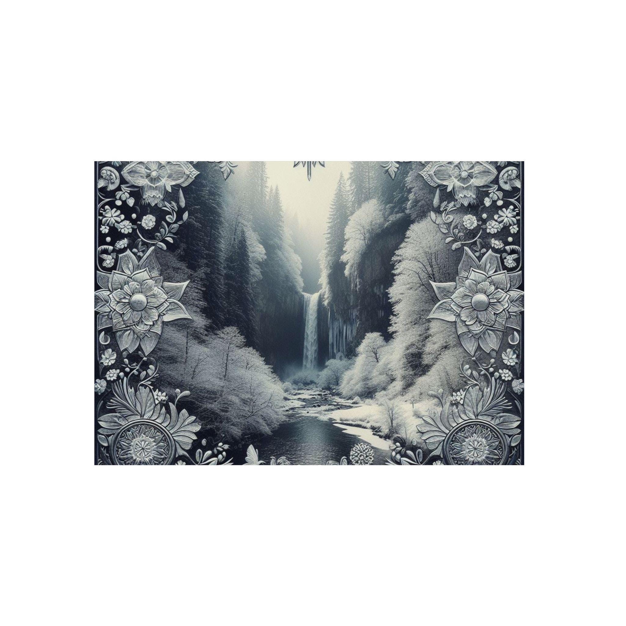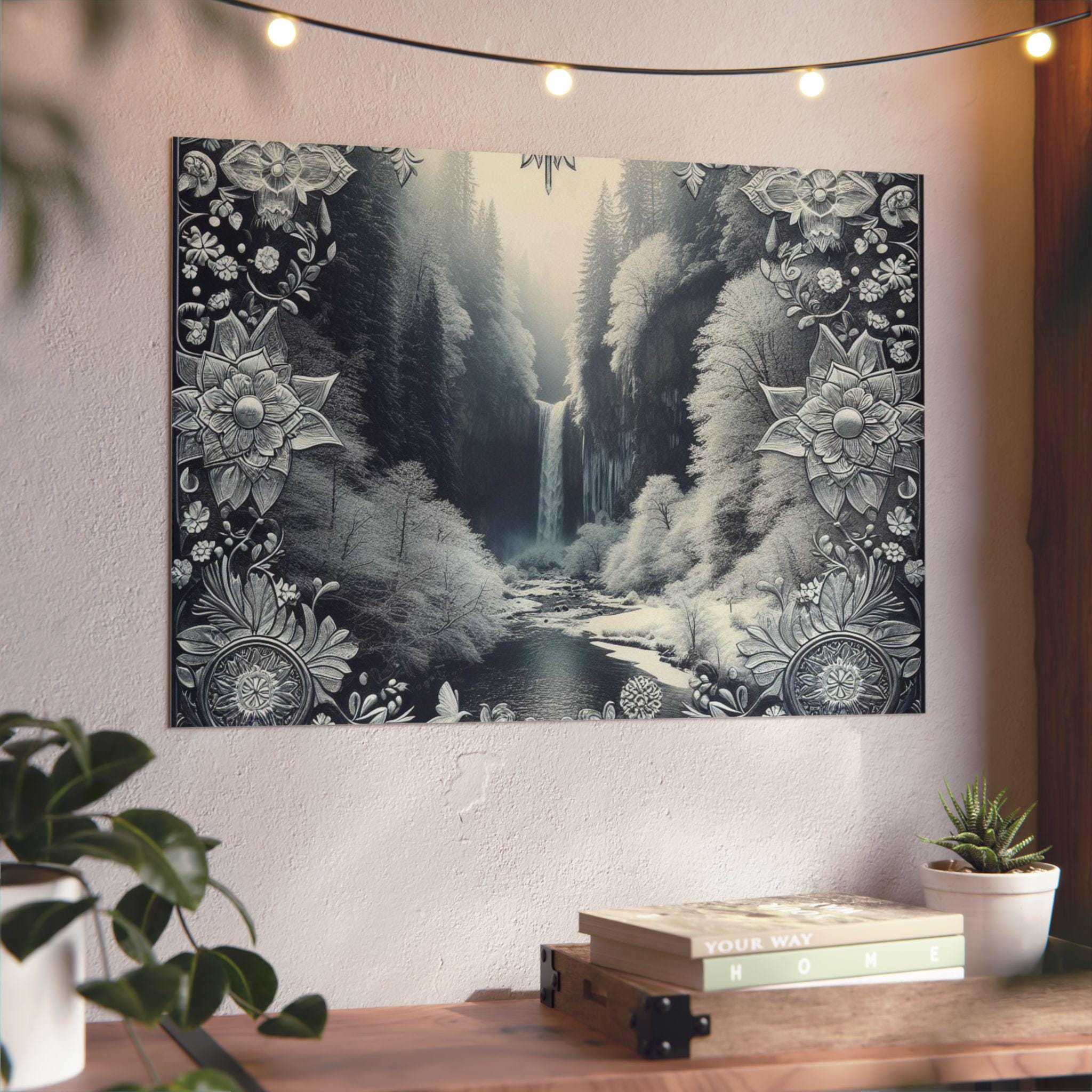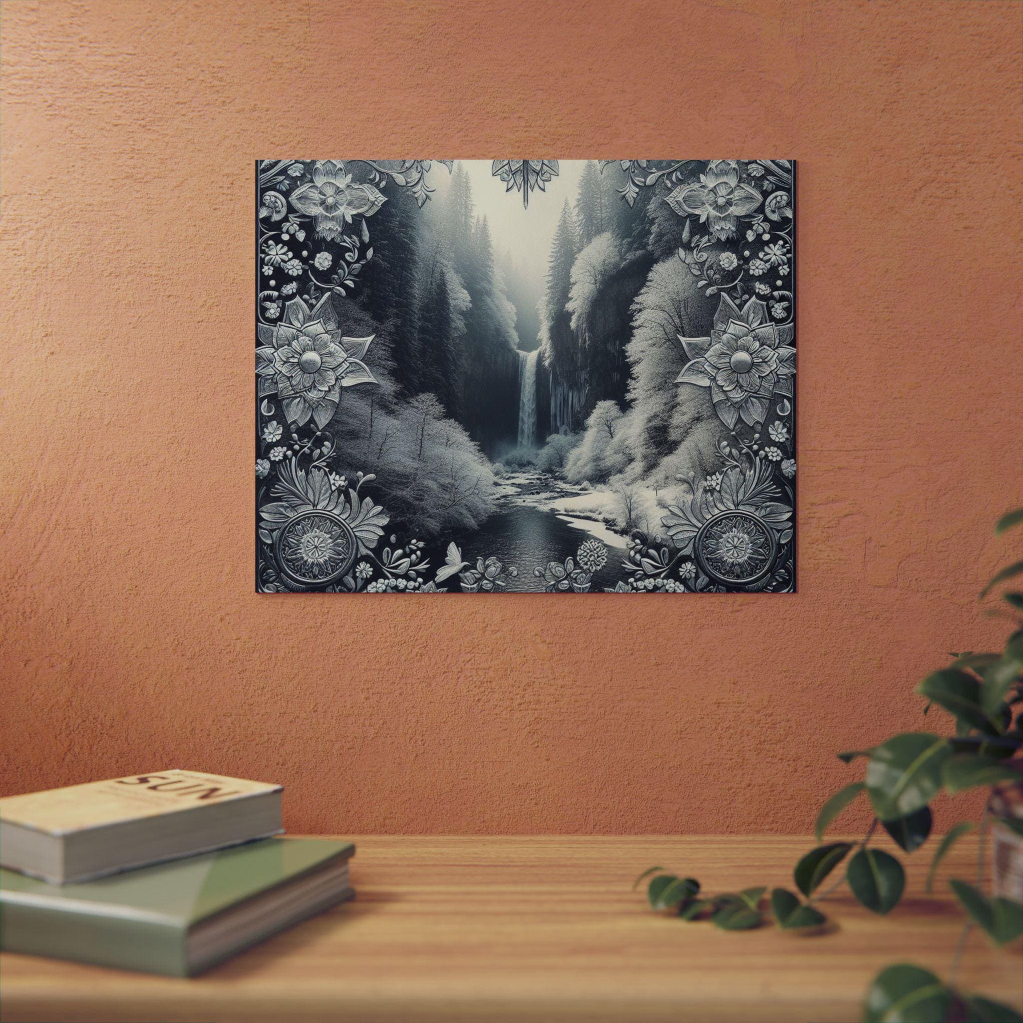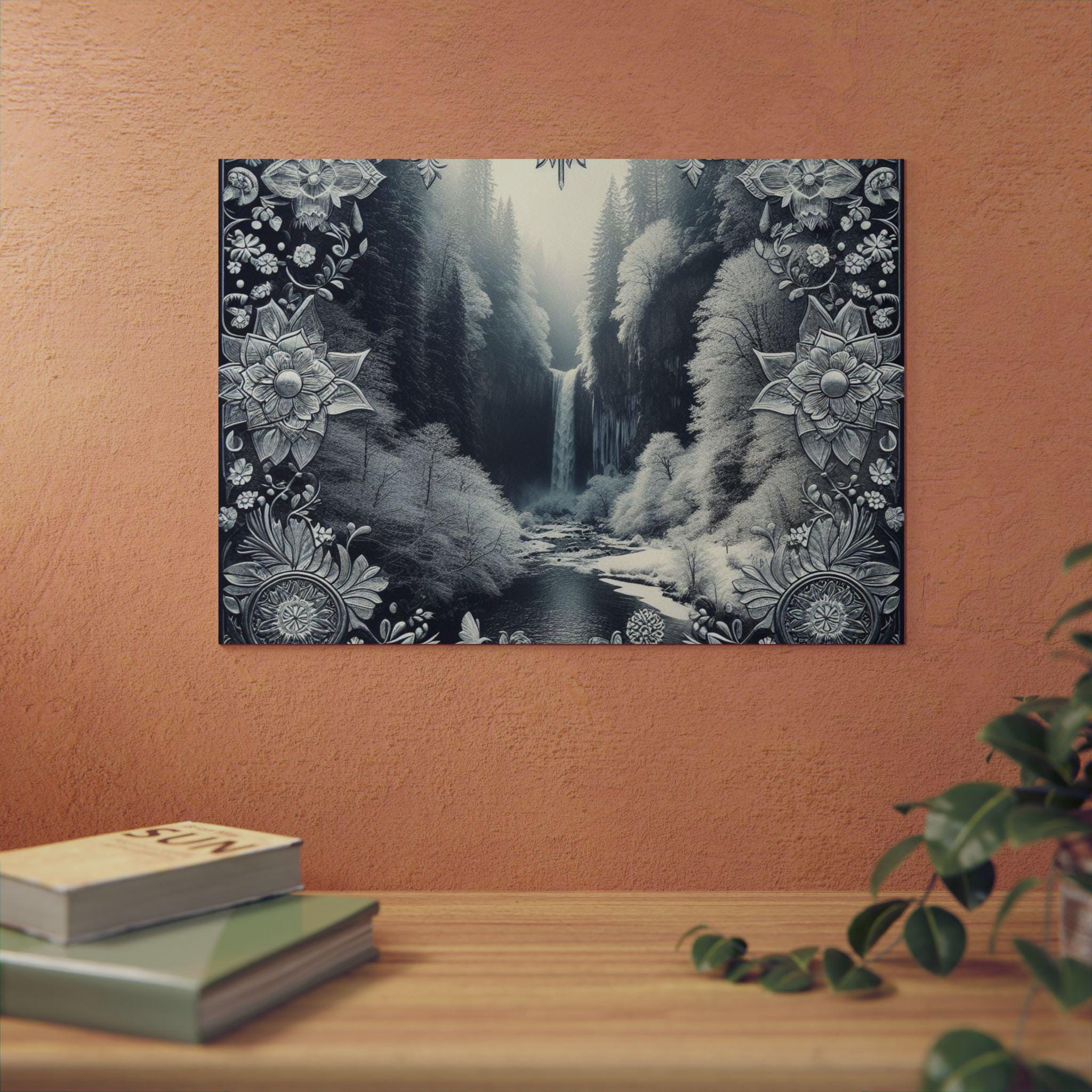 This slim aluminum art panel brings a quiet, meditative landscape into any room. Printed with deep monochrome tones and delicate ornamental borders, the matte finish reduces glare and emphasizes texture. Lightweight yet rigid, the 3mm composite holds its shape outdoors or inside and arrives ready to mount with a pre-attached metal hanger and soft bumpons for a stable, gap-forward display. Choose horizontal or vertical orientation and from seven sizes to fit a desk nook, gallery wall, or entryway — it sits confidently on a dark wall, drawing the eye to the waterfall’s gentle flow and the filigree framing that feels both vintage and modern.