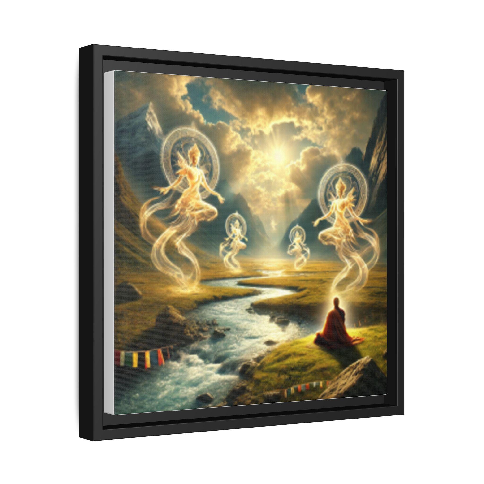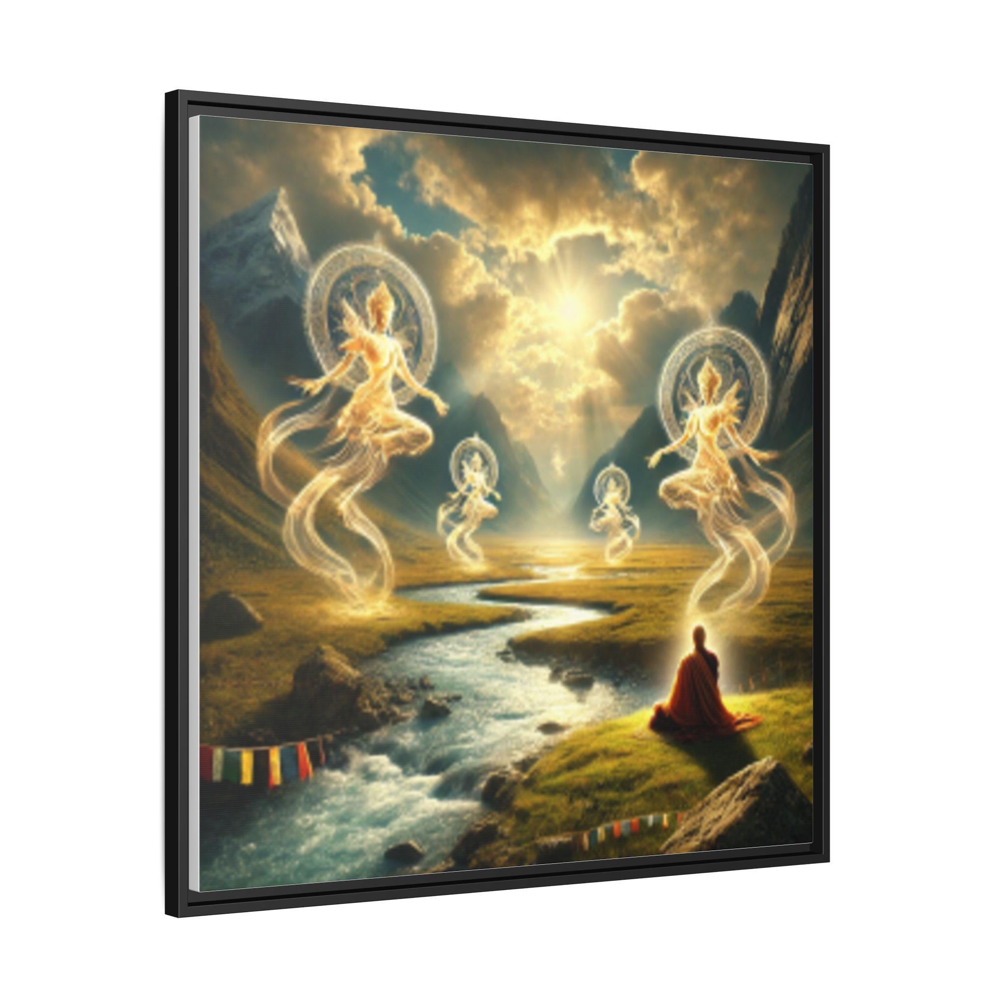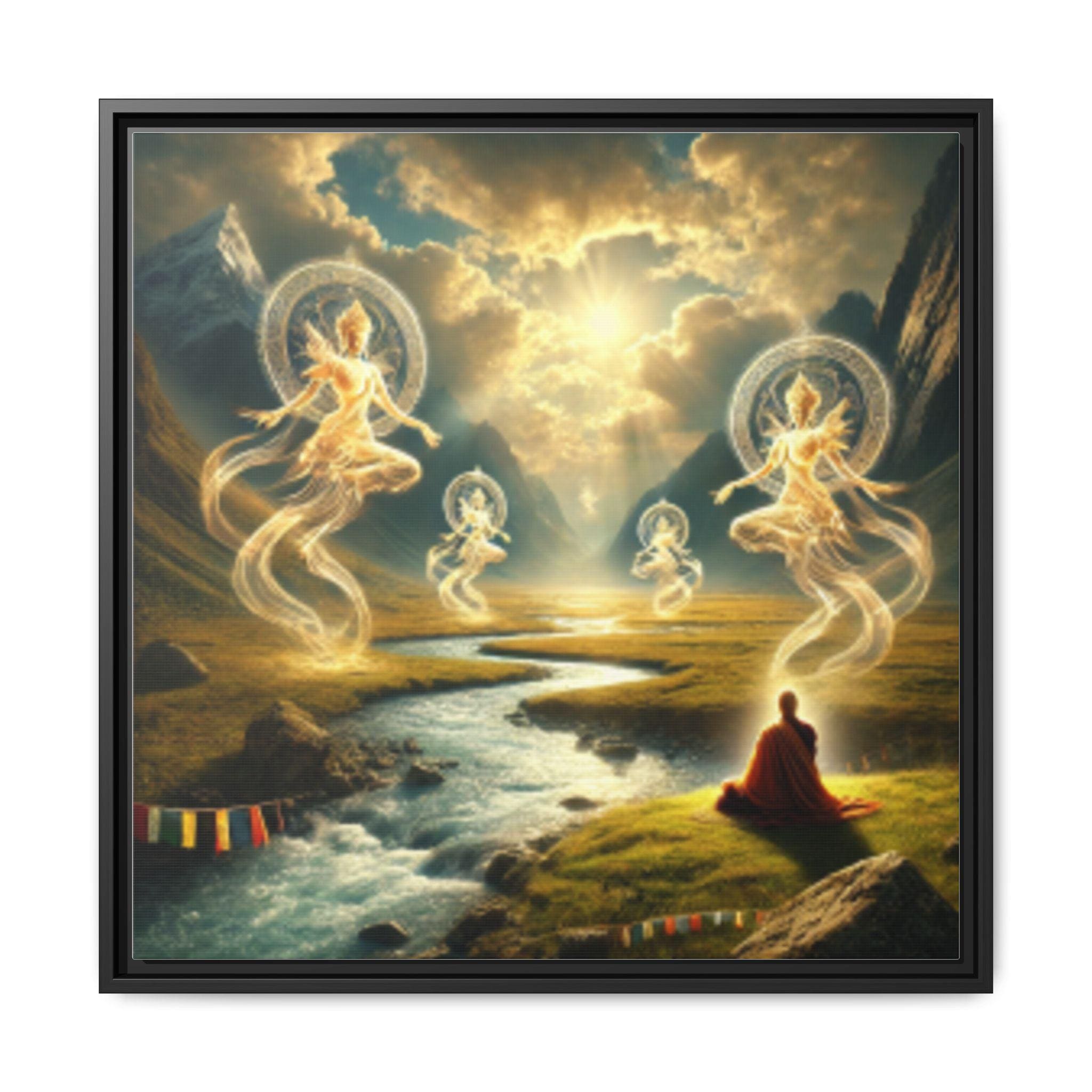 A framed matte canvas print This artwork embodies the Tibetan understanding of drala—the elemental, awakened presence that reveals itself when the mind stops struggling and the world shows its true face. A solitary meditator sits at the riverbank, fully open, fully present. From the flowing water and sun-pierced clouds arise radiant drala beings—forms made of light, wind, and pure awareness.
