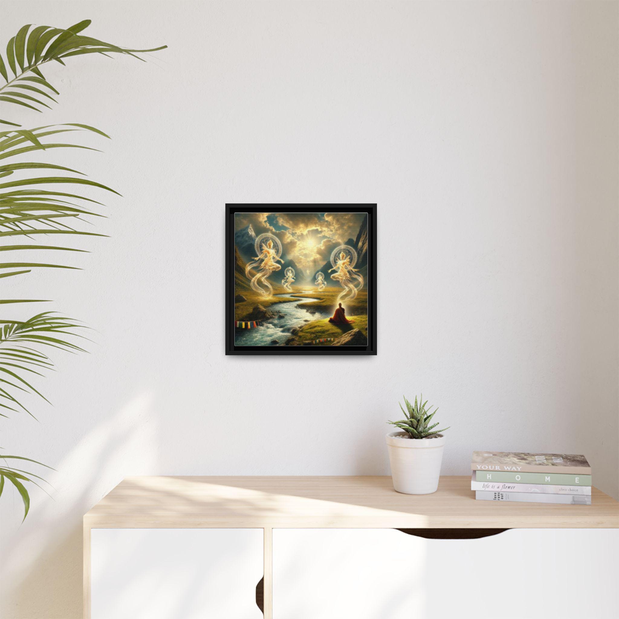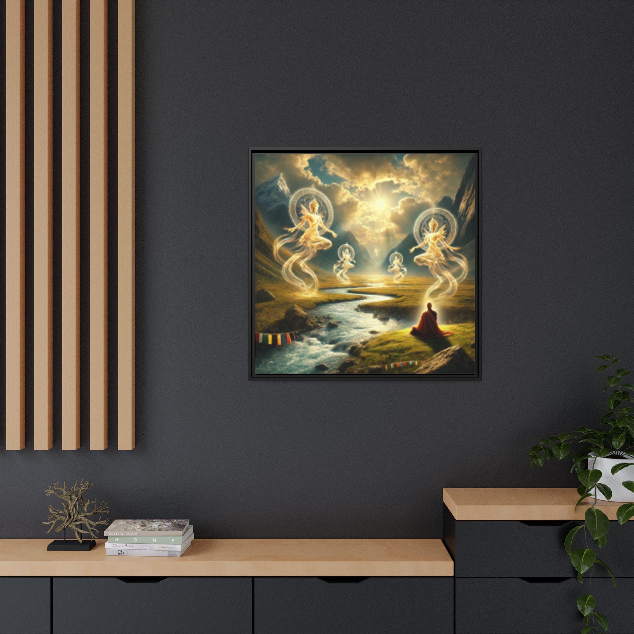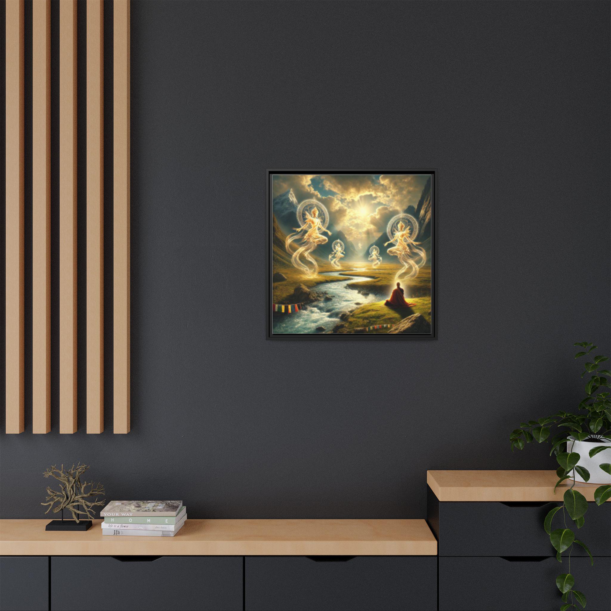 A framed matte canvas print This artwork embodies the Tibetan understanding of drala—the elemental, awakened presence that reveals itself when the mind stops struggling and the world shows its true face. A solitary meditator sits at the riverbank, fully open, fully present. From the flowing water and sun-pierced clouds arise radiant drala beings—forms made of light, wind, and pure awareness.