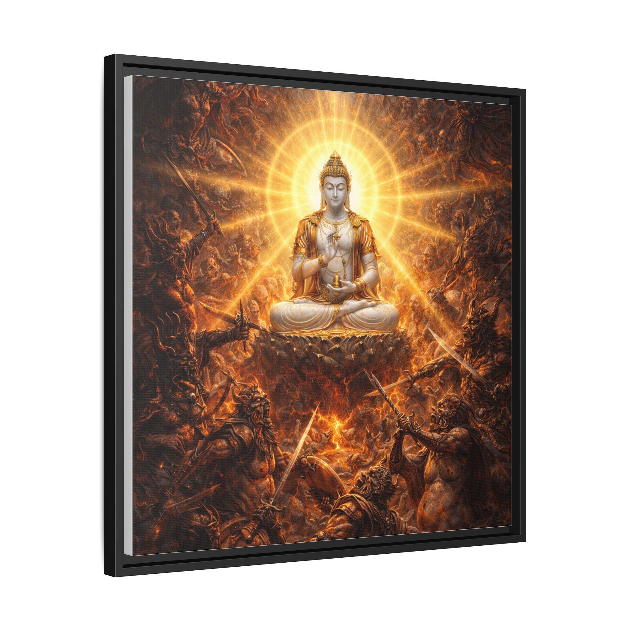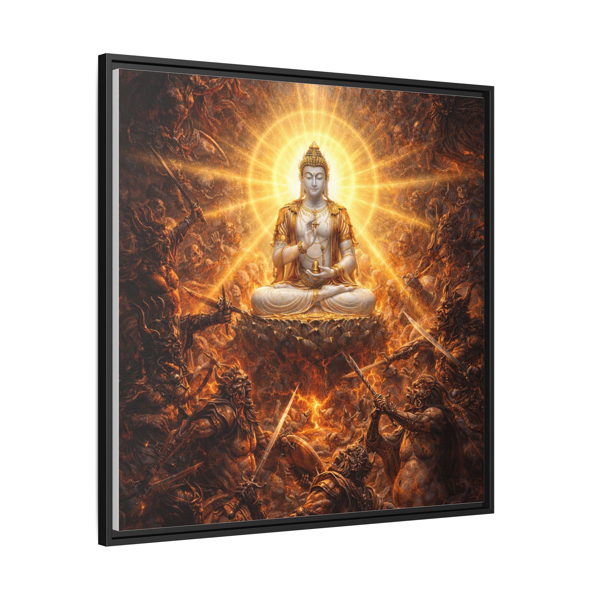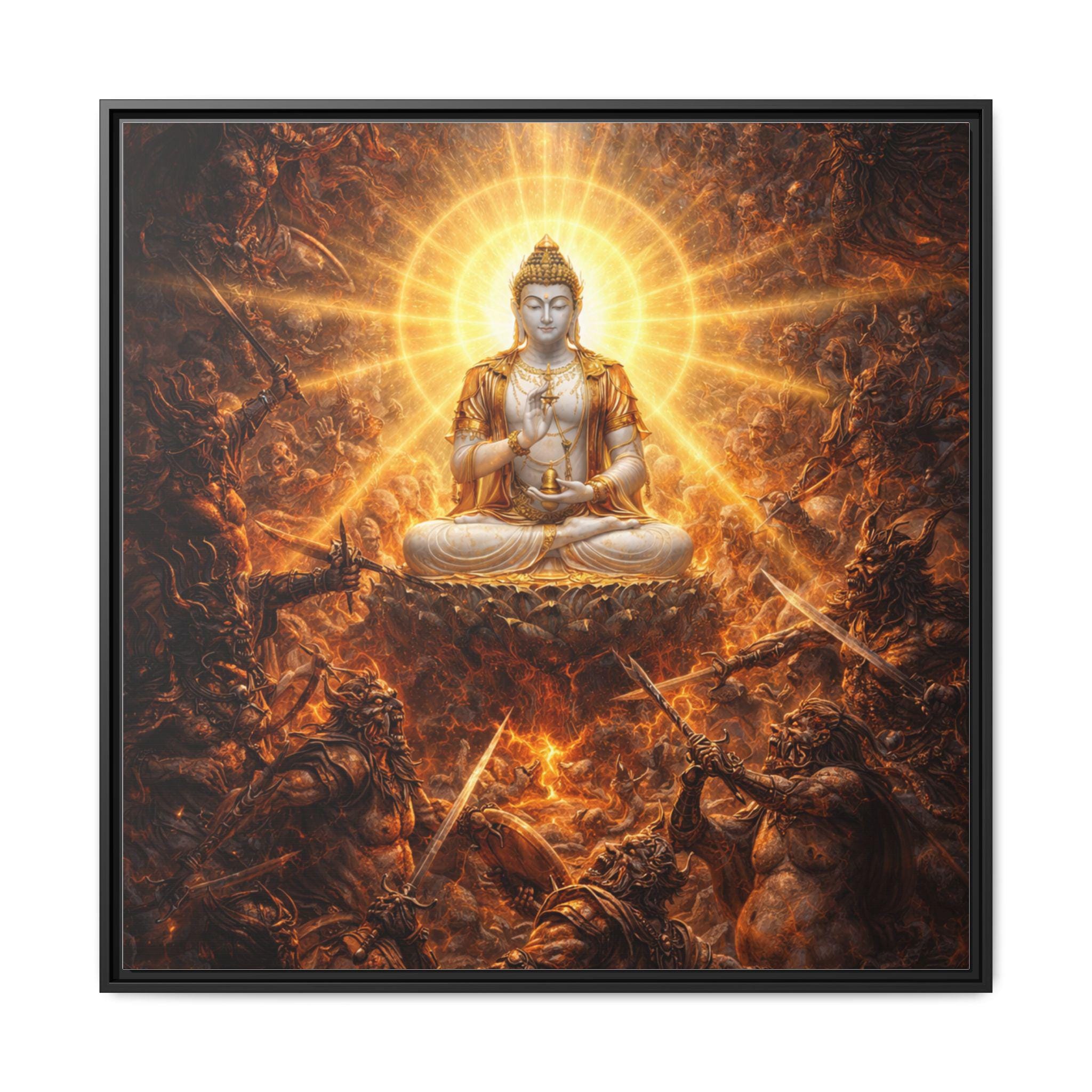 Amid a storm of cosmic pride and endless battle, the Warring Gods clash in a furious struggle for power — each trapped in their own narcissistic craving for dominance. At the very heart of the battlefield sits Vajrasattva Buddha in radiant stillness, untouched by violence, pouring out waves of compassion in every direction. His luminous presence reminds even the most powerful — and the most tormented — that peace, humility, and awakening are always possible, even in the midst of celestial war.
