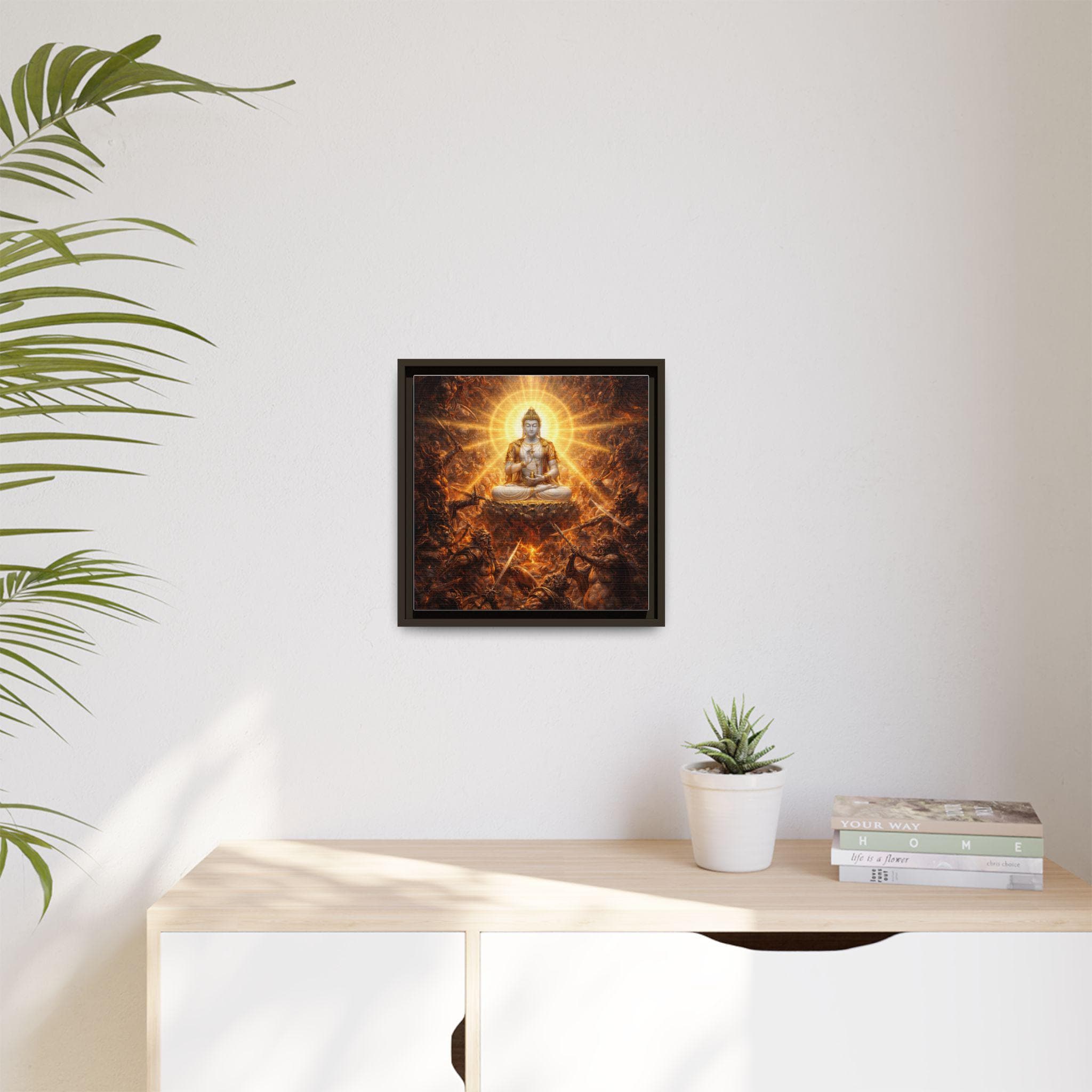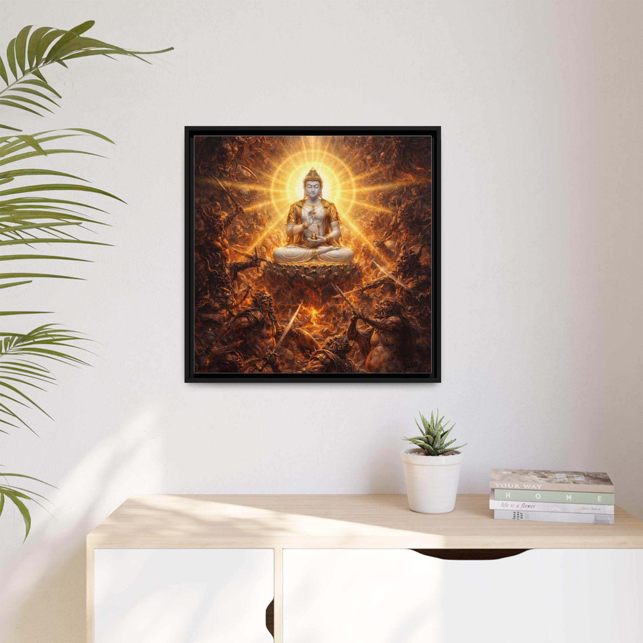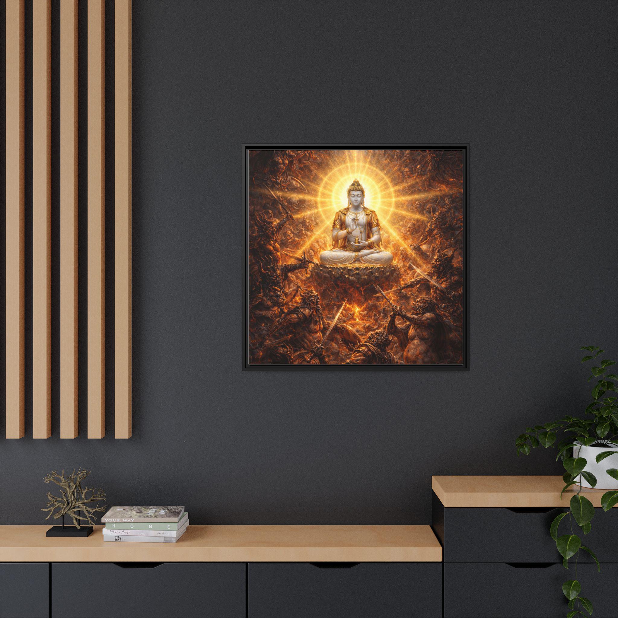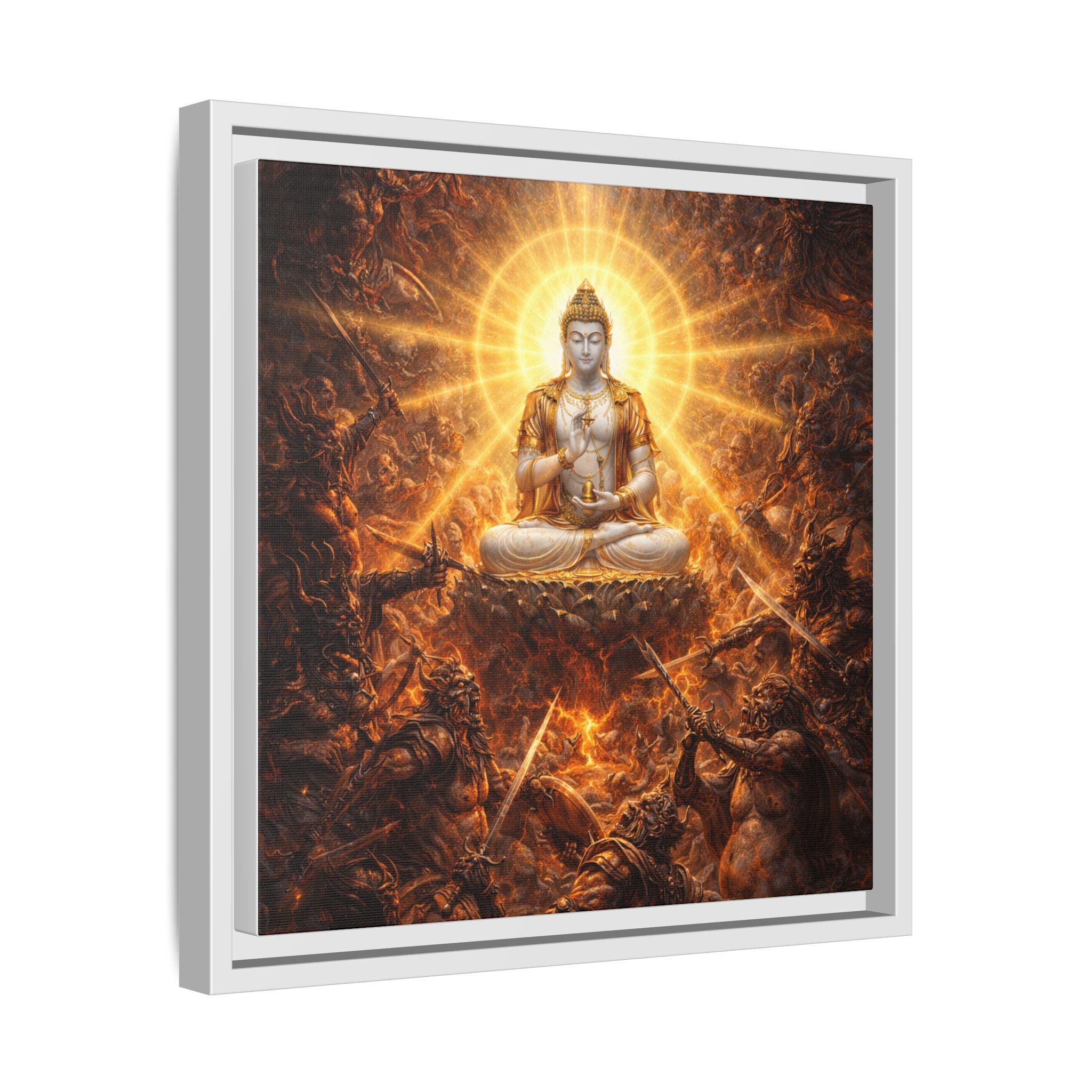 Amid a storm of cosmic pride and endless battle, the Warring Gods clash in a furious struggle for power — each trapped in their own narcissistic craving for dominance. At the very heart of the battlefield sits Vajrasattva Buddha in radiant stillness, untouched by violence, pouring out waves of compassion in every direction. His luminous presence reminds even the most powerful — and the most tormented — that peace, humility, and awakening are always possible, even in the midst of celestial war.