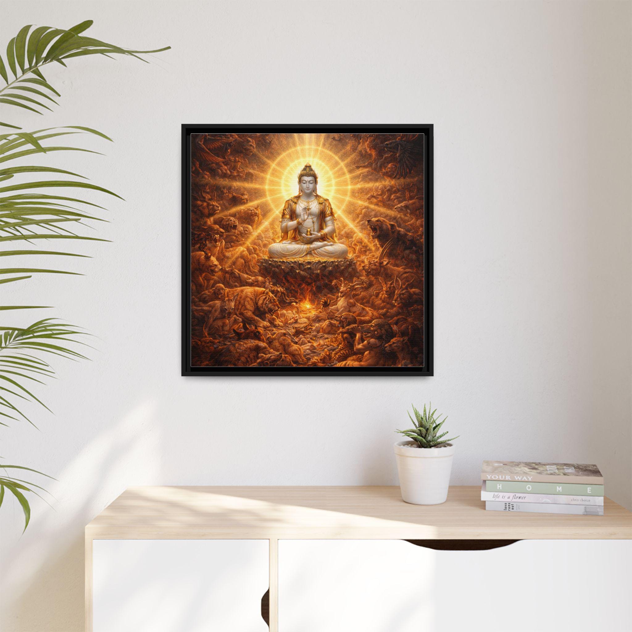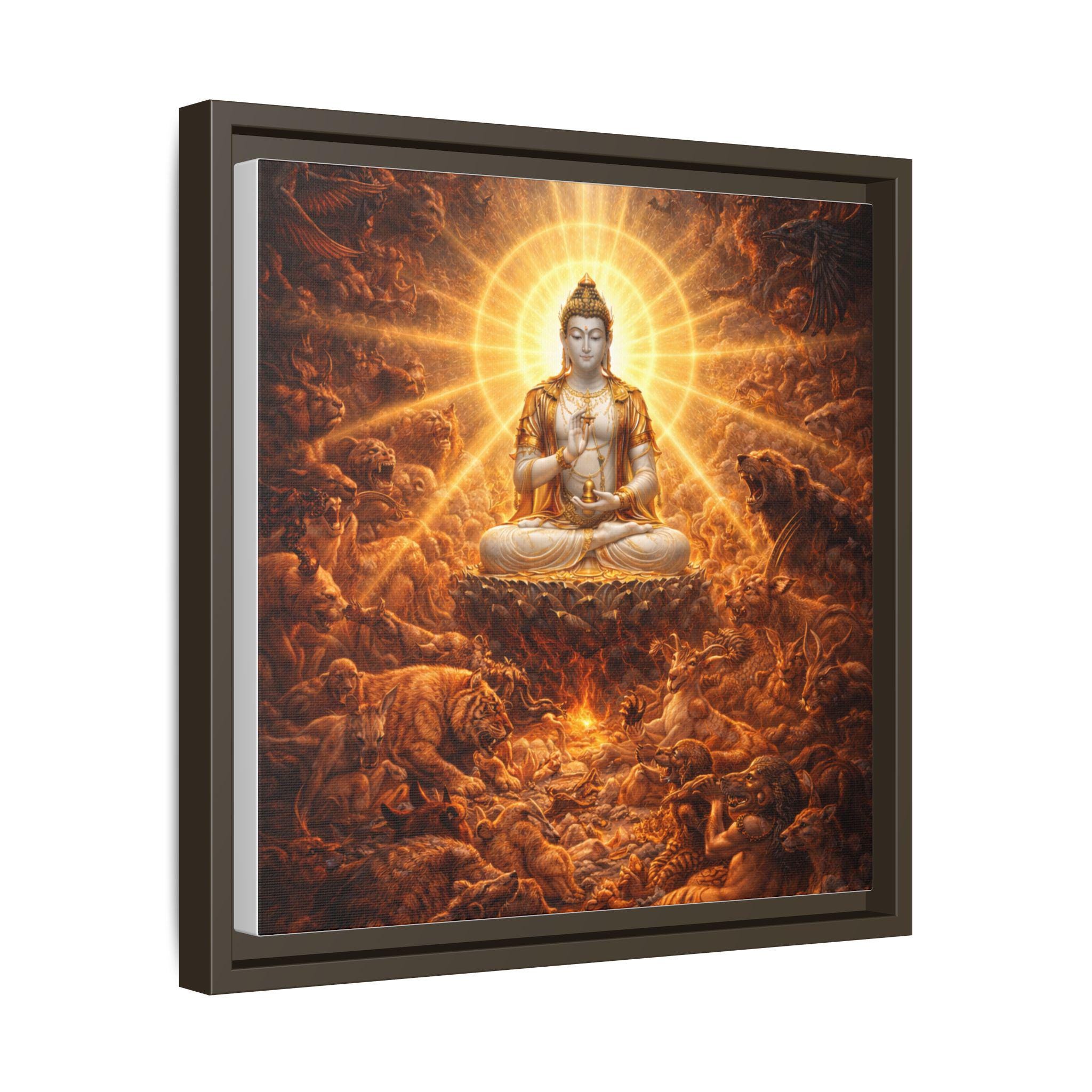 In the restless world of the Animal Realm, life is driven by fear, instinct, survival, and the endless pull of procreation. Claws, teeth, wings, and fur all move in a desperate rhythm — life chasing life, never stopping to question why. At the center of this wild intensity sits Vajrasattva Buddha, radiant and unmoving, shining compassion in every direction. His presence honors the innocence of these beings, reminding us that even in a realm ruled by instinct and fear, the light of awareness and boundless compassion is always here — steady, patient, and unconditionally loving.