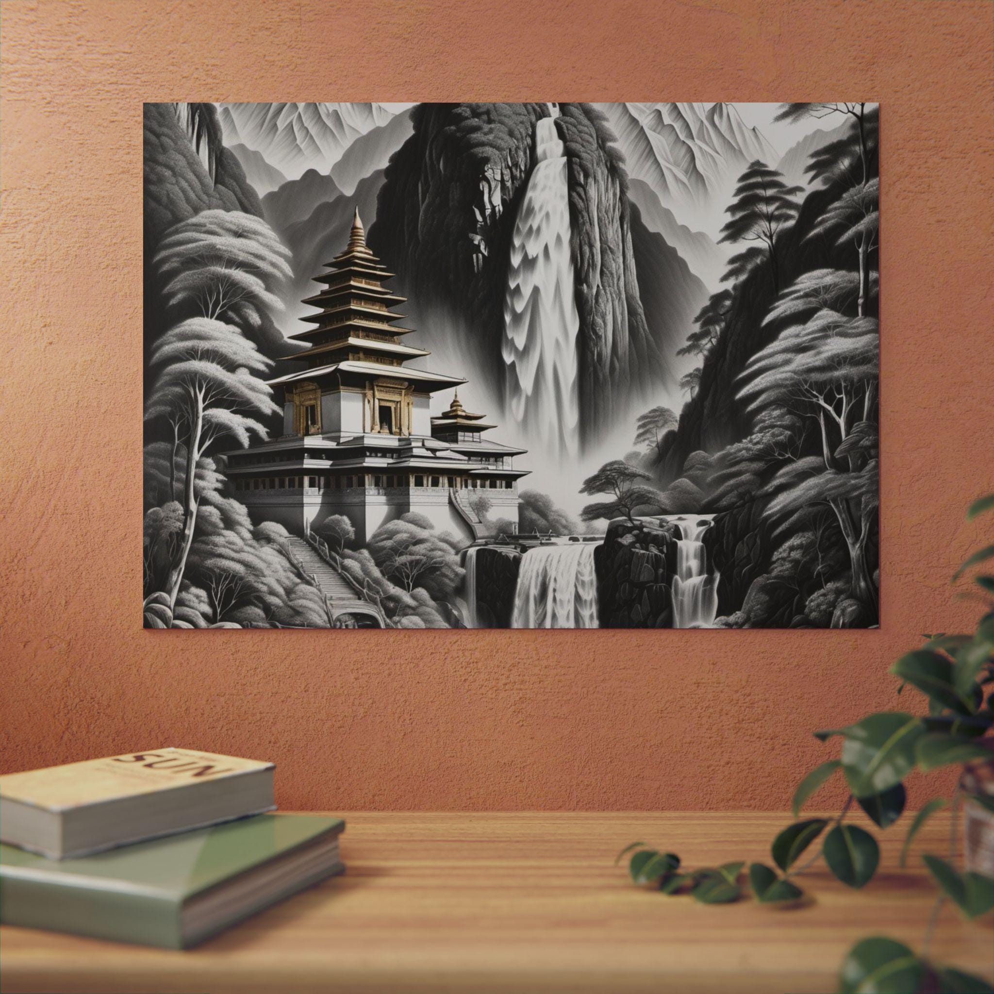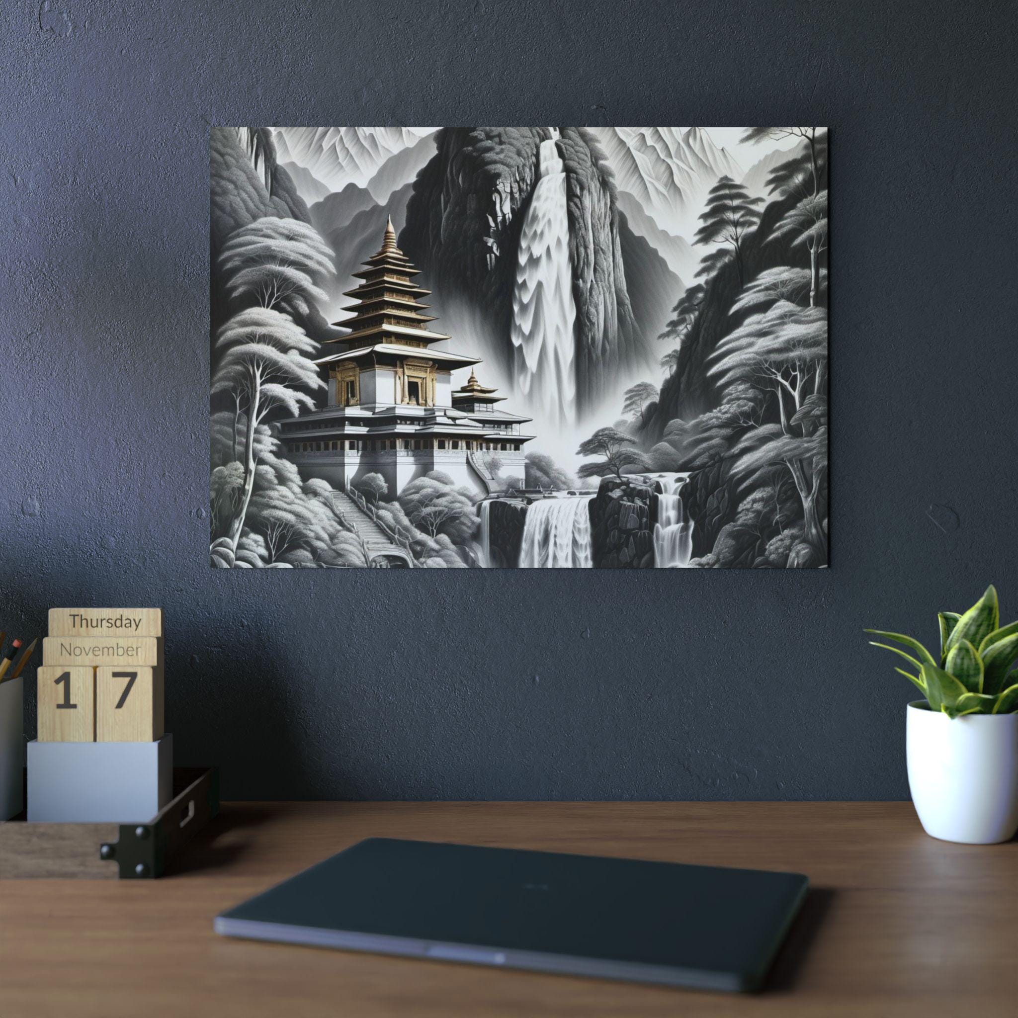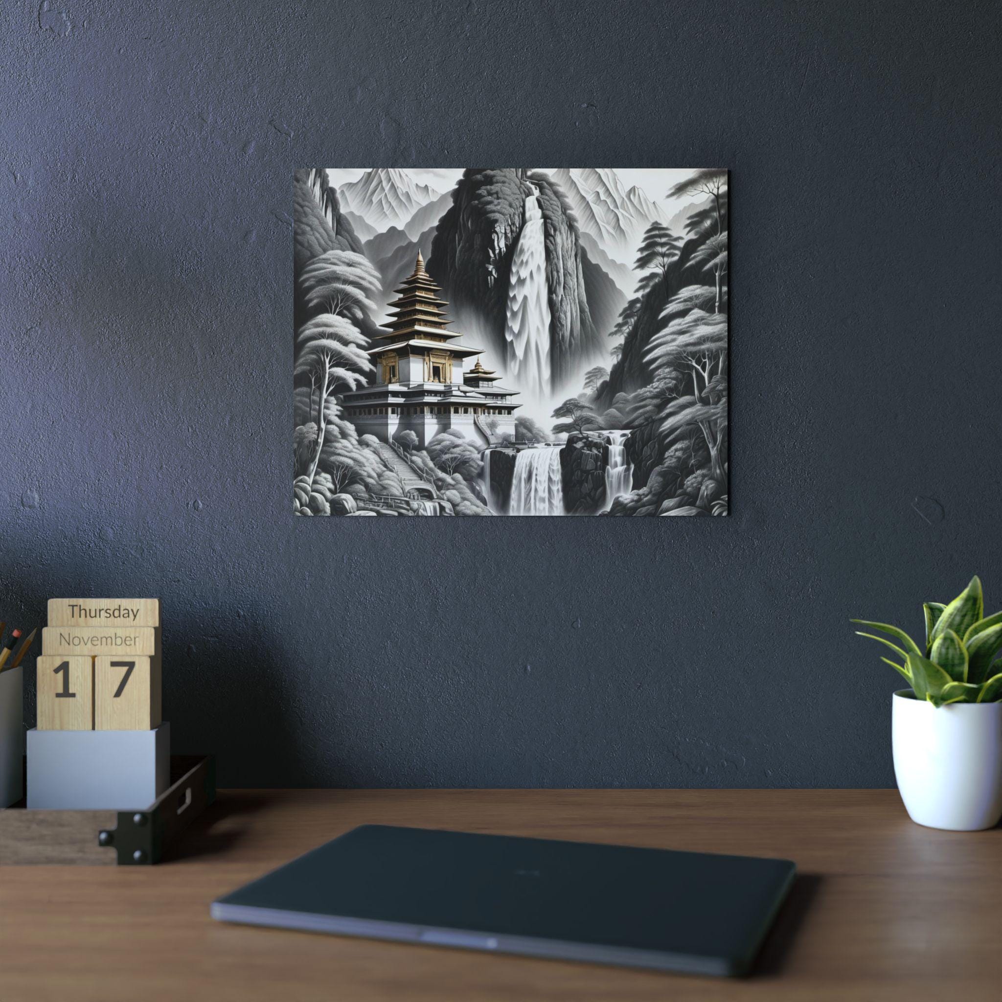 This lightweight aluminum panel brings a serene temple resting in the heart of a mist-washed mountain valley, embraced by cascading waterfalls and whispering trees. The quiet grace of the scene evokes spiritual purity — a realm untouched by grasping or striving, where nature and sacred architecture exist in effortless harmony. This artwork reflects the clarity that emerges when the mind becomes still: peaceful, luminous, and completely at home in the present moment.