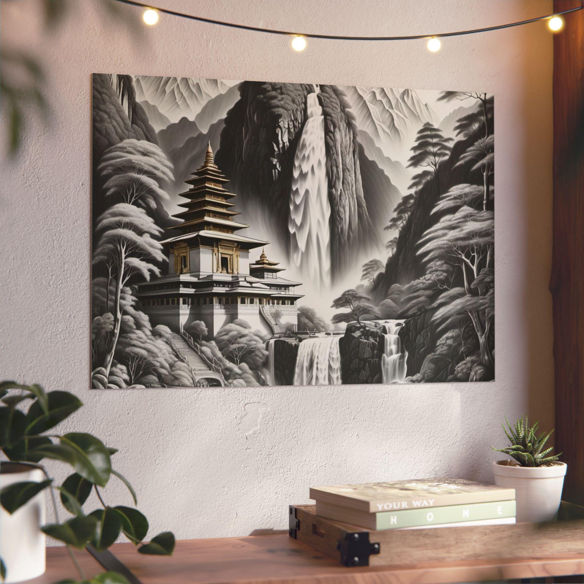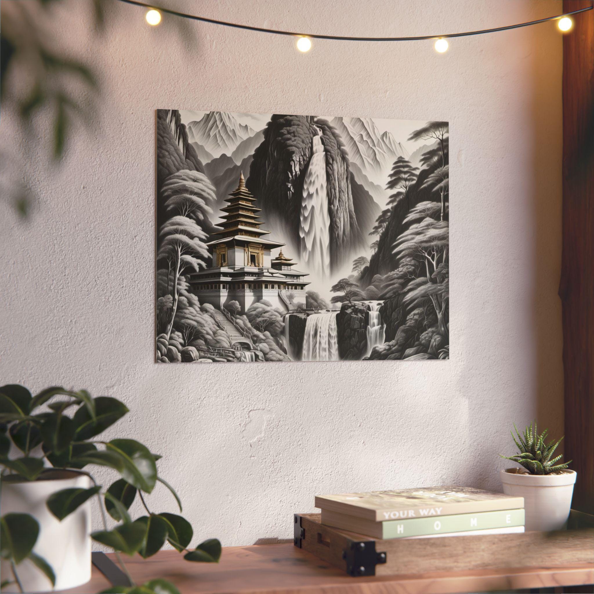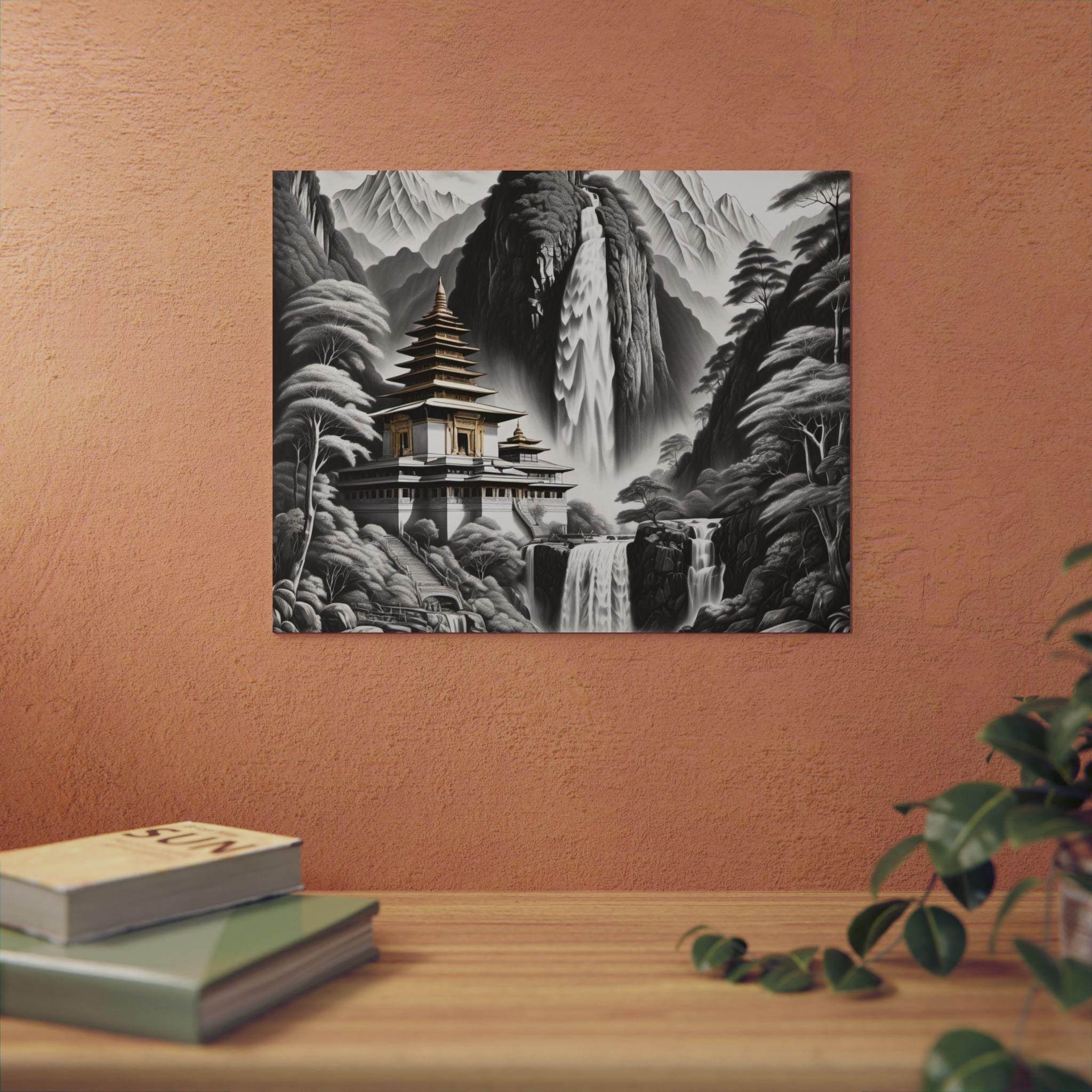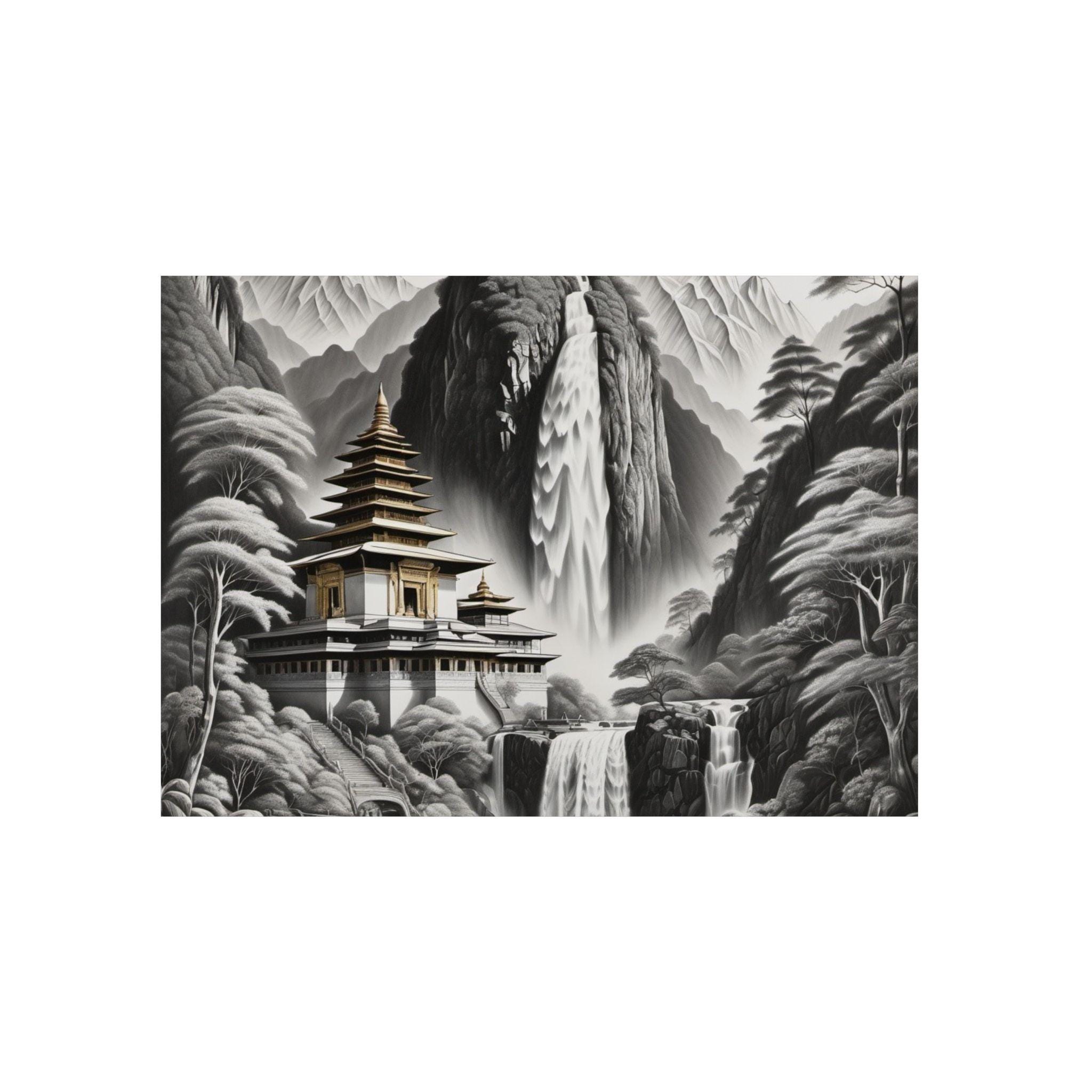 This lightweight aluminum panel brings a serene temple resting in the heart of a mist-washed mountain valley, embraced by cascading waterfalls and whispering trees. The quiet grace of the scene evokes spiritual purity — a realm untouched by grasping or striving, where nature and sacred architecture exist in effortless harmony. This artwork reflects the clarity that emerges when the mind becomes still: peaceful, luminous, and completely at home in the present moment.
