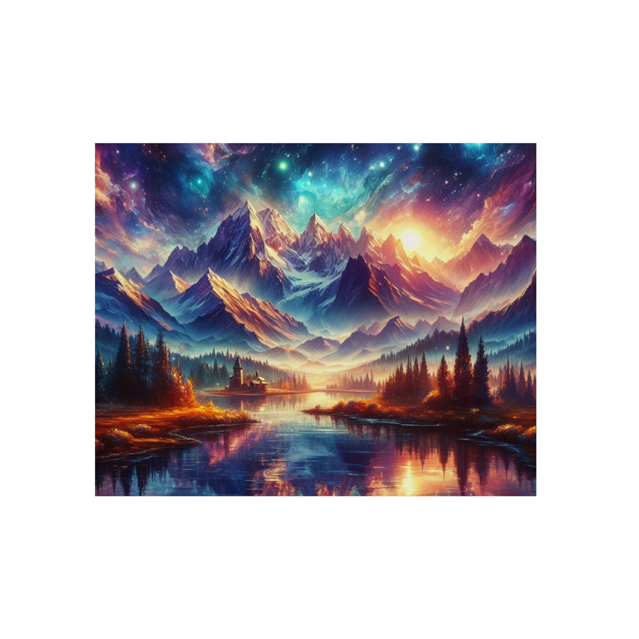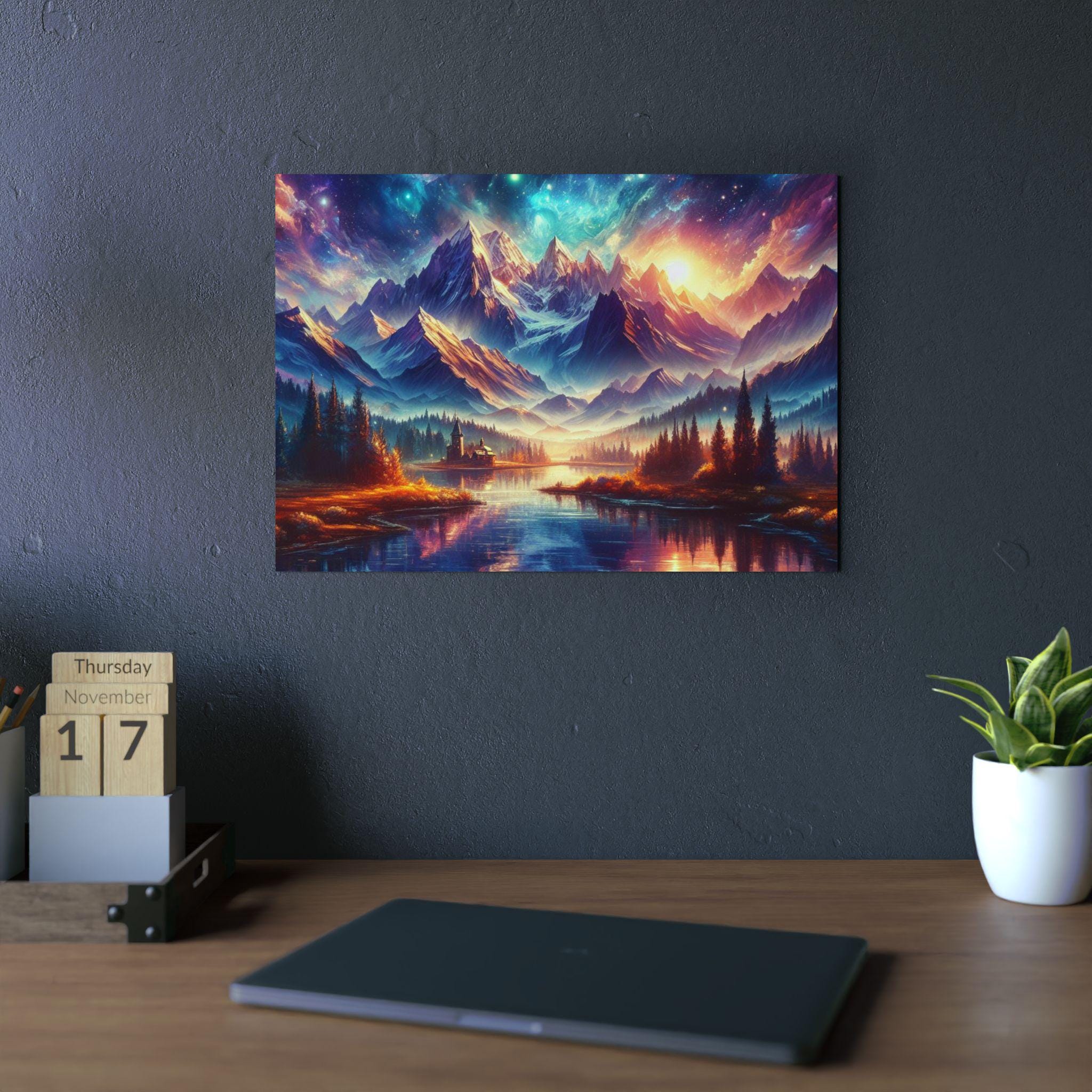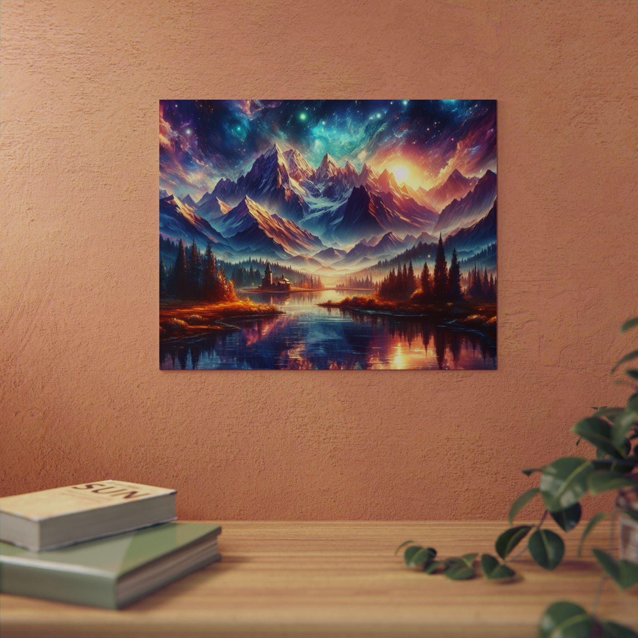 This lightweight aluminum panel brings a radiant mountain kingdom rising beneath a cosmic sky alive with swirling stars and nebula-lit color. Snow-capped peaks glow in the light of a new dawn, reflecting upon crystal-clear waters that wind gently through the valley below. Nestled at the water’s edge, a lone architectural sanctuary stands in quiet harmony with the surrounding forest — a reminder that human creation can rest gracefully within the majesty of the natural world. This image celebrates the meeting of Earth and Cosmos, stillness and wonder, structure and infinite wild beauty.