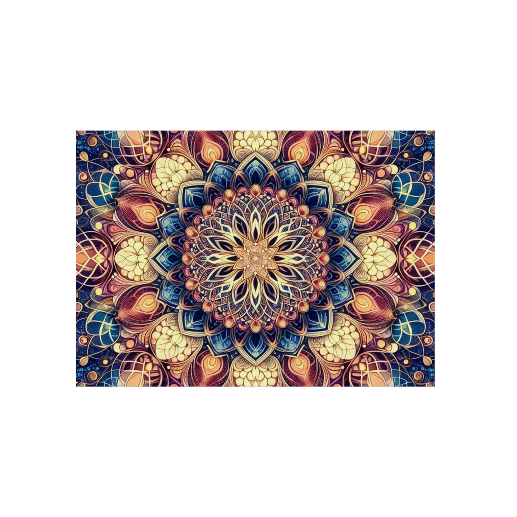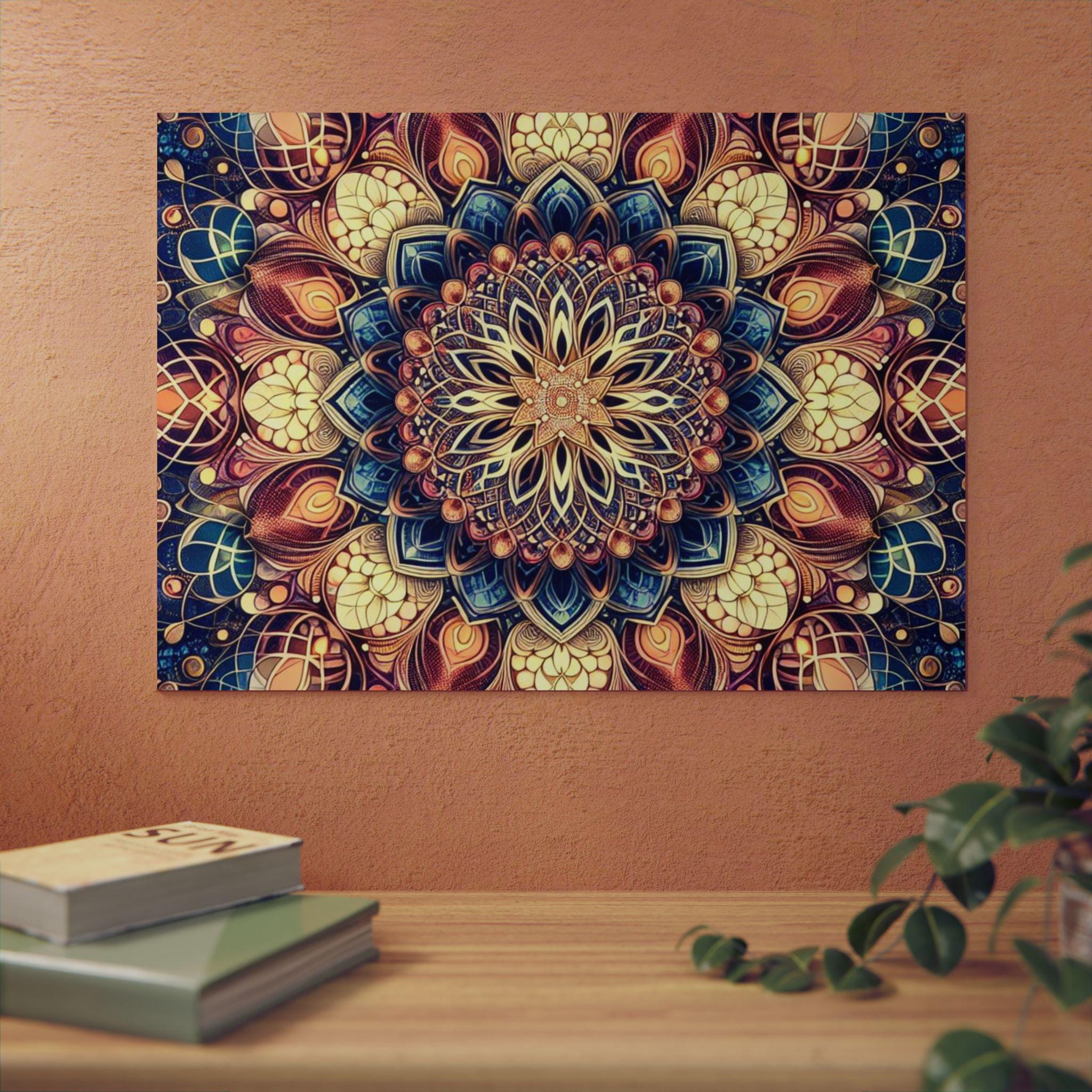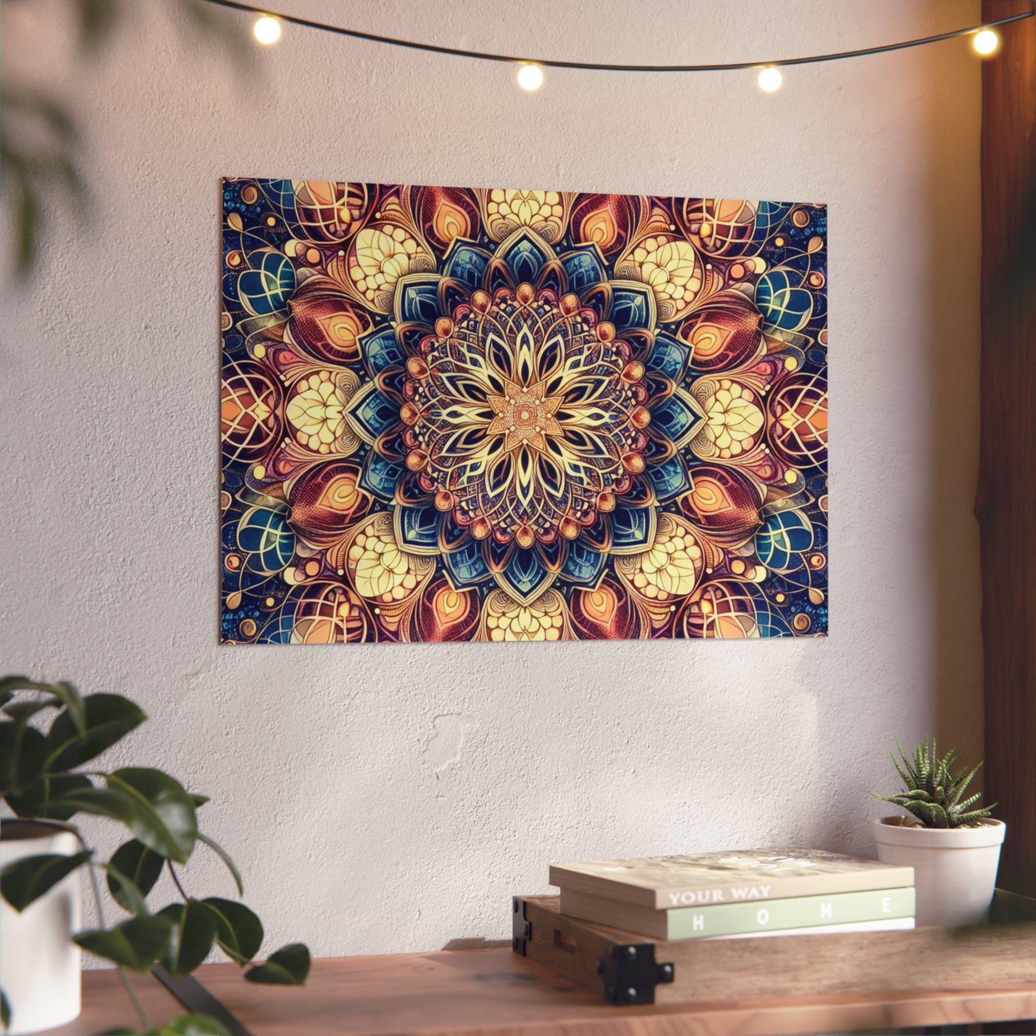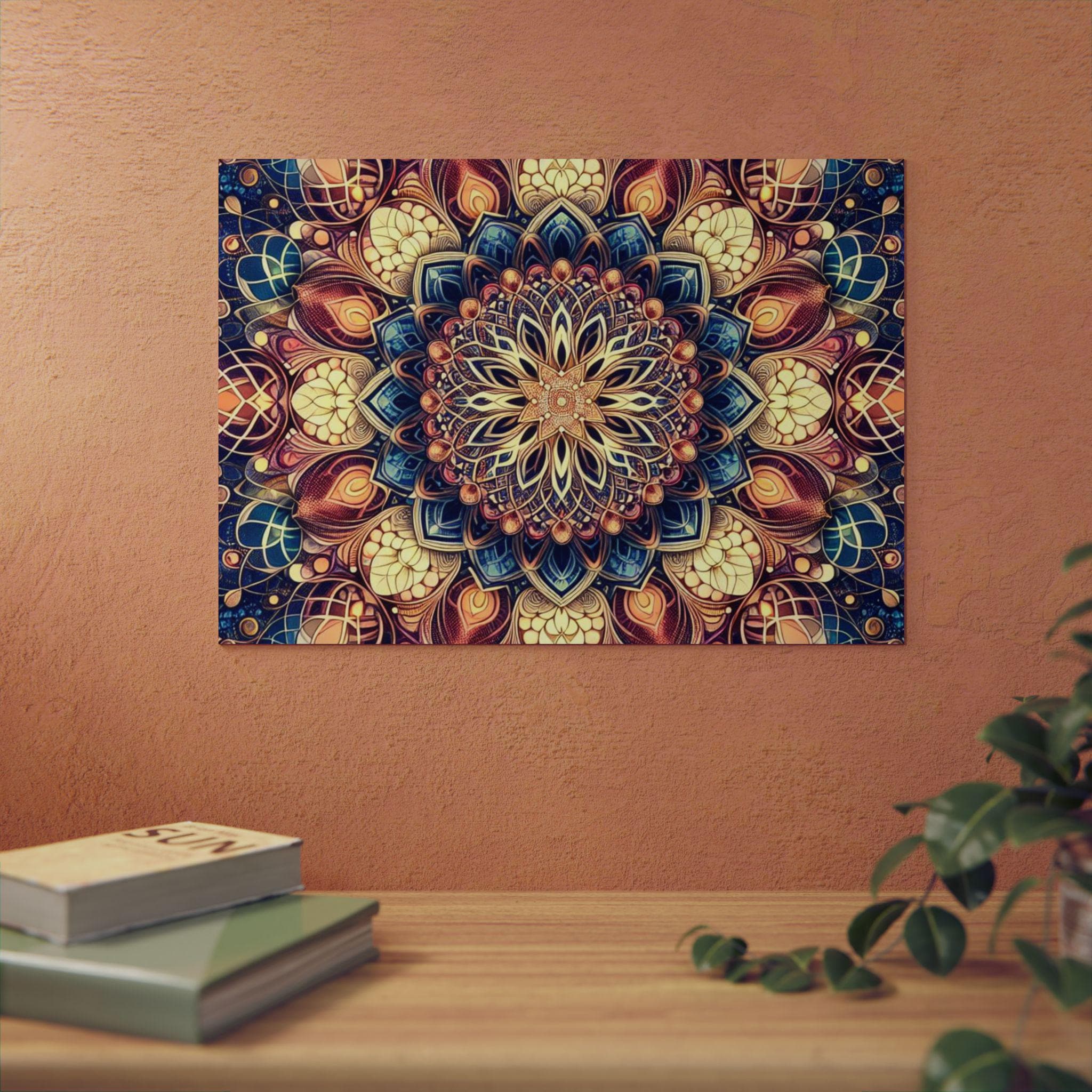This lightweight aluminum panel brings an intricate mandala blooming from the heart of sacred geometry, unfolding like the timeless Flower of Life. Layer upon layer of radiant patterns interweave in perfect symmetry, symbolizing the unity of all creation — seen and unseen. Warm golds, deep blues, and soft cosmic hues dance together, reflecting the balance between spirit and matter, form and mystery. Each petal becomes a doorway into stillness, reminding us that life itself is an endlessly blooming design woven from light, love, and universal intelligence.