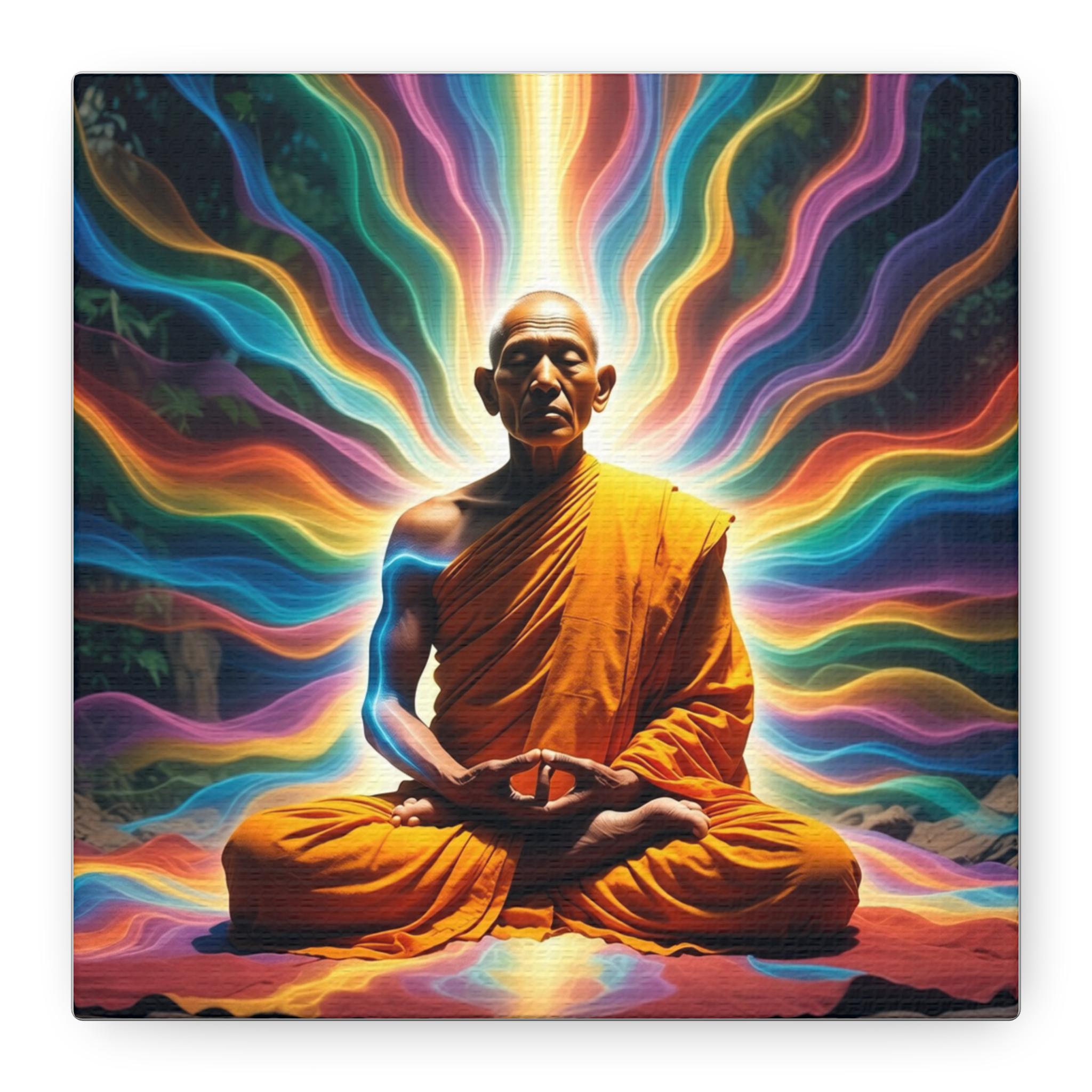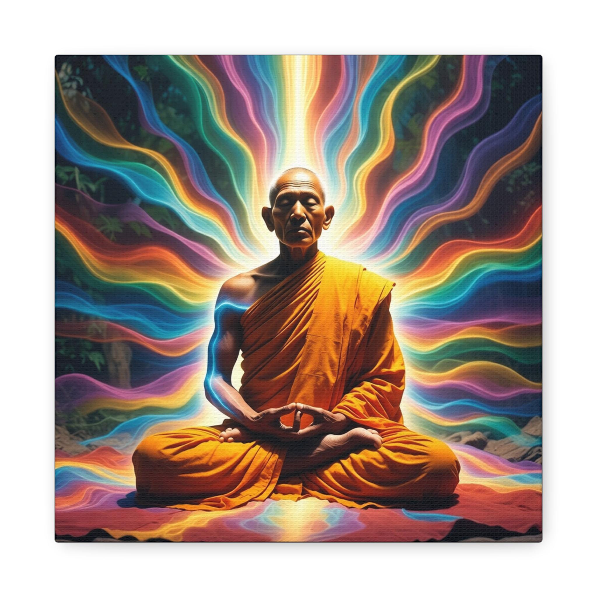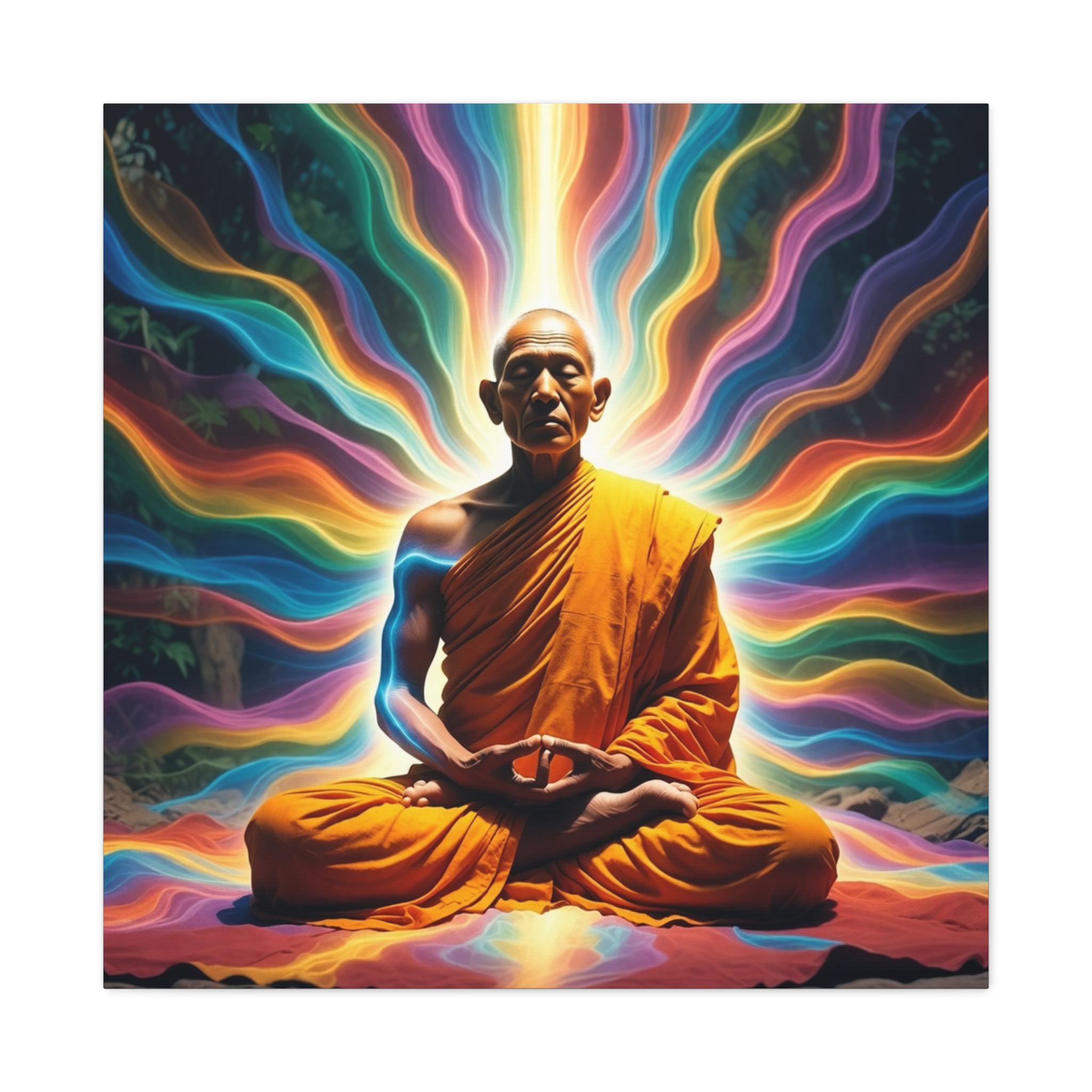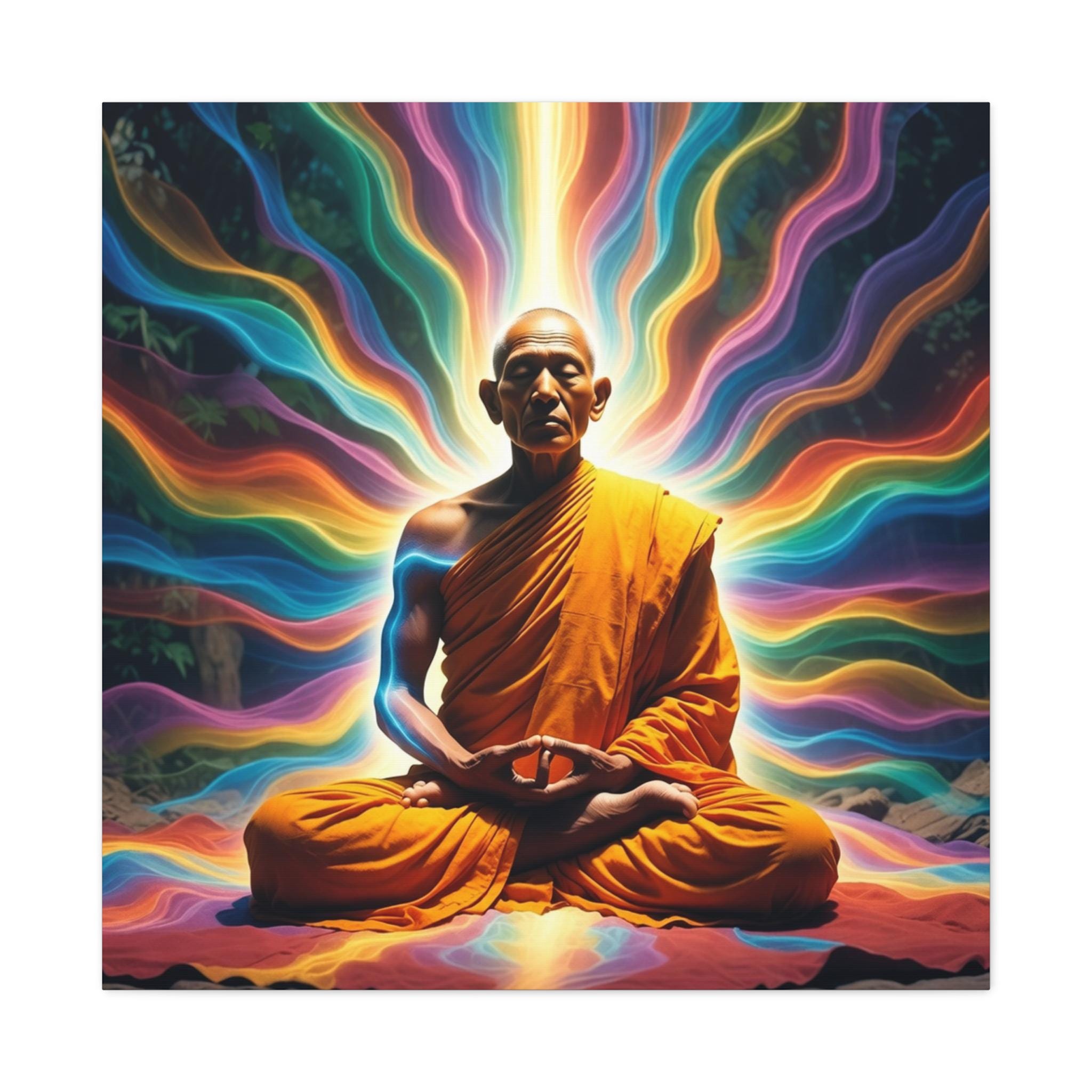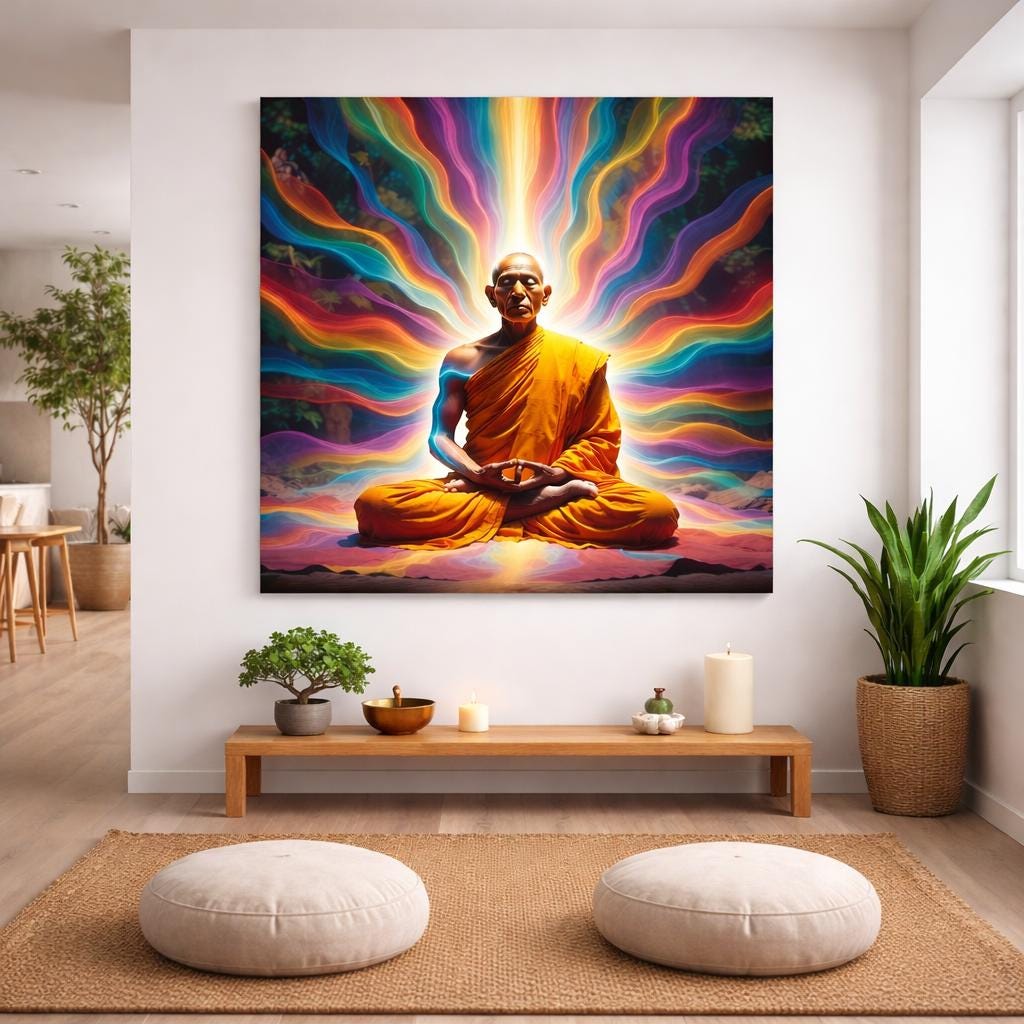 A matte, stretched canvas print that brings a tender, cinematic moment to your walls. This luminous artwork portrays the mystical Rainbow Body, a profound realization described in Tibetan Dzogchen Buddhism. In this state of complete awakening, the practitioner’s physical form dissolves into radiant light, revealing the true nature of mind—pure awareness itself.